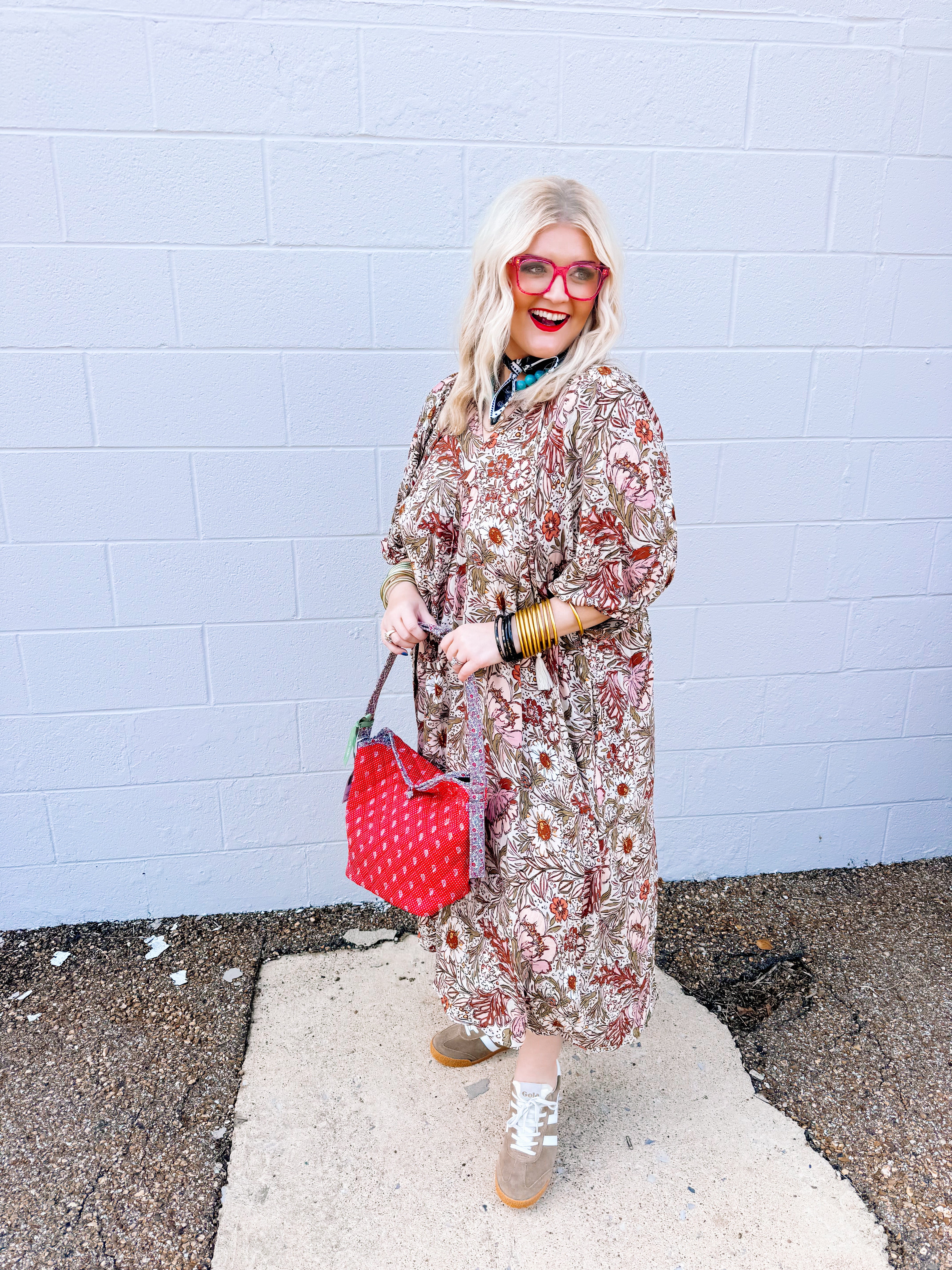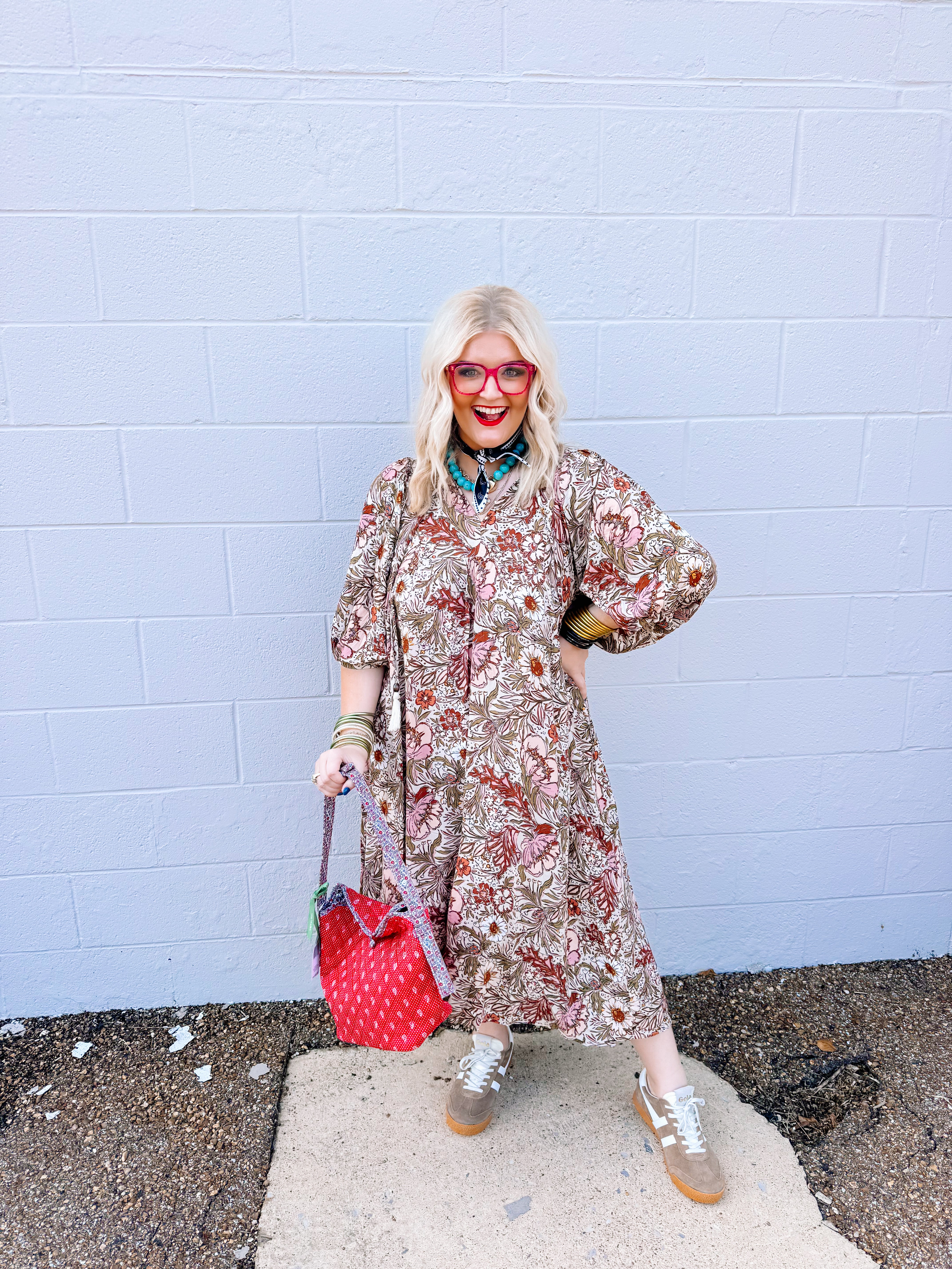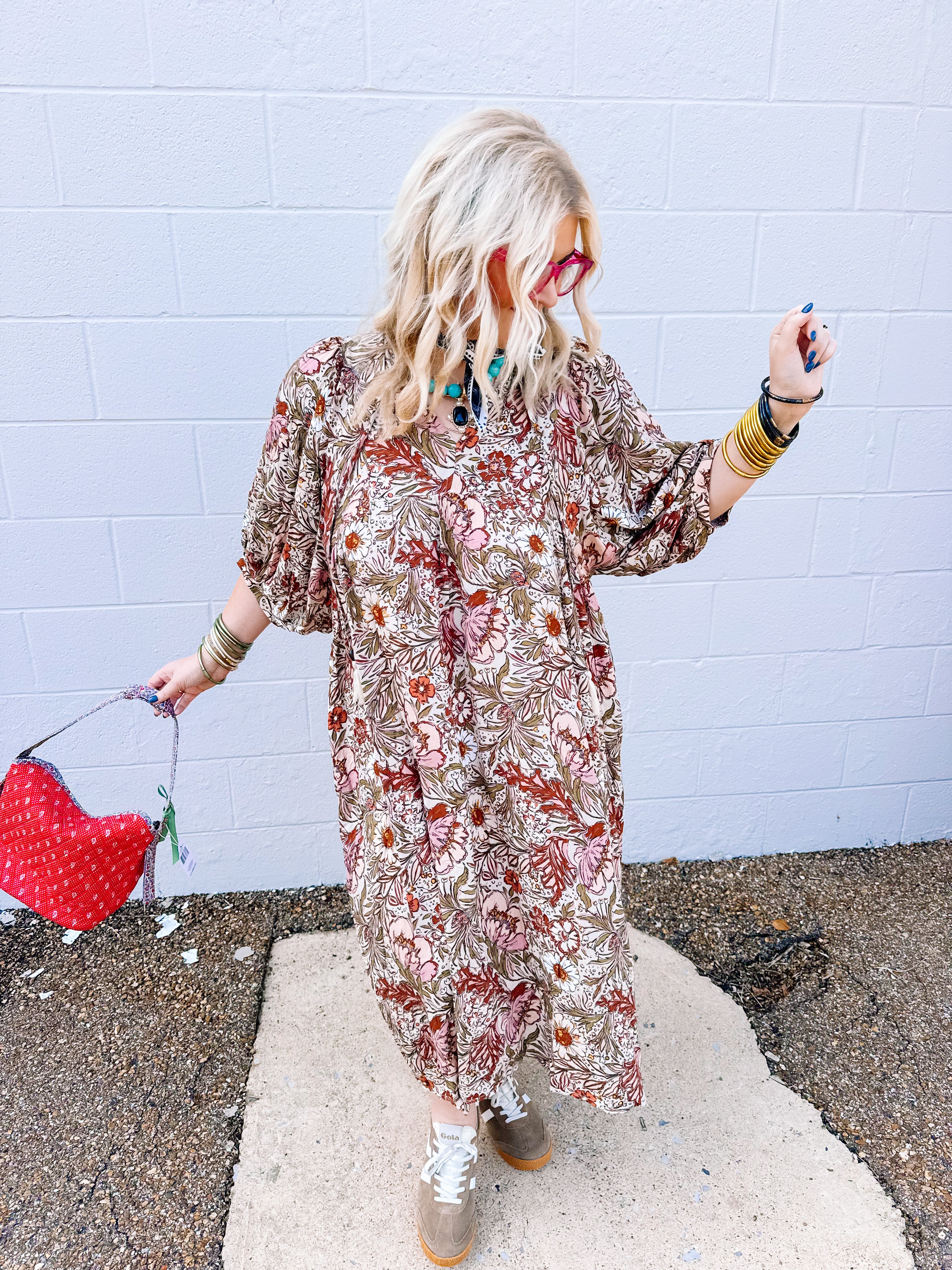 The Oddi Beige Floral Maxi Dress blends bohemian charm with elegant details. Crafted in a soft beige multi floral print, it features a tassel tie neckline and gathered sleeves that add subtle texture and movement. This maxi dress offers a relaxed yet refined silhouette, ideal for warm-weather occasions where effortless style and comfort are essential.