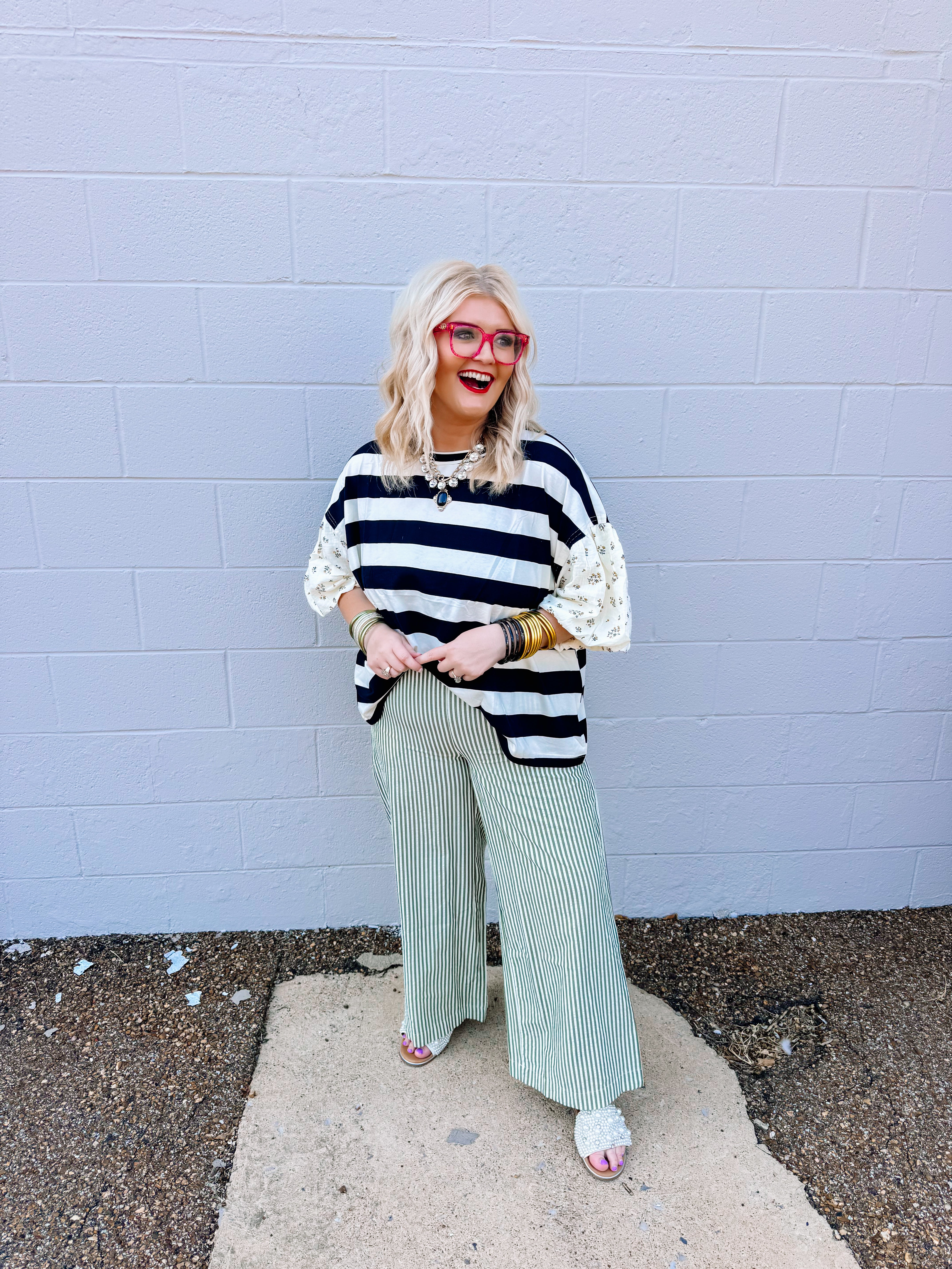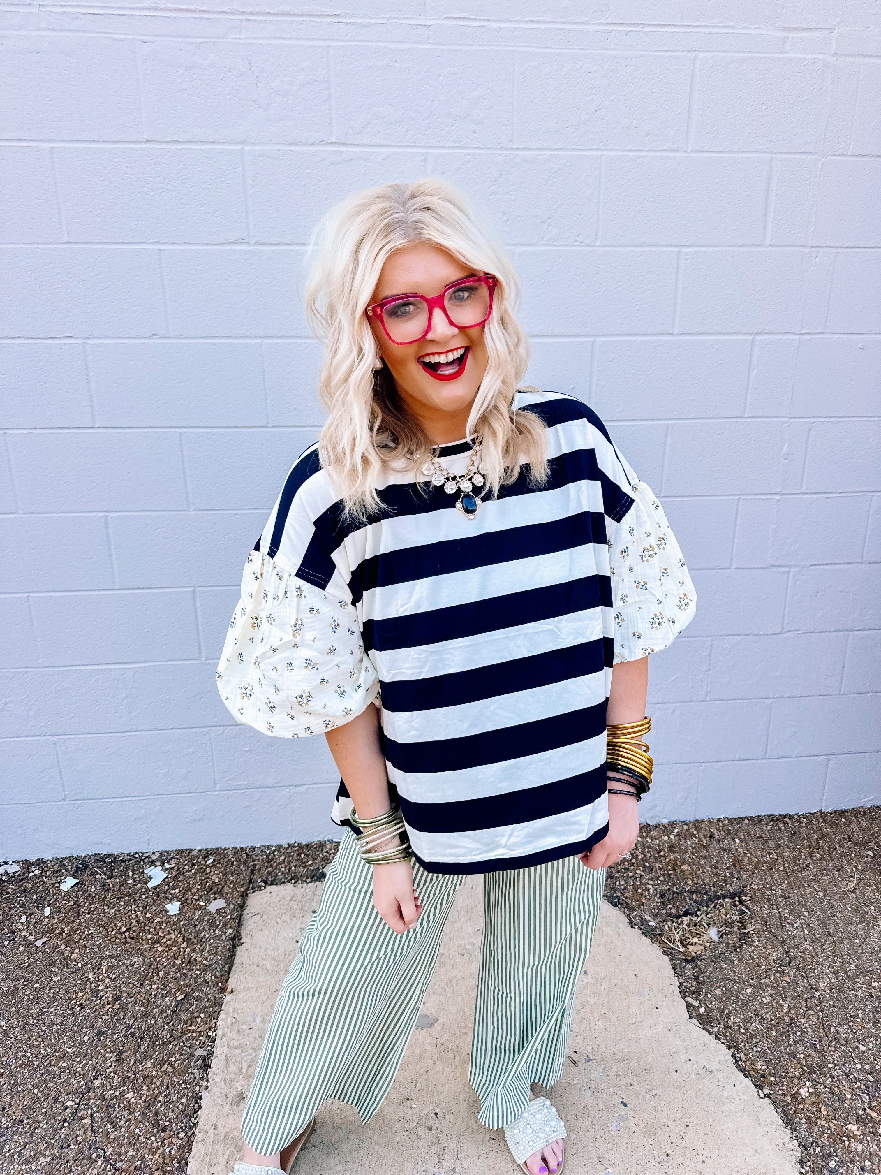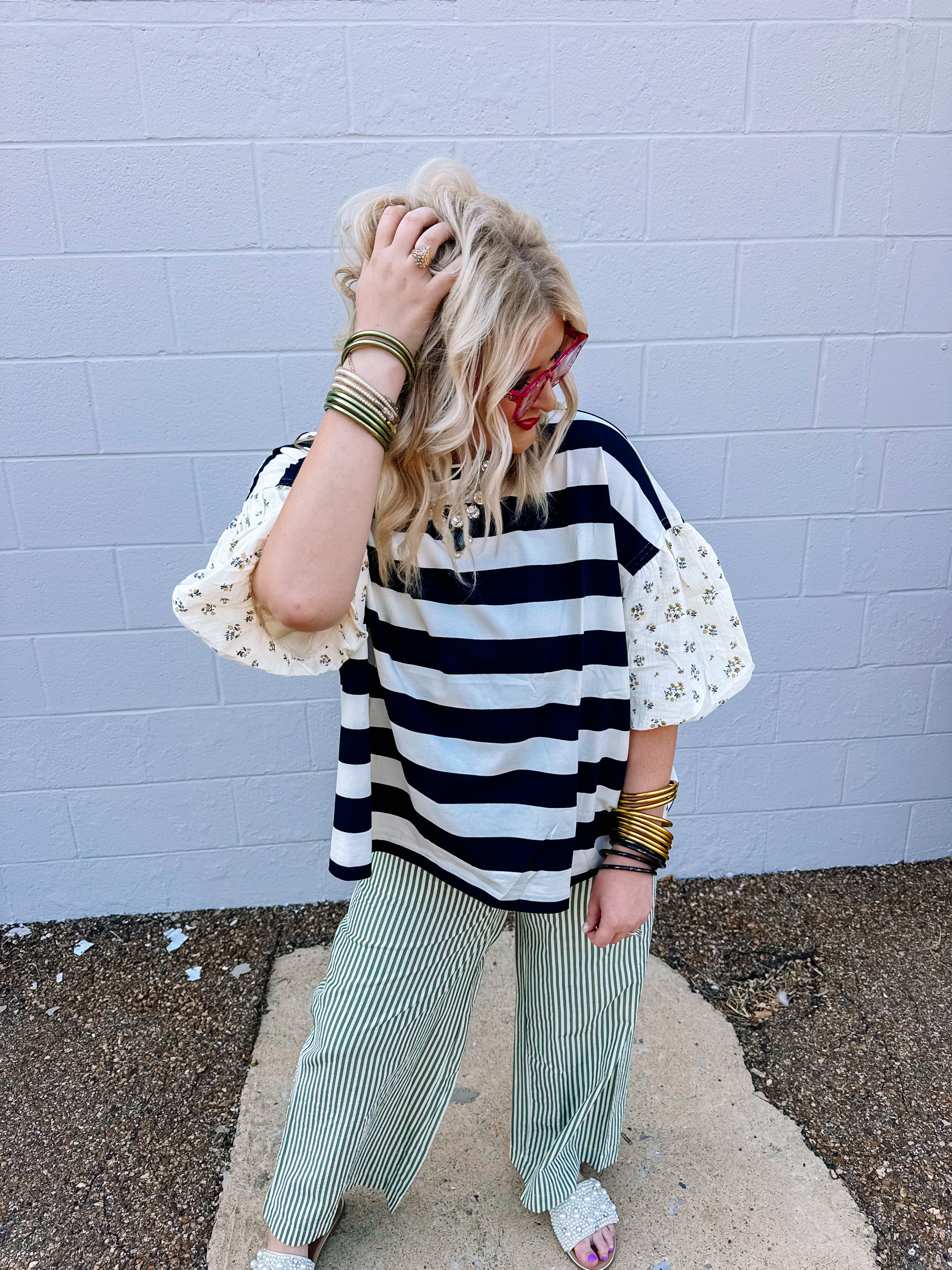 The Oddi Black/Ivory Striped Top combines a striking knit design with sophisticated details. Featuring bold black and ivory stripes, it is accented by contrast floral puff sleeves that add a touch of elegance and femininity. The solid ribbed neckline provides a polished finish while ensuring comfort and structure. This top blends classic patterns with distinctive textures, making it a refined choice for elevating both casual and dressier outfits.