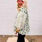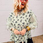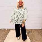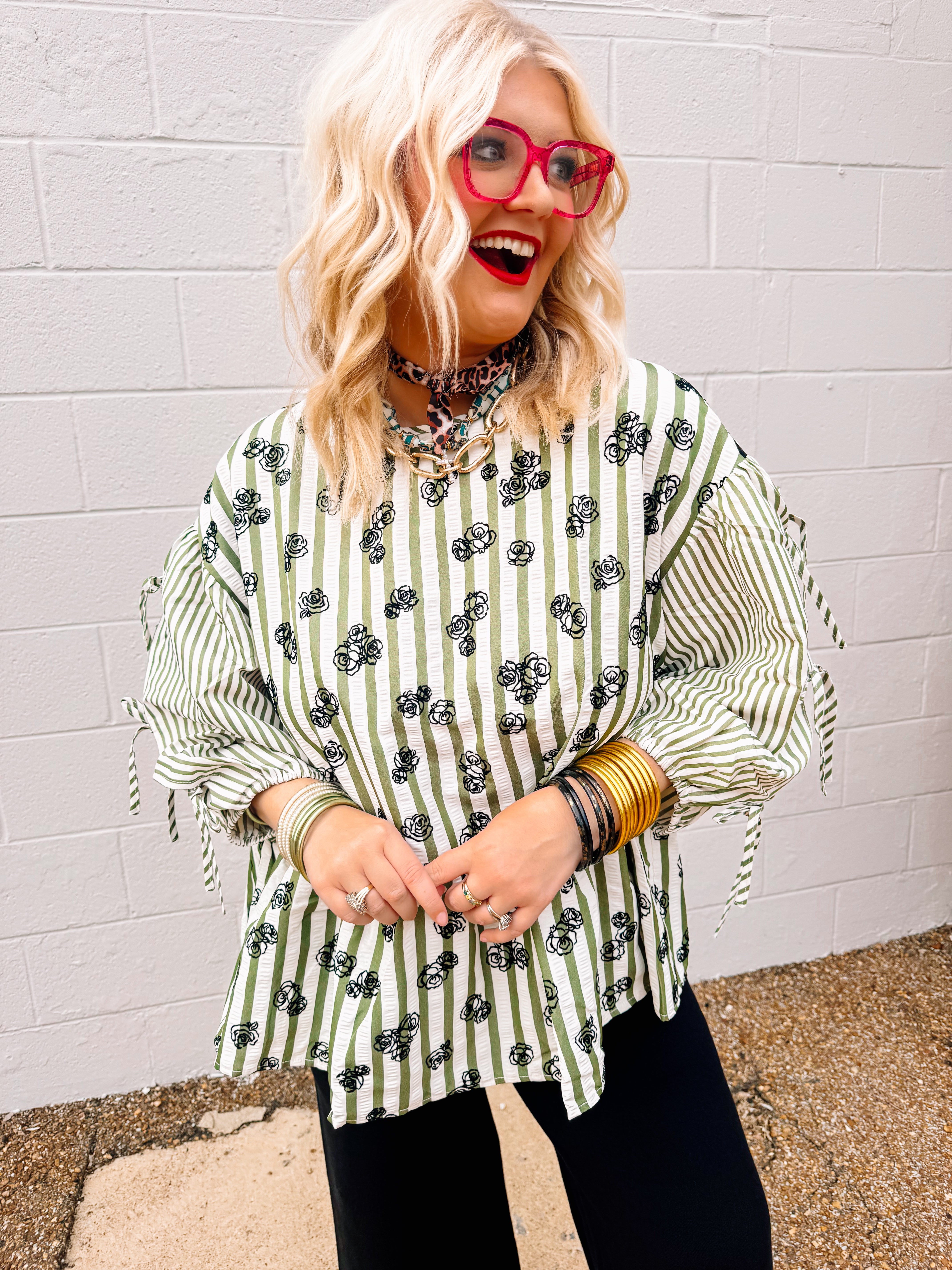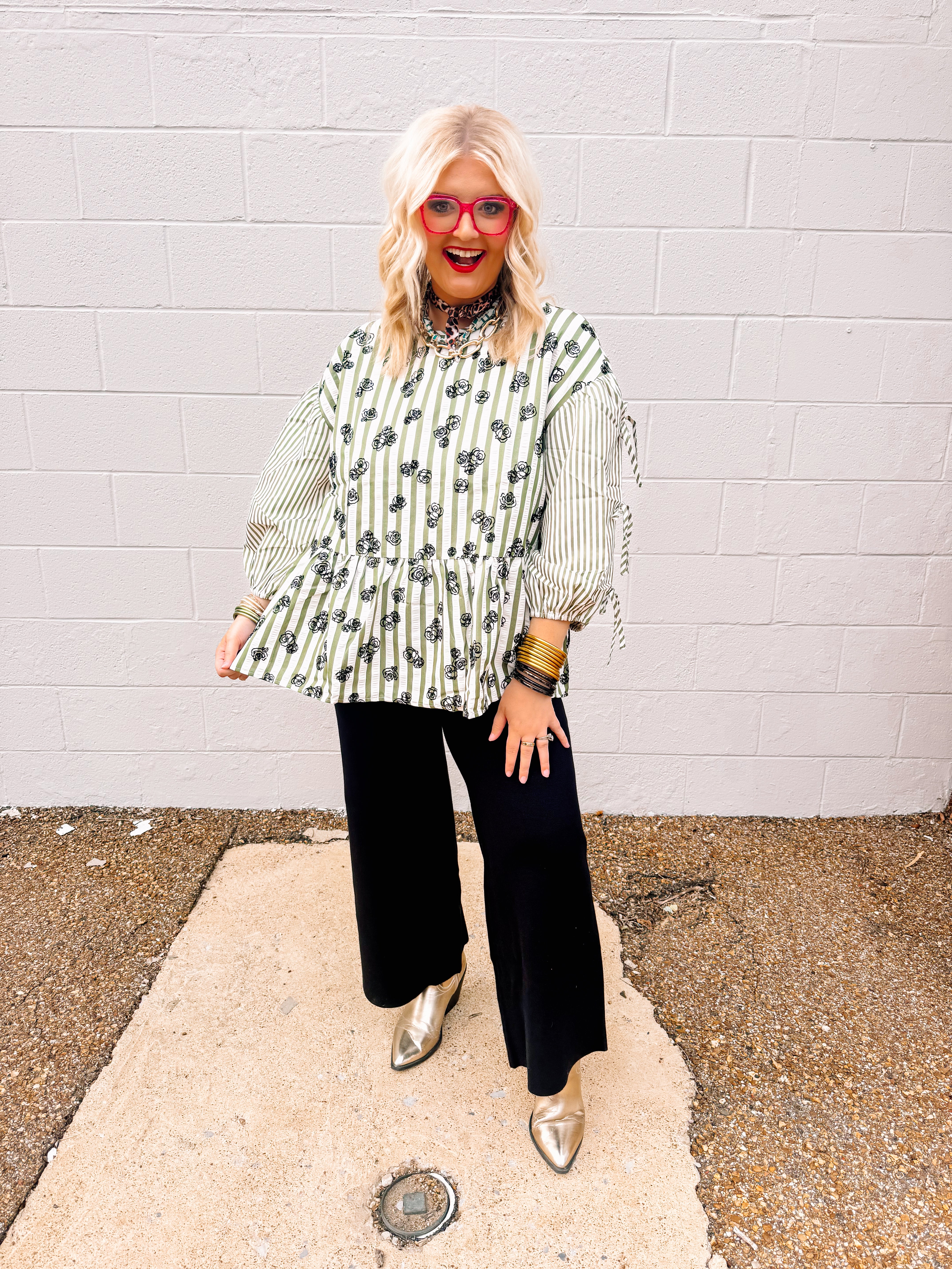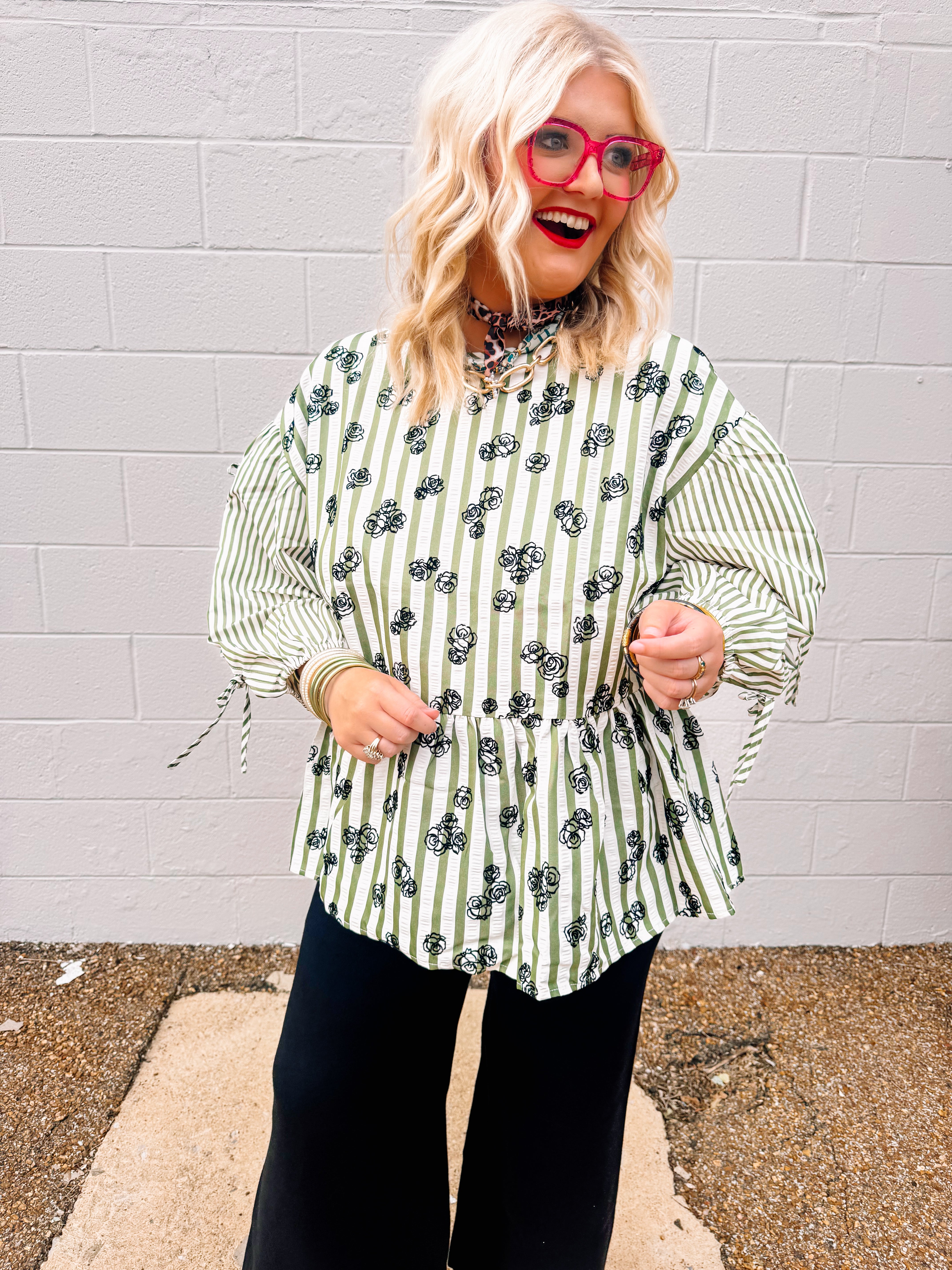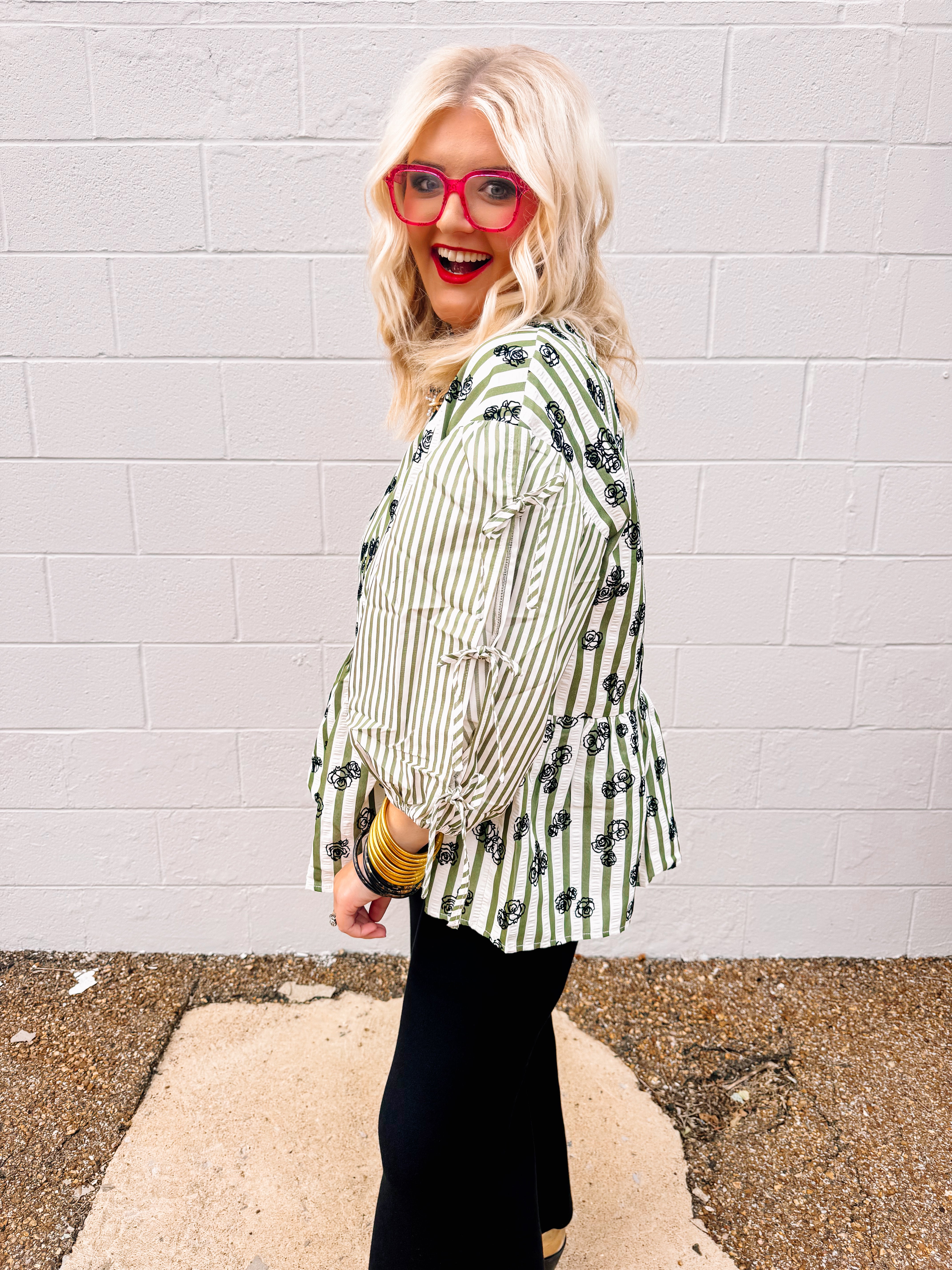 The Oddi Olive Martini Top features an oversized silhouette with a flocked floral print that adds texture and elegance. Striped details enhance the peplum design, creating a flattering shape at the waist. Three-quarter sleeves with tie accents offer a stylish and adjustable fit, perfect for elevating your casual or office wardrobe with a sophisticated yet comfortable look.