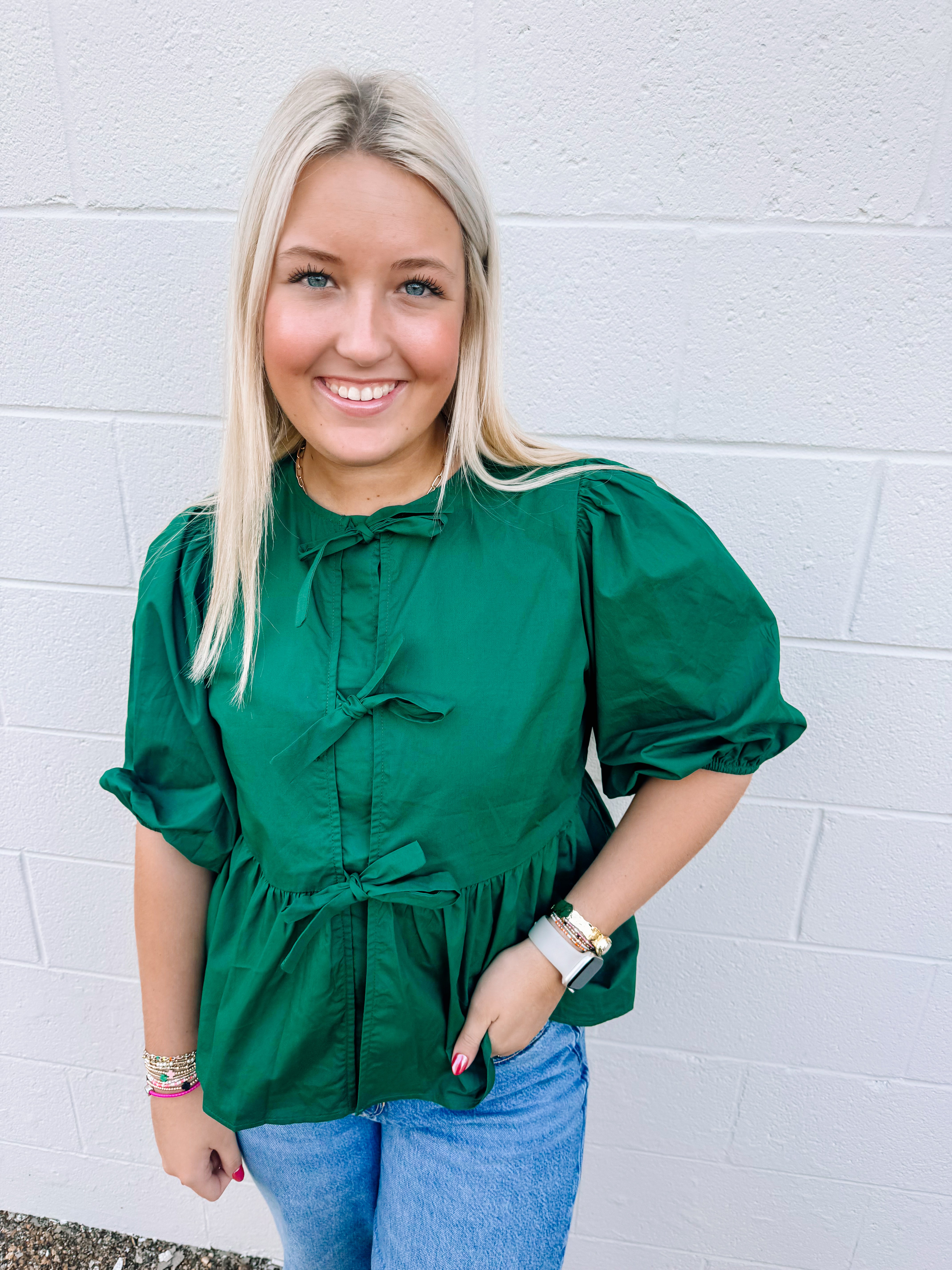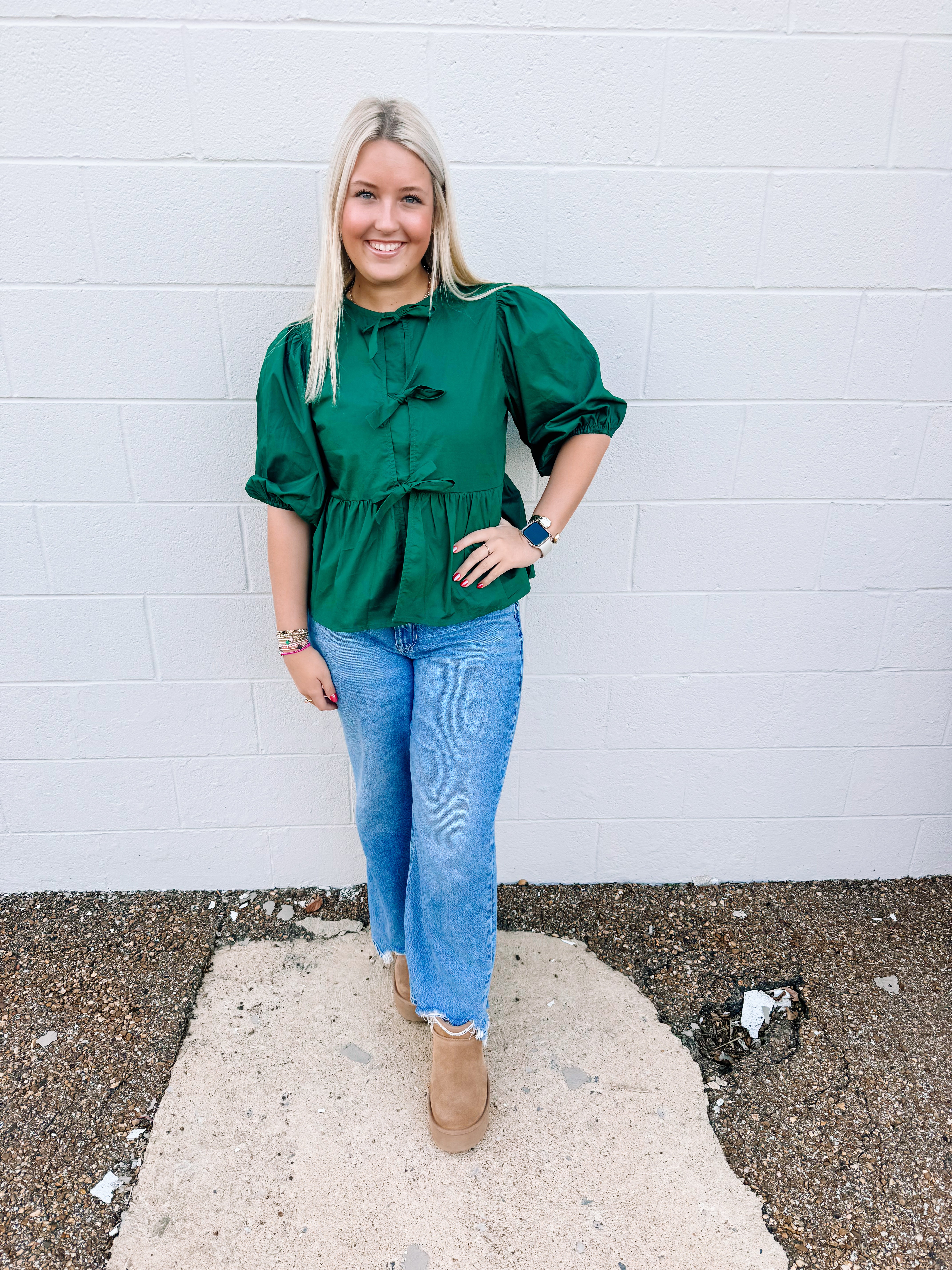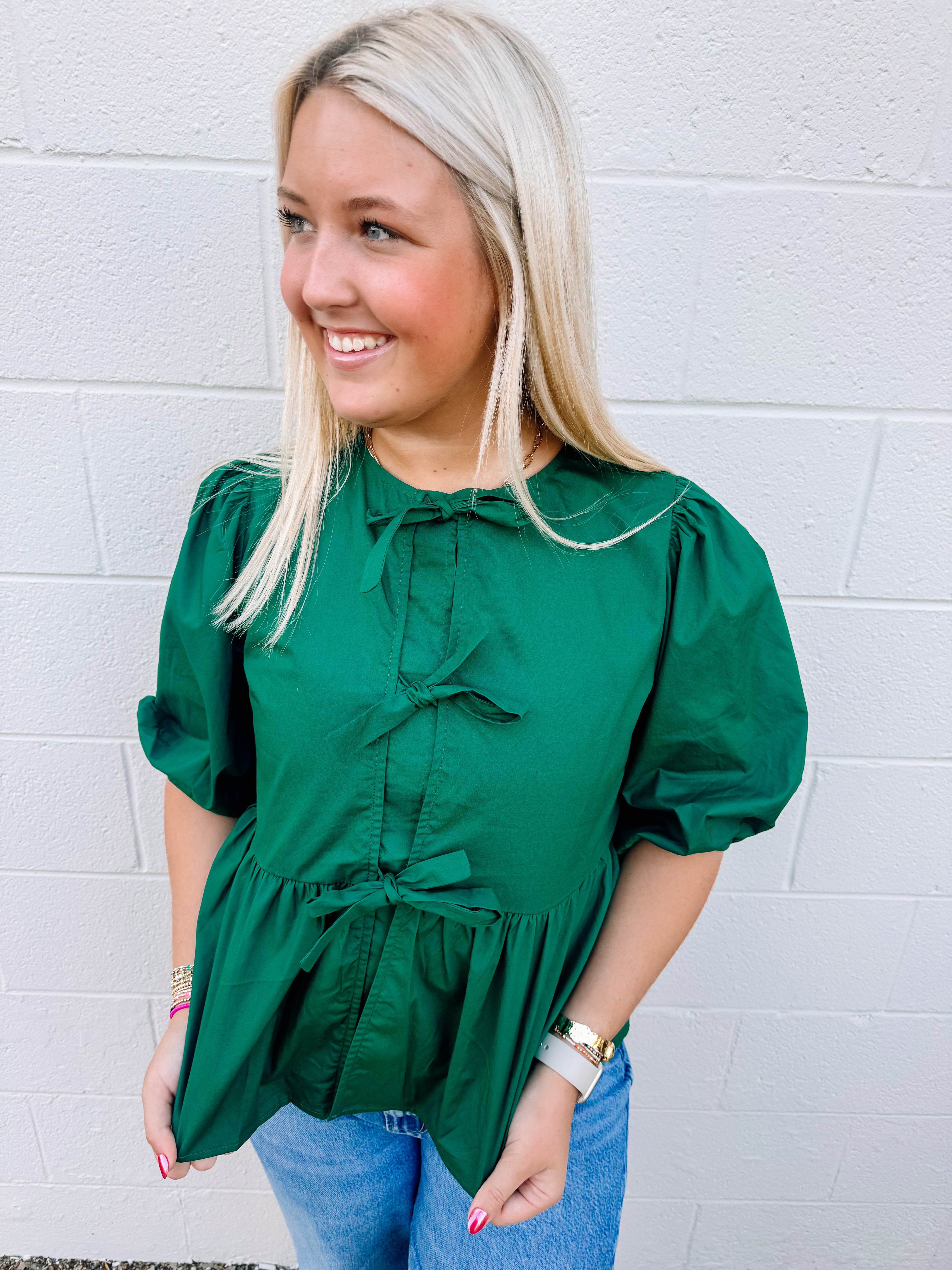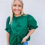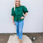 Button + Bows Top in Hunter Green