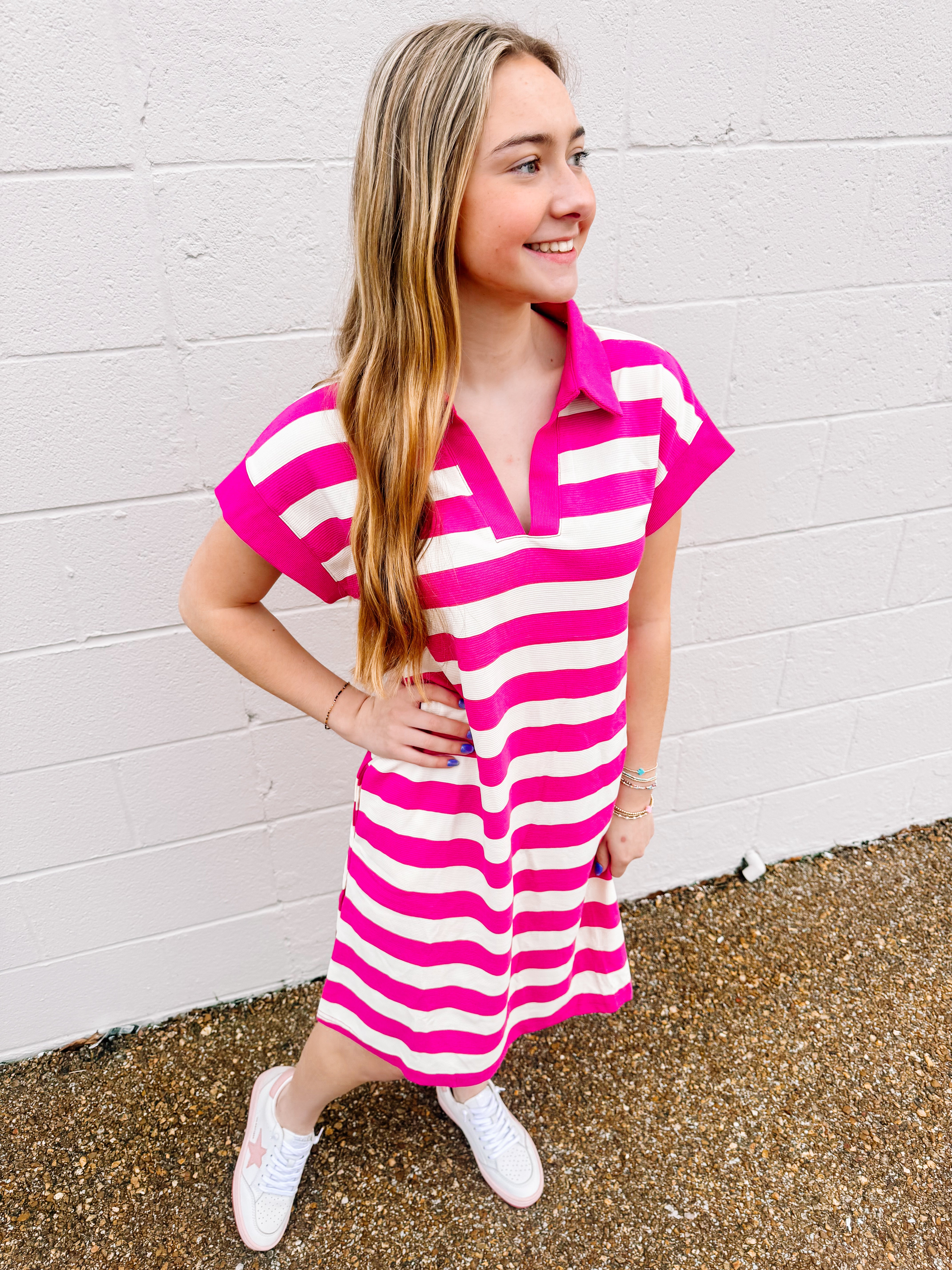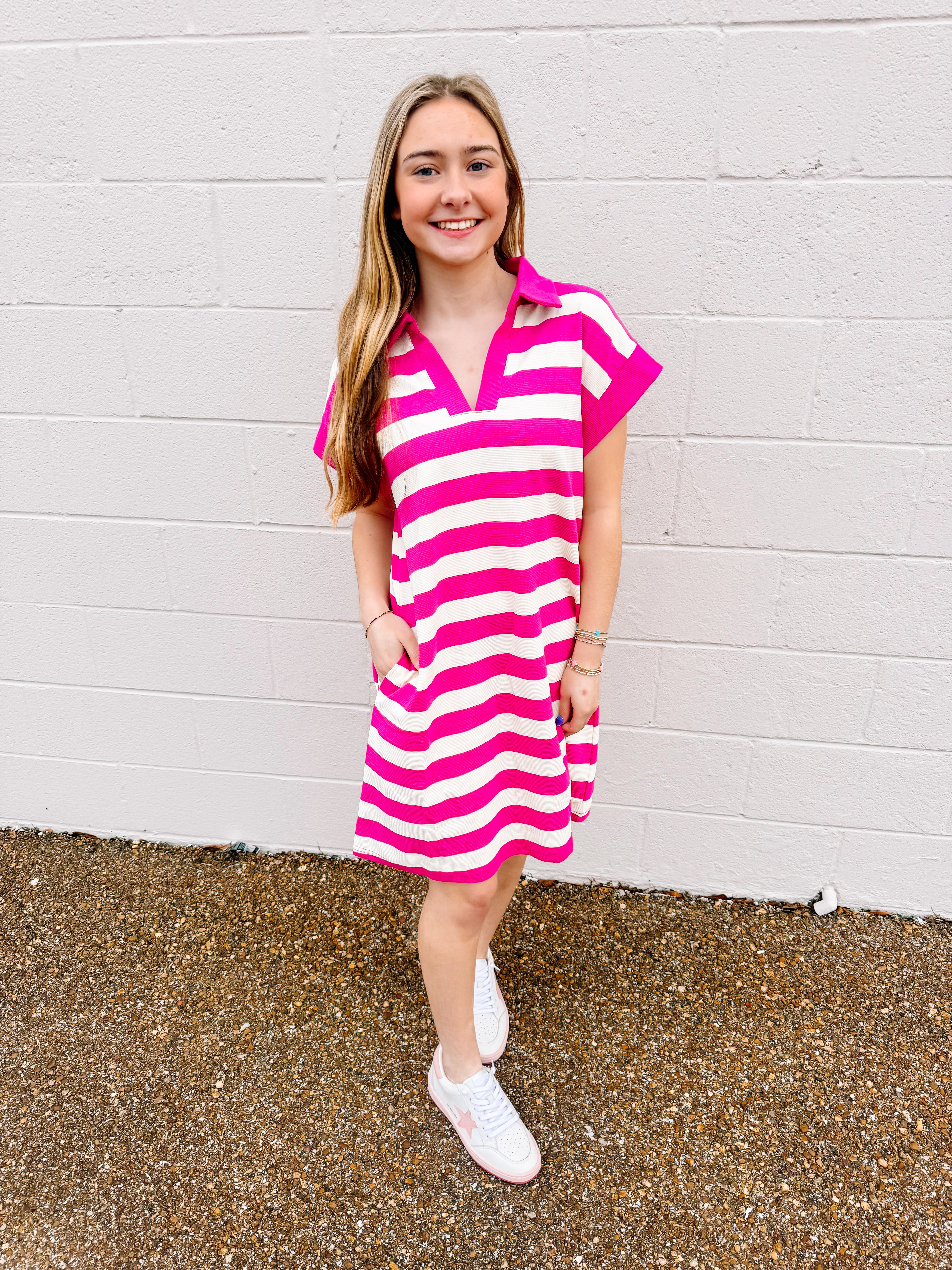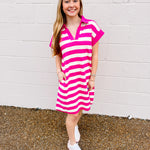 Introducing the Miami Striped Dress! This beautiful, collared shift dress is very stylish for the upcoming spring and summer season. It's beautiful fuchsia and white combo is perfect for any occasion. It can be dressed up or down.