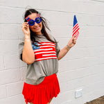 Show your patriotism with this Oddi Top! This red french terry short sleeve pullover with USA applique flag patch is cute for all of the patriotic holidays. This shirt is a must for the summer holidays.