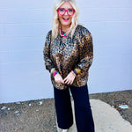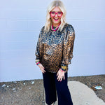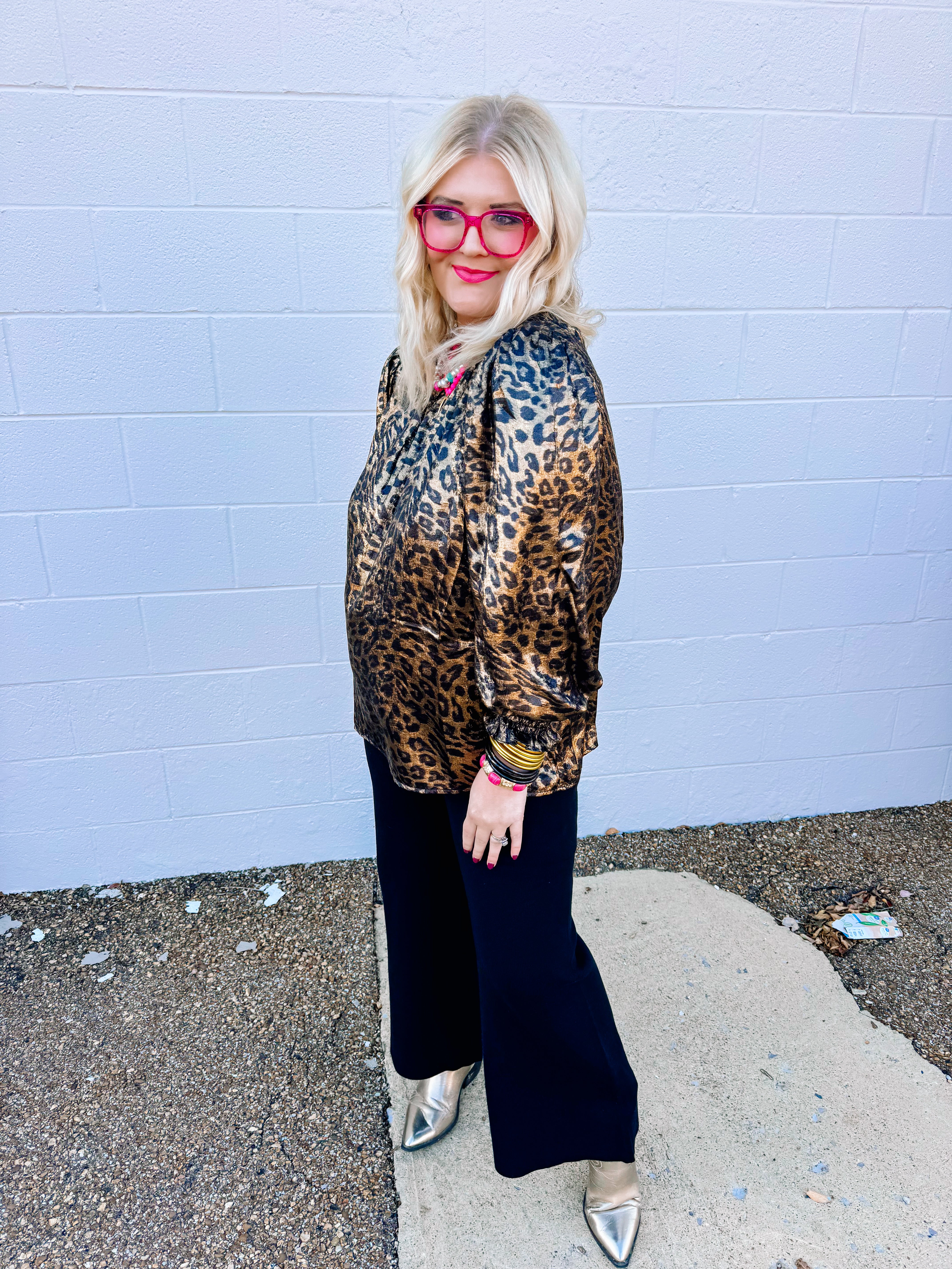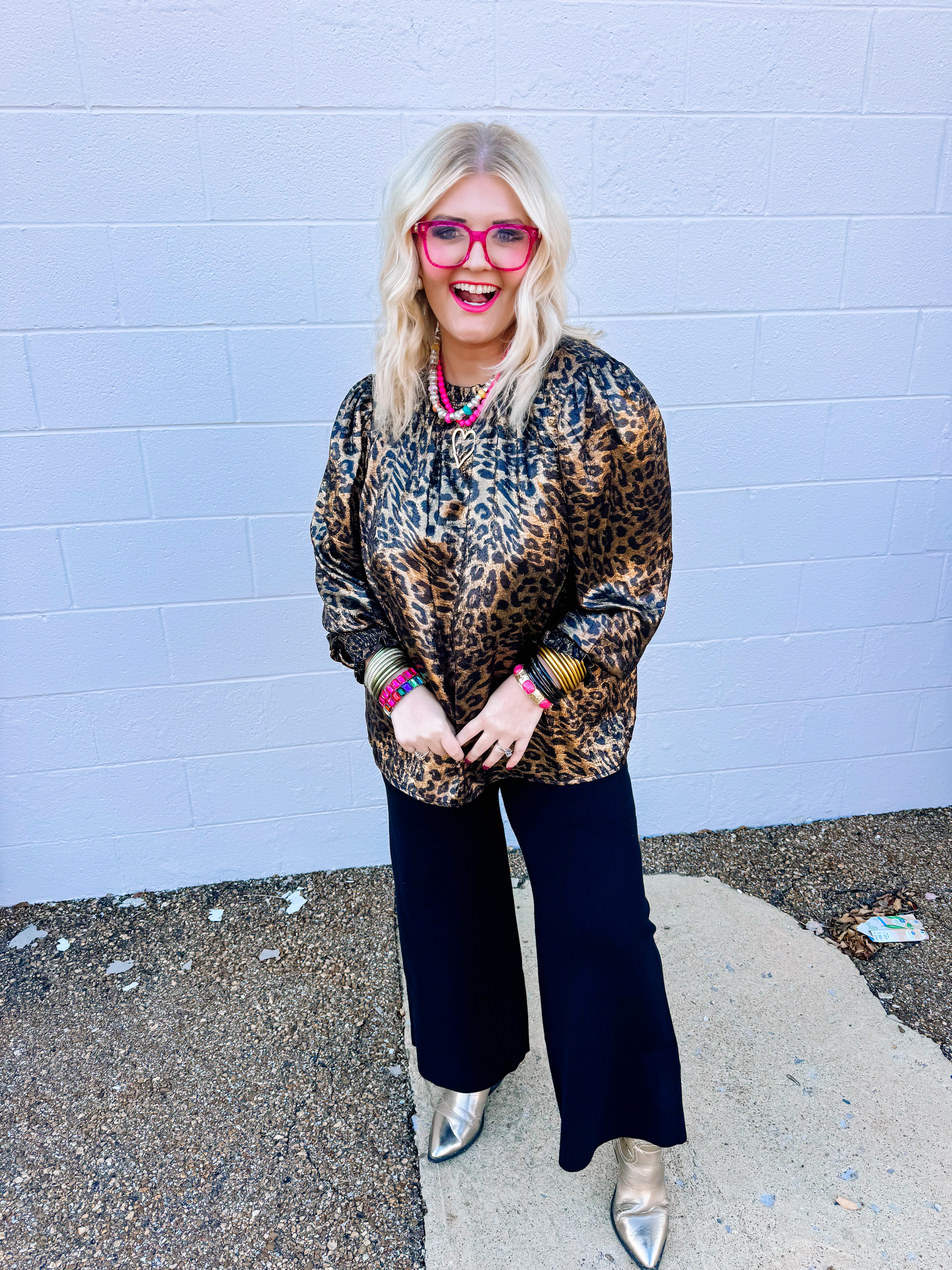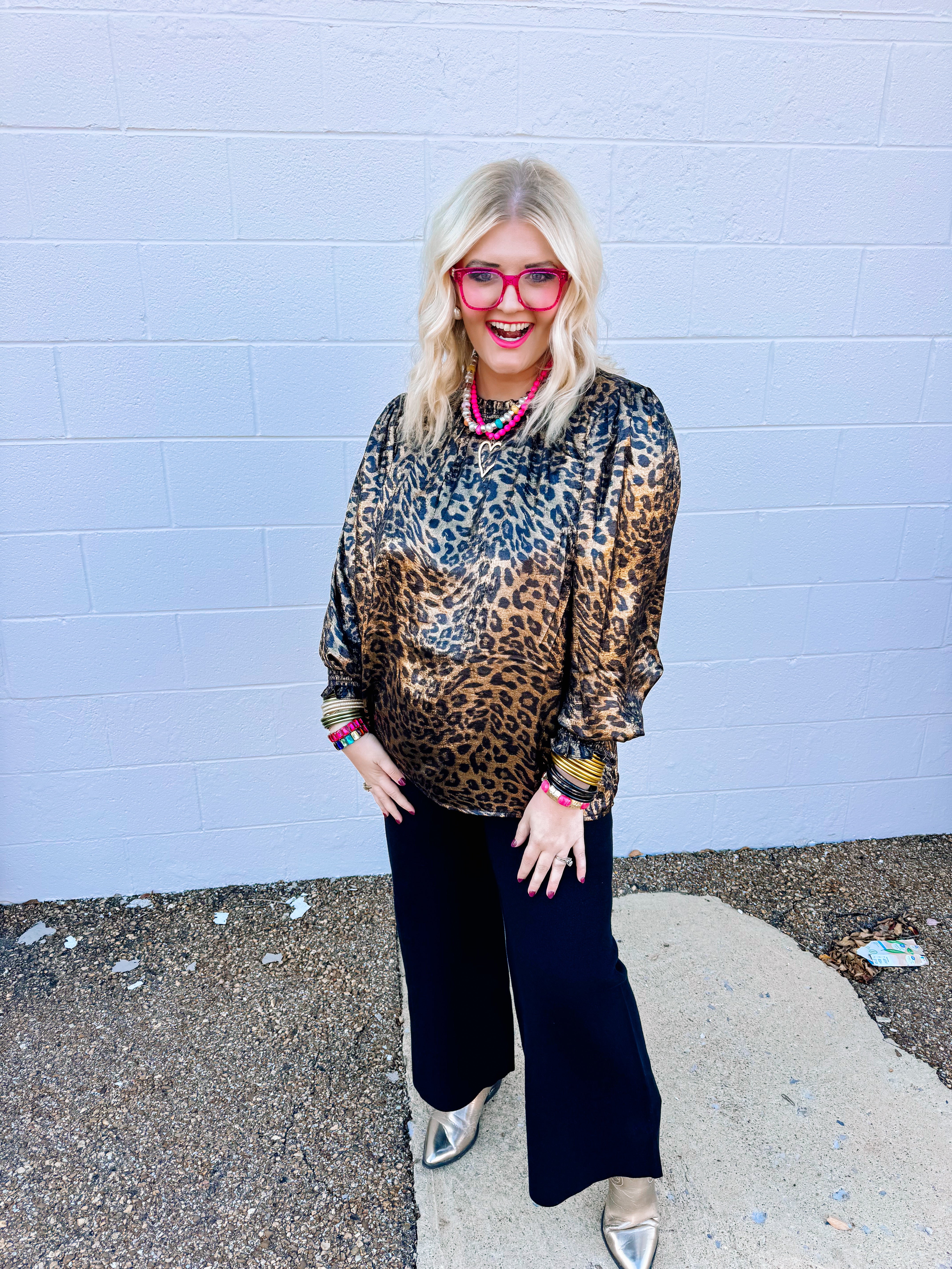 The Oddi Metallic Leopard Holiday Top combines bold animal print with refined tailoring. This statement blouse features a striking metallic leopard pattern that catches the light beautifully. The ruffle neck adds feminine elegance, while long puff sleeves create a dramatic silhouette. Smocked ruffle cuffs provide intricate detailing and a polished finish. Perfect for elevating your holiday wardrobe with sophisticated style and contemporary flair.