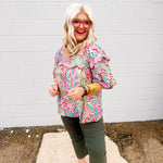 Elevate your wardrobe with the Oddi Olive Floral Blouse, featuring a delicate floral print enhanced by a contrasting scallop ruffle detail. The olive multi-tone palette offers a sophisticated yet fresh look, perfect for both professional settings and casual outings. Crafted to combine elegance with subtle texture, this blouse adds refined charm to any ensemble.