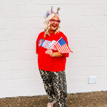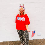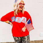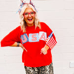 Show your patriotism with this Oddi top! This short sleeve french terrry top with USA logo patches will be perfect for any holiday this summer.