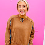 SHE IS BACK! One of our best selling styles is back and just in time for fall but there are a few new things about this style we are liking. Mixing of solids and patterns are very trendy this fall. This acid washed plaid sweatshirt is going to pair very nicely with your colored pants.