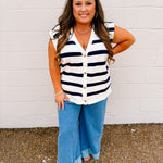 Welcome to the Set Sail Sweater Vest! This knitted striped sweater vest with a faux pocket and decorative buttons is perfect for the spring and summer.