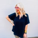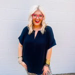 The Zenana Airflow Top in Black offers a comfortable fit with its plus-size woven fabric designed for breathability. Featuring a split neck and short sleeves, this top combines style and ventilation, making it ideal for warm days or layering. Its tailored cut ensures a flattering silhouette while maintaining ease of movement. Perfect for those seeking both comfort and a polished look in their wardrobe.