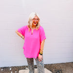 The Zenana Airflow Top in Neon Fuchsia offers a comfortable fit with its plus-size woven fabric designed for breathability. Featuring a split neck and short sleeves, this top combines style and ventilation, making it ideal for warm days or layering. Its tailored cut ensures a flattering silhouette while maintaining ease of movement. Perfect for those seeking both comfort and a polished look in their wardrobe.