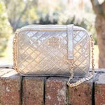 This camera-style crossbody has such a chic look, and it is made with a quilted vegan leather fabric. The braided strap adds an elegant and fun touch to the overall design of the bag. Inside, there is one zippered pocket and two open pockets. Wear with a casual outfit or for a dressy occasion.