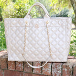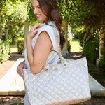 This oversized vegan leather tote is the best go-to handbag! It has two short top handles as well as two elongated braided handles to carry on your shoulder. The Caroline Hill logo is centered at the top of this bag on one side. It has a magnetic closure leading to the roomy interior of the bag. It has one zippered pocket and two open pockets inside. There are also feet on the bottom of the bag for added protection. It's the perfect size for travel, carrying a laptop, or for everyday fashion.