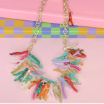 A statement Piece that channels tropical vibes and ocean dreams. Featuring a cascade of colorful coral-shaped charms on a chunky gold chain. This necklace brings movement, texture, and a playful splash of seaside glam.