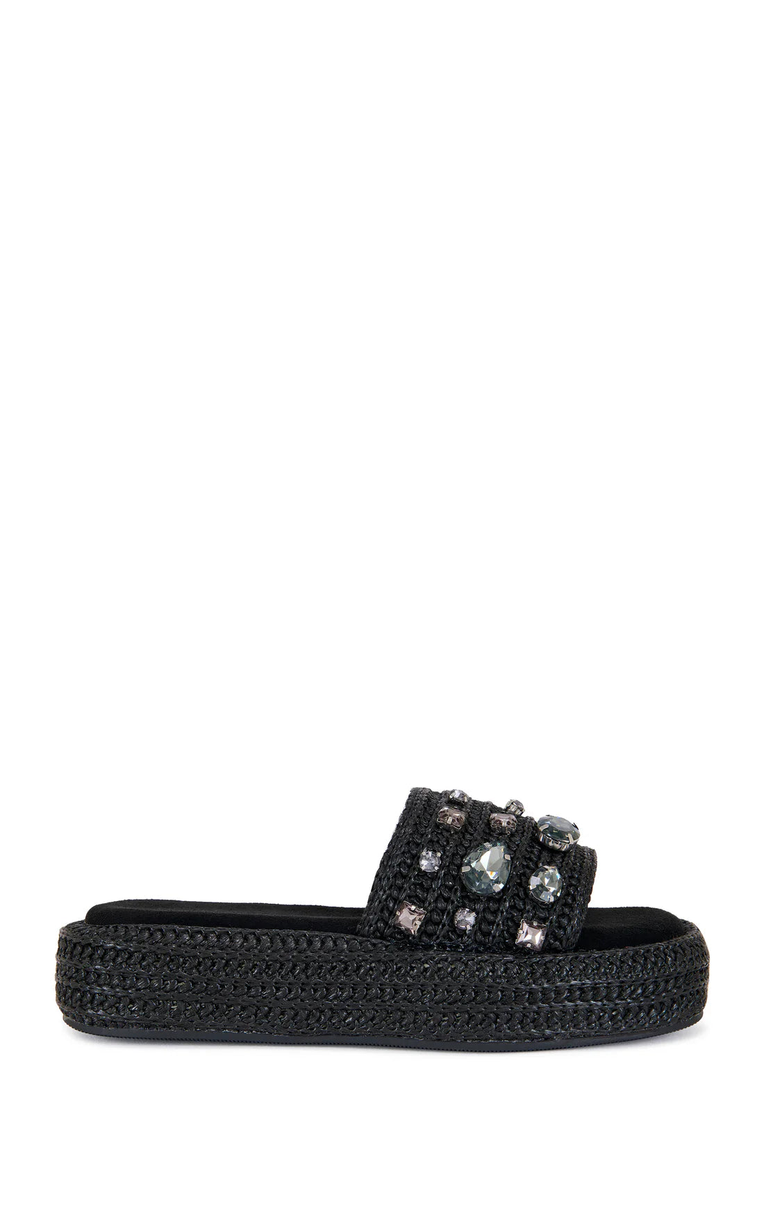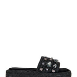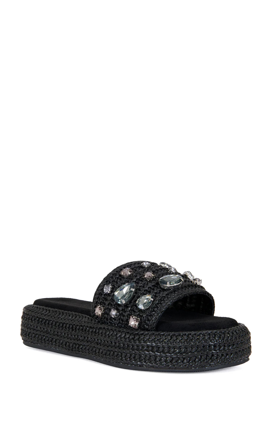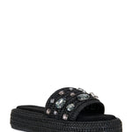 Bring a breezy resort wear vibe to your look with this basket-weave slide sandal lifted by a chunky platform and glittering with glam crystals.
