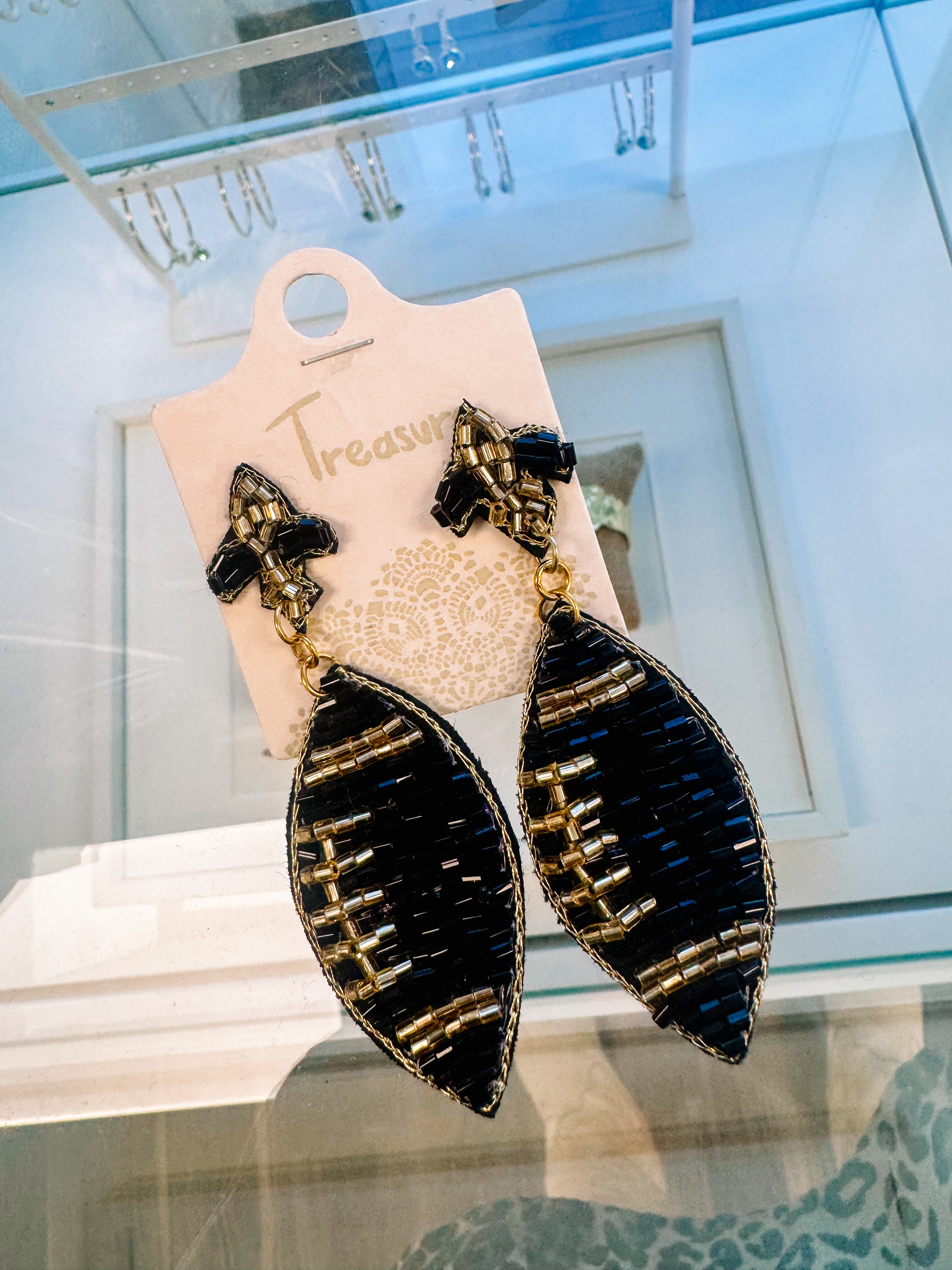 These black football dangle earrings combine sporty charm with delicate elegance, featuring a floral stud at the top for a refined touch. Crafted to balance boldness and femininity, they offer a unique accessory perfect for fans seeking a subtle yet stylish way to showcase their passion. Ideal for game days or casual wear, these earrings provide a distinctive statement with expert design detail.