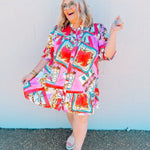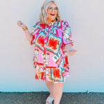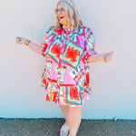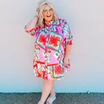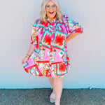 Madison is a 14/16 and 195 pounds. She is a 44DDD in the chest and is wearing the 1X dress with plenty of room!