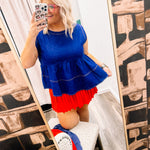 Intruding our Fancy Indigo Top! She's a beautiful indigo color and perfect for fall. She has a scoop neck top with a layered babydoll ruff down the front and back. This top is not lined and she is not see through.