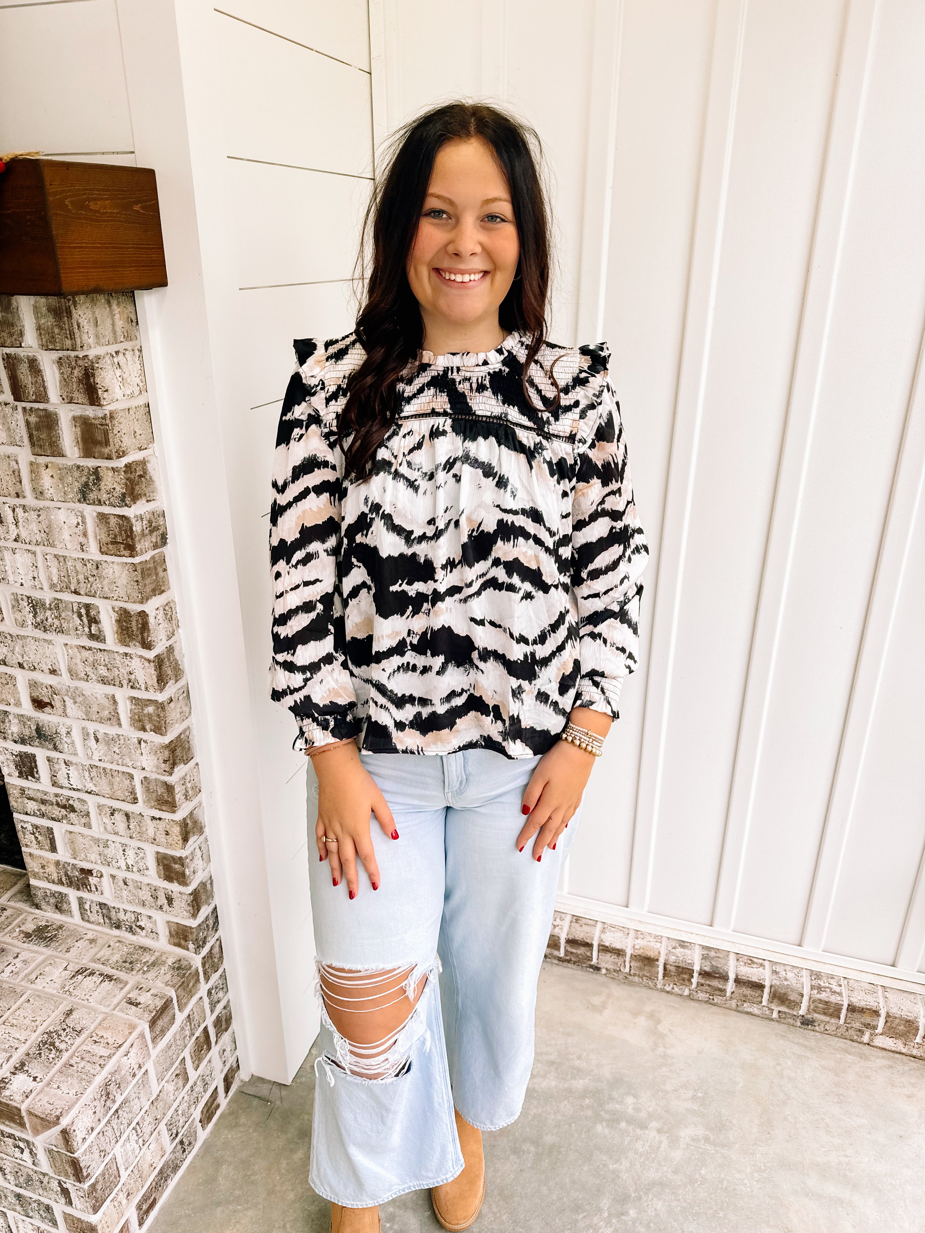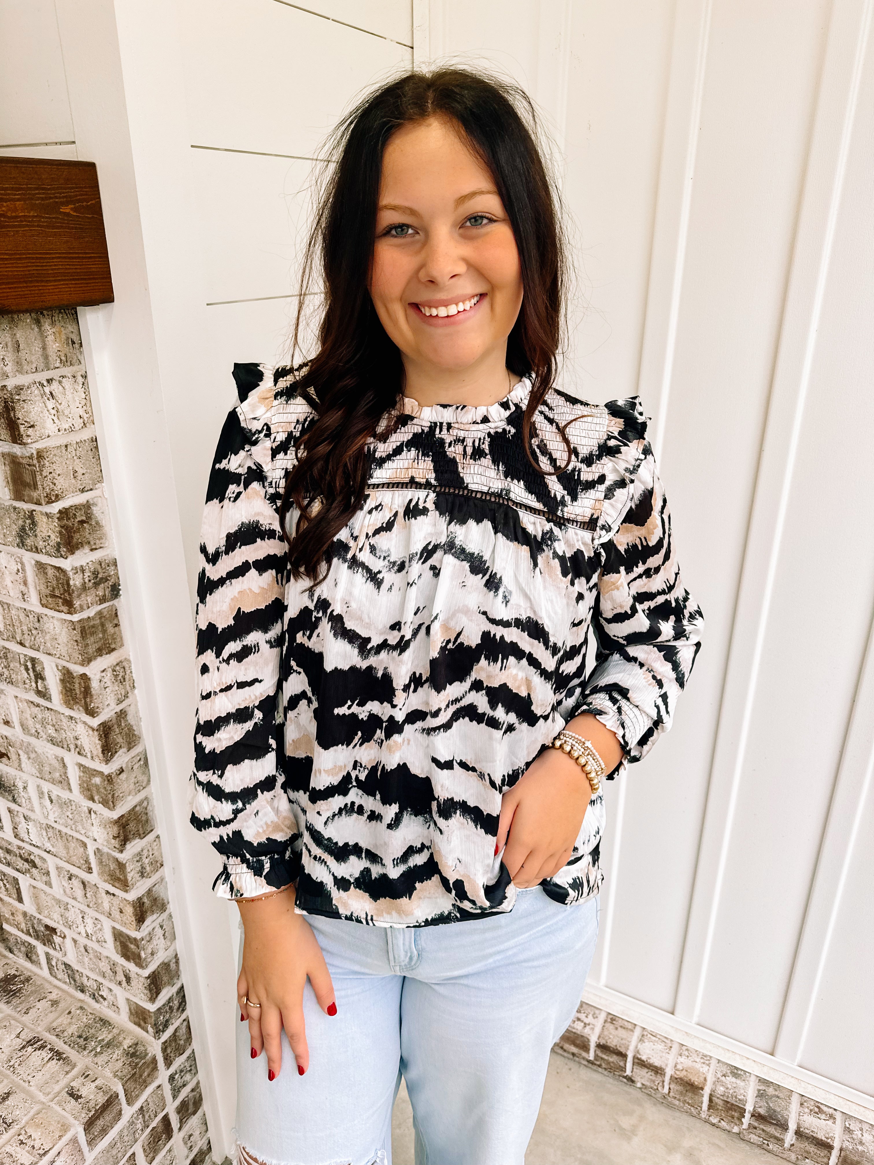 Every girl needs a black top with some gold detailing. Talk about a top you can wear all the time, this one is it. We love the fit of this one. Featuring a beautiful lace detailing throughout the top and a semi-mock neck!