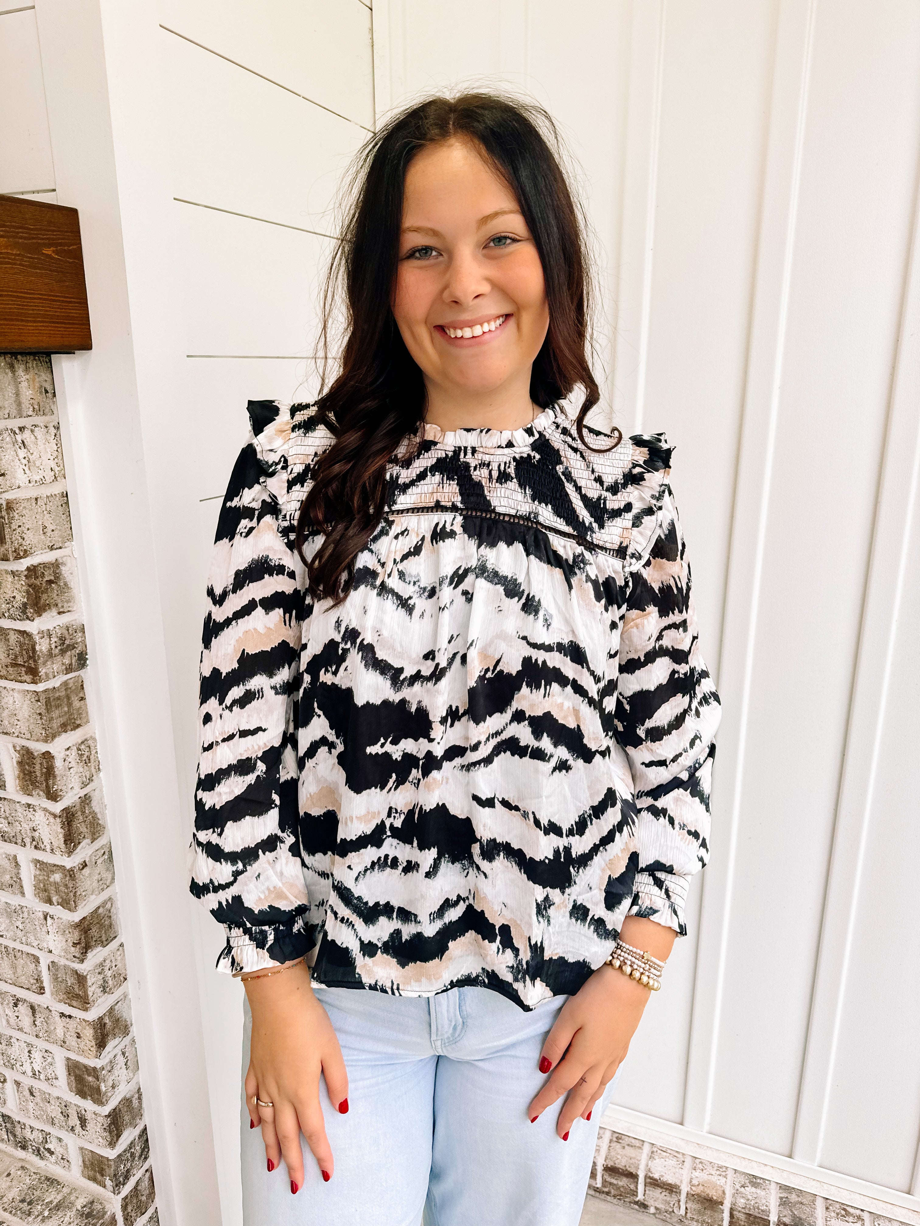 - Sleeve: Long with a ruffle detail