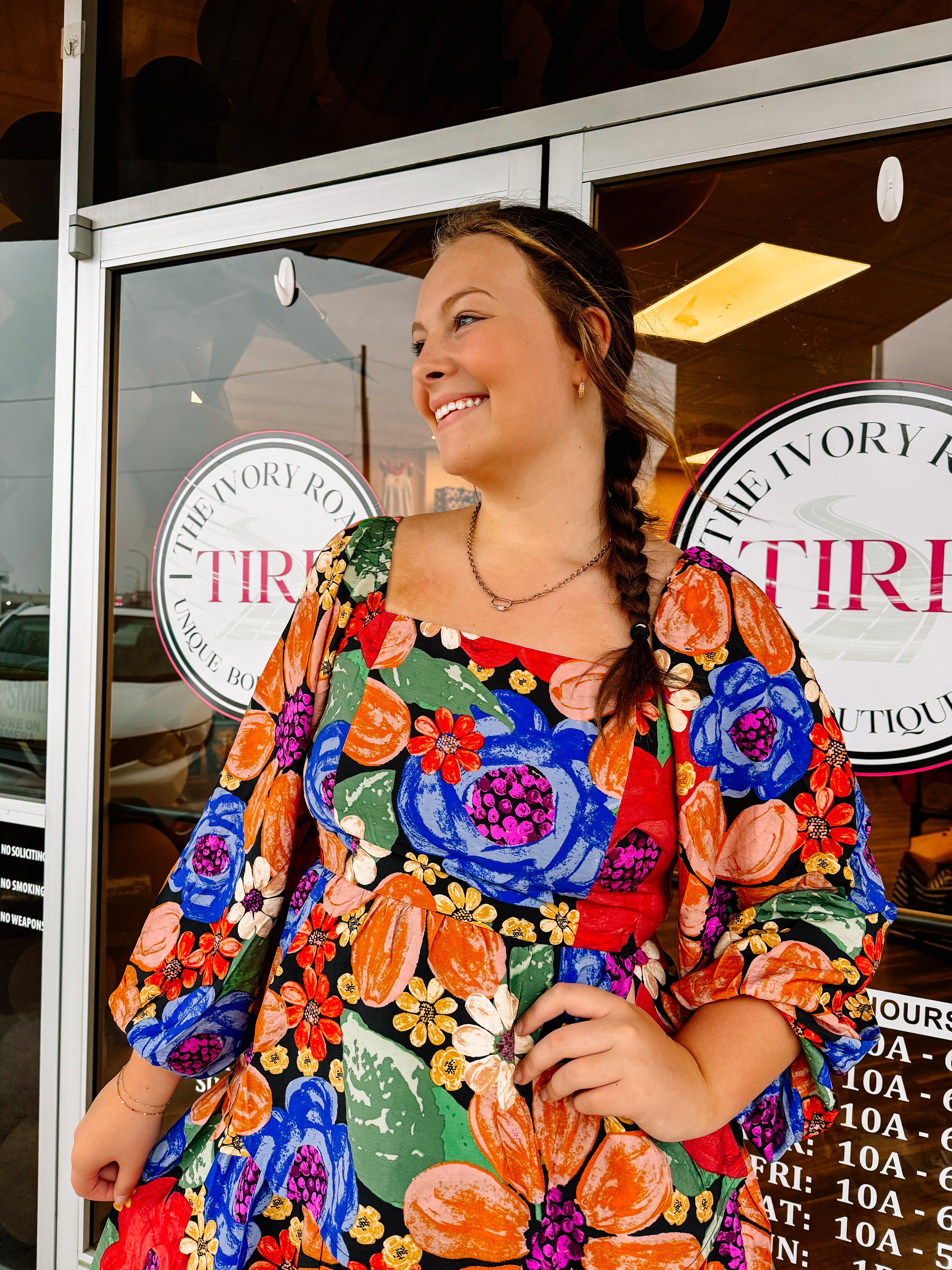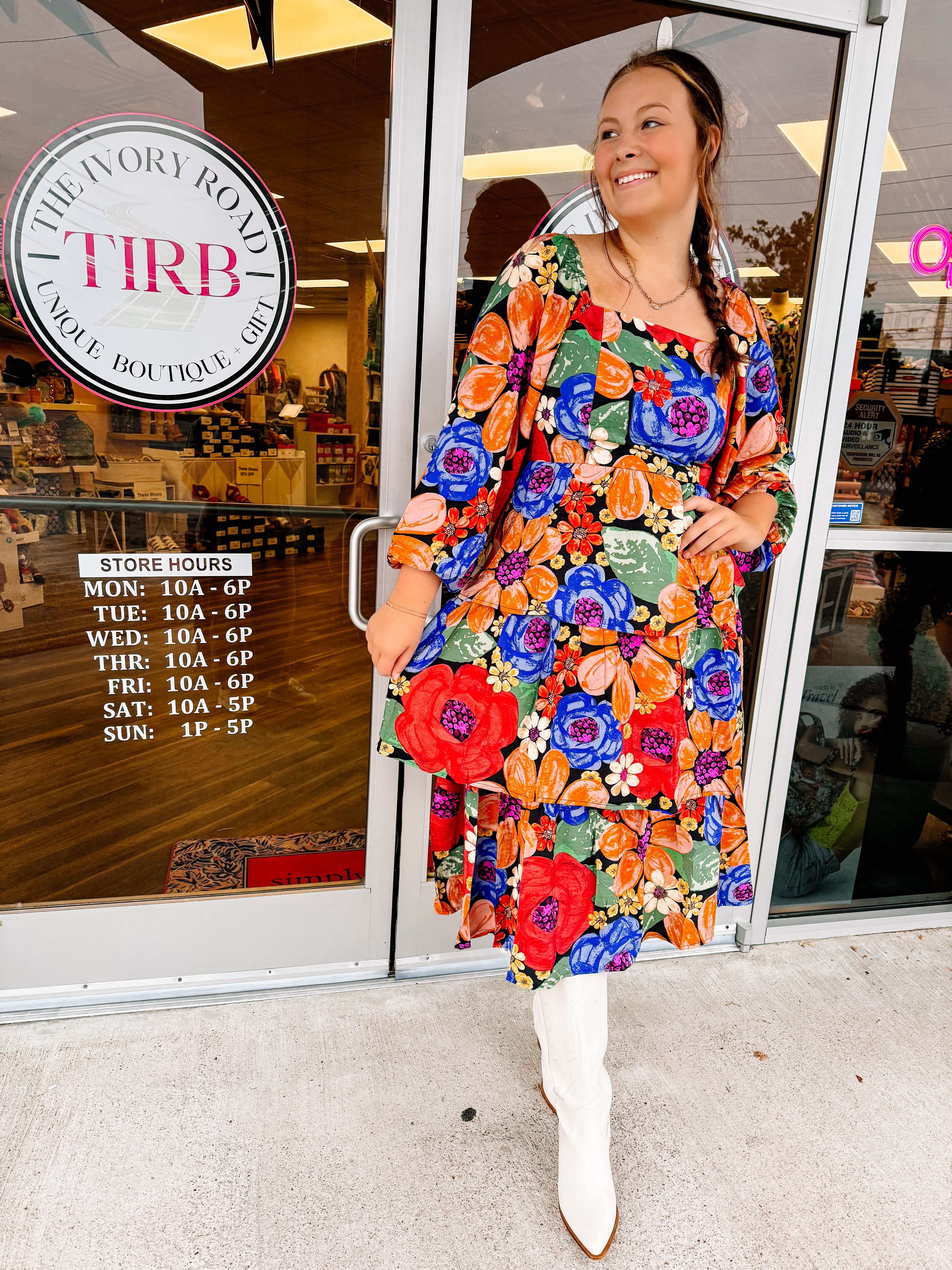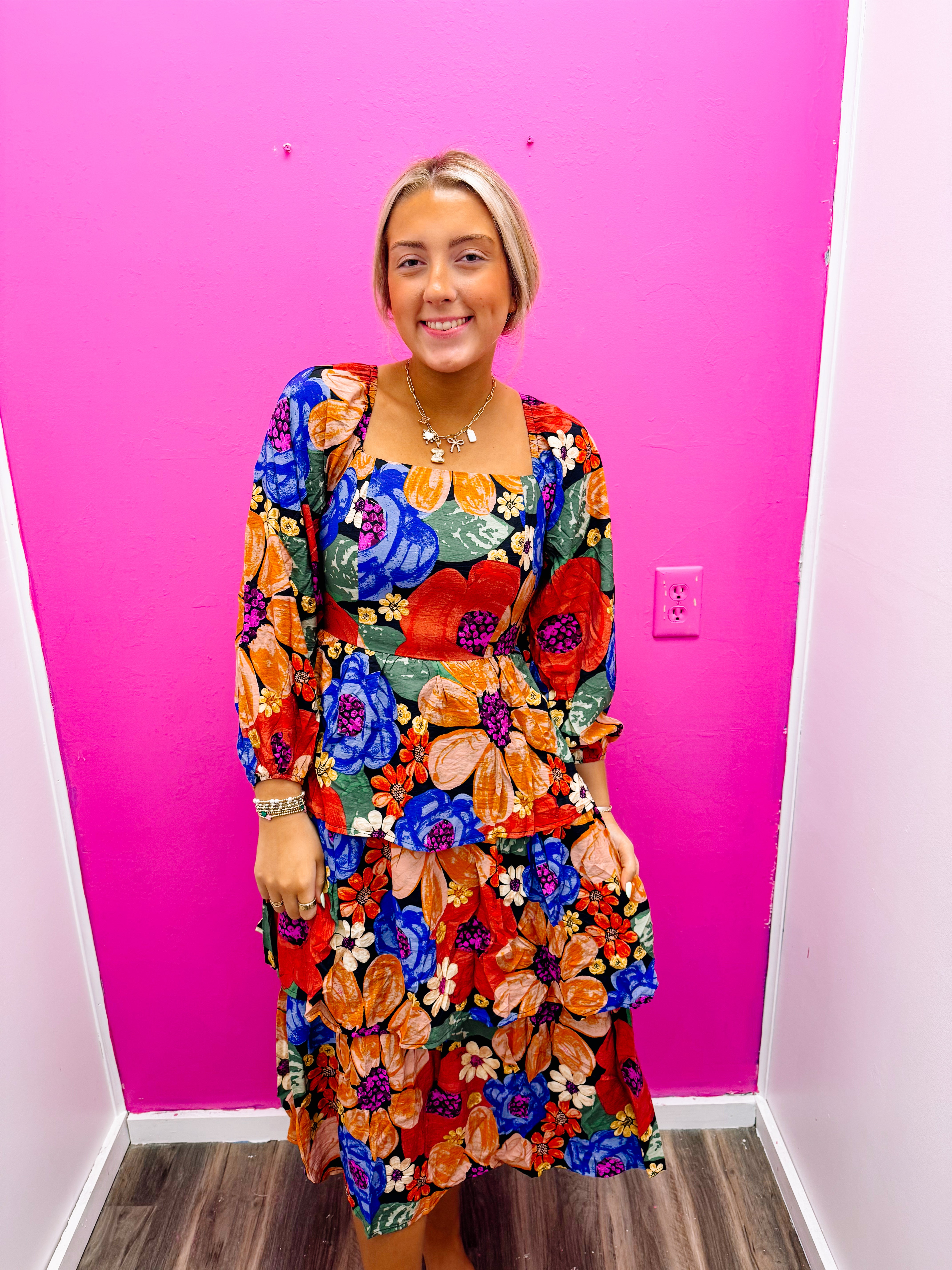 WOW, what a show stopper. Are you looking for something bold yet classy but can also be dressed down? Well we have it for you. This beauty is floral printed with a long sleeve tiered ruffle midi dress with a smocked back to give you the extra room. (*Madison is a curvy girl and this style gives all curvy girls a great shape and look)