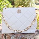 This vegan leather crossbody is so fashion forward! It has a chunky gold chain accent that is removable, and it can be used as a carrying strap as well. The crossbody strap is made of nylon and is also adjustable and removable. The top zipper closure leads to two open compartments as well as a third middle zippered section. It also has two smaller internal open pockets and one zippered pocket.