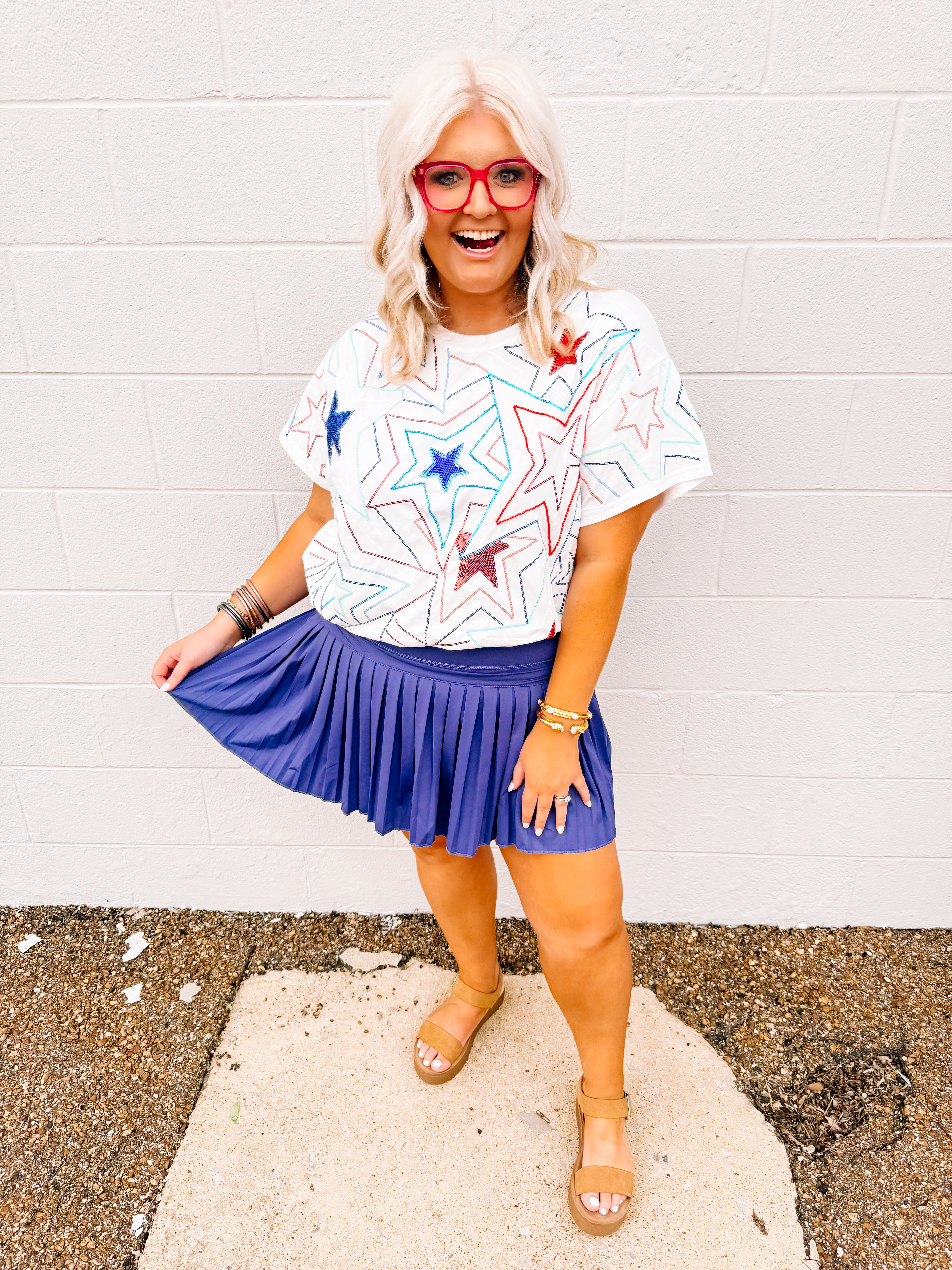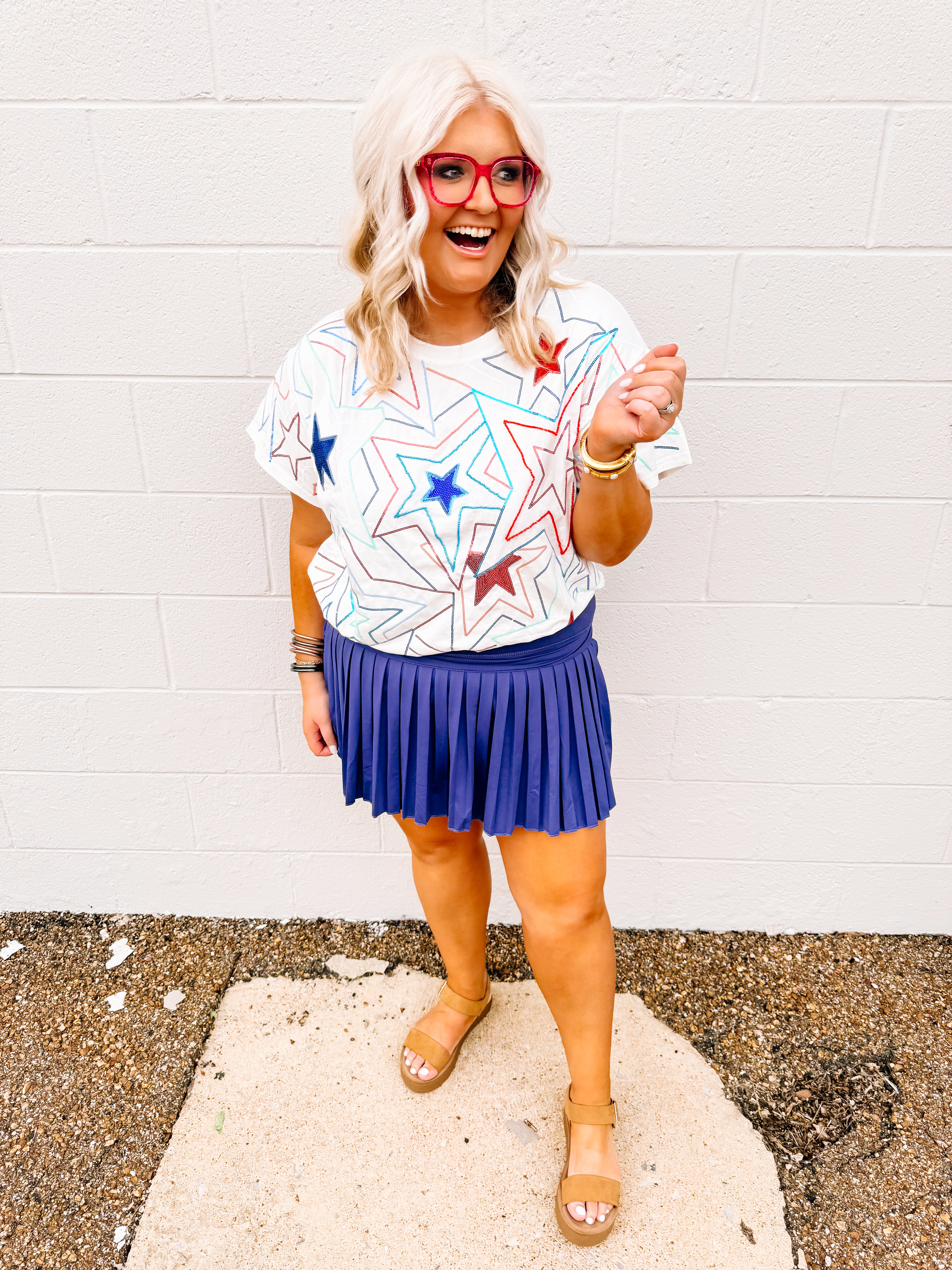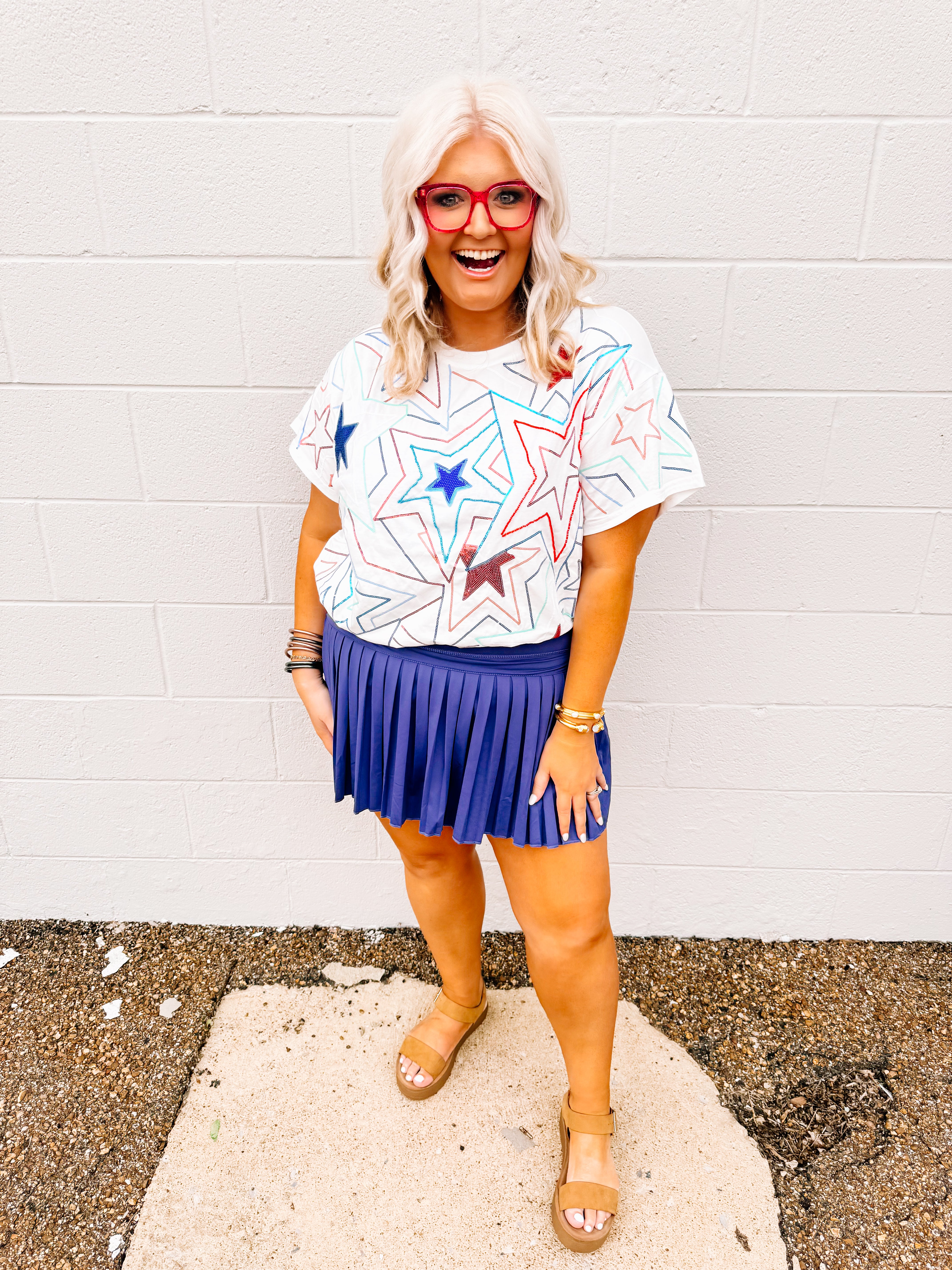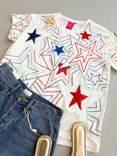 Show off your patriotic pride with our White, Red & Blue Groovy Star Tee! Featuring vibrant red, white, and blue sequin stars, this tee is perfect for Memorial Day or the 4th of July. Plus, it fits true to size. Don't miss out on this festive and stylish addition to your wardrobe!