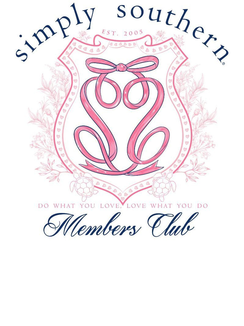 White short sleeve shirt with the phrases 'Do what you love/Love what you do' and 'Members Club'. There is a large pink hair bow with the Simply Southern logo above and on left chest. 100% cotton. Unisex sizing.