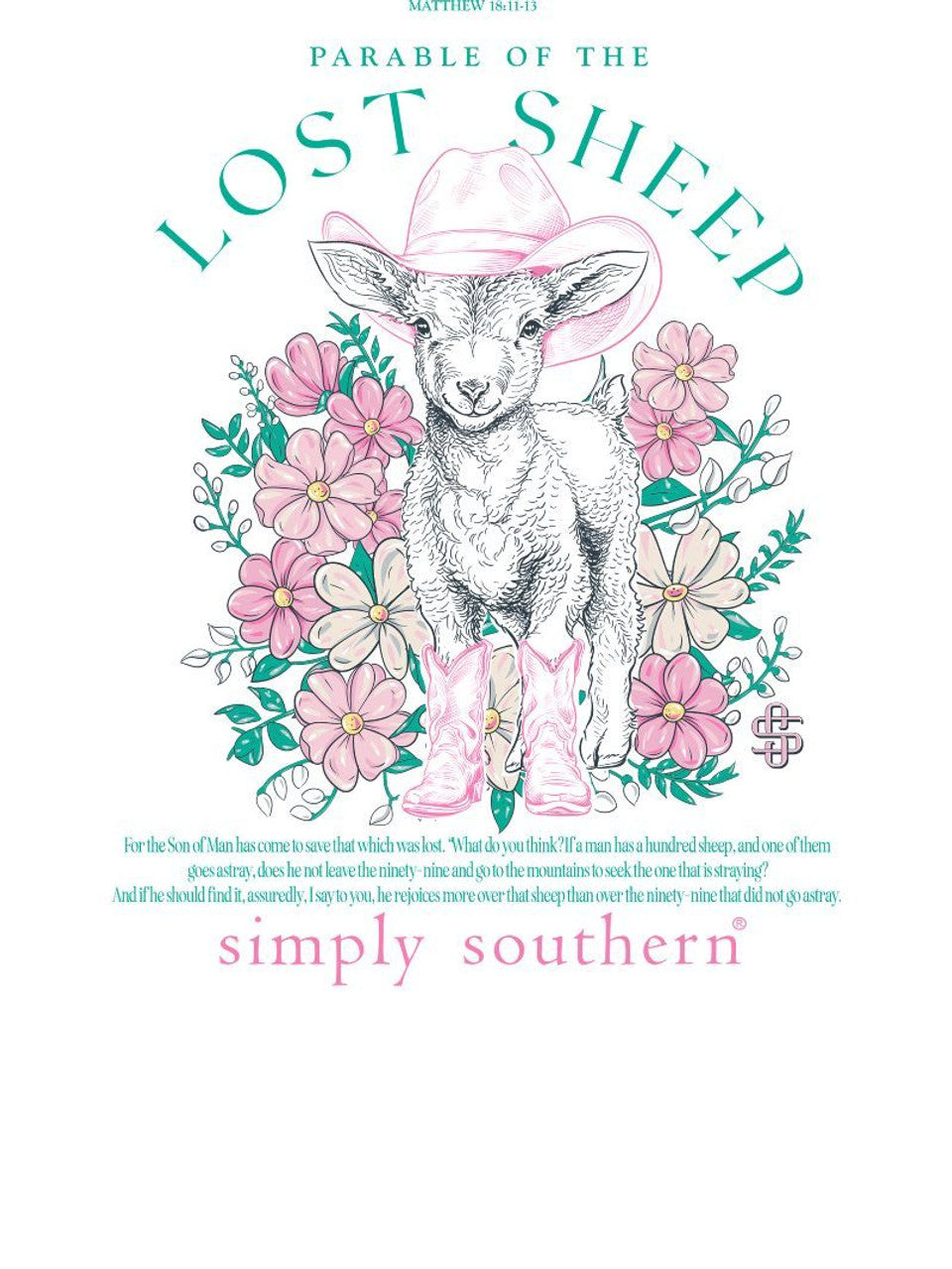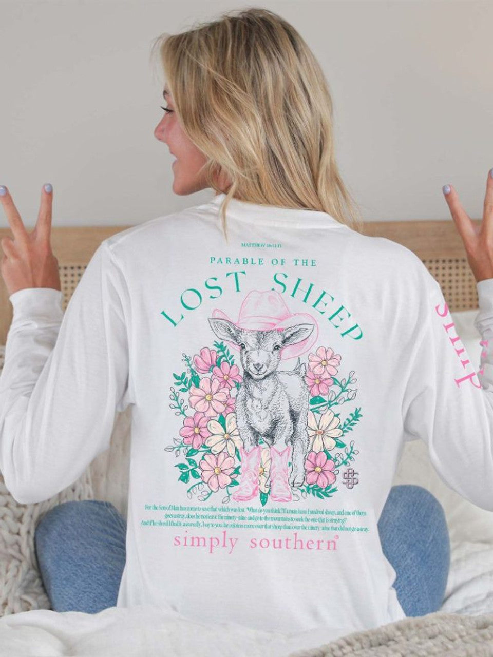 White long sleeve shirt with the Parable of the Lost Sheep from the book of Matthew and a lamb wearing cowgirl gear in some wild flowers. Simply Southern logo below and along right sleeve. Similar design on left chest. 100% cotton. Unisex sizing.