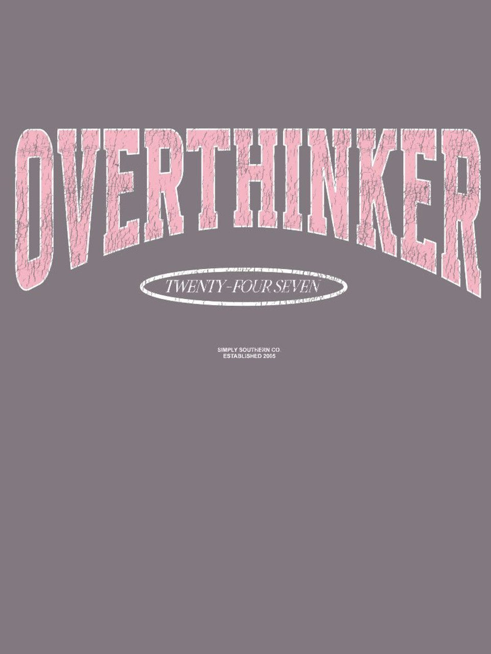 Dark heather grey short sleeve shirt with the phrase 'Overthinker twenty-four seven'. Simply Southern logo below. 98% cotton / 2% polyester blend.