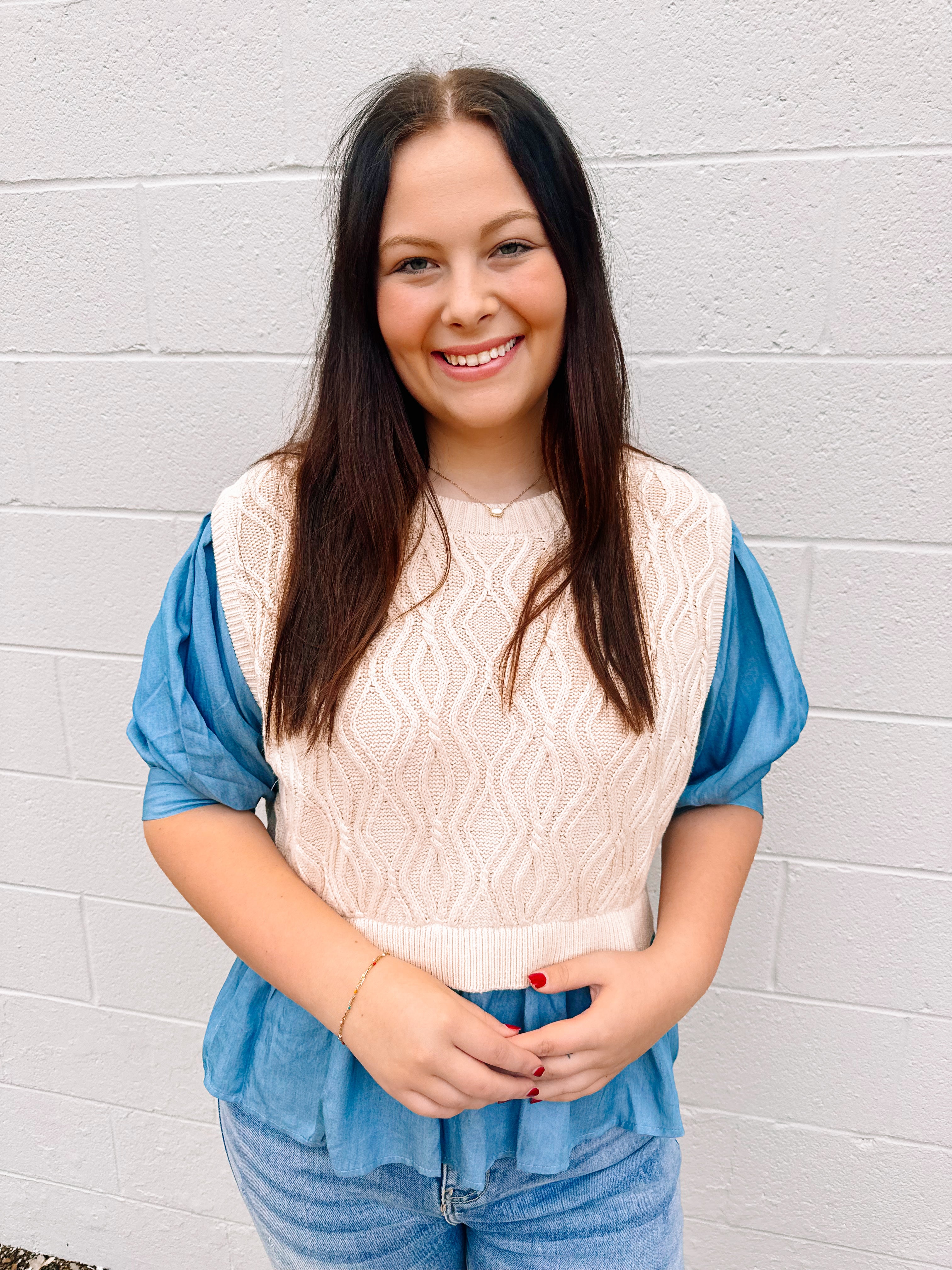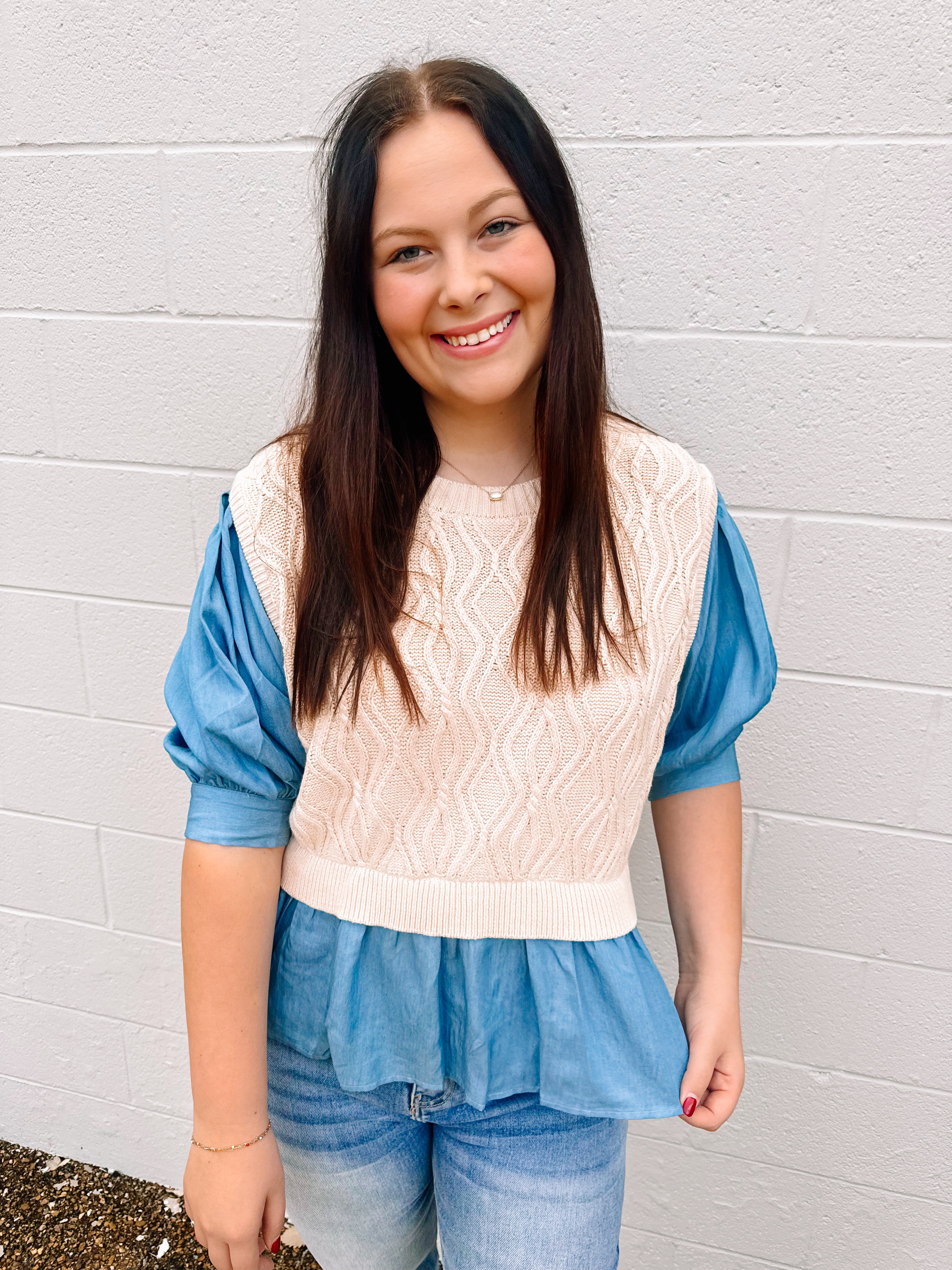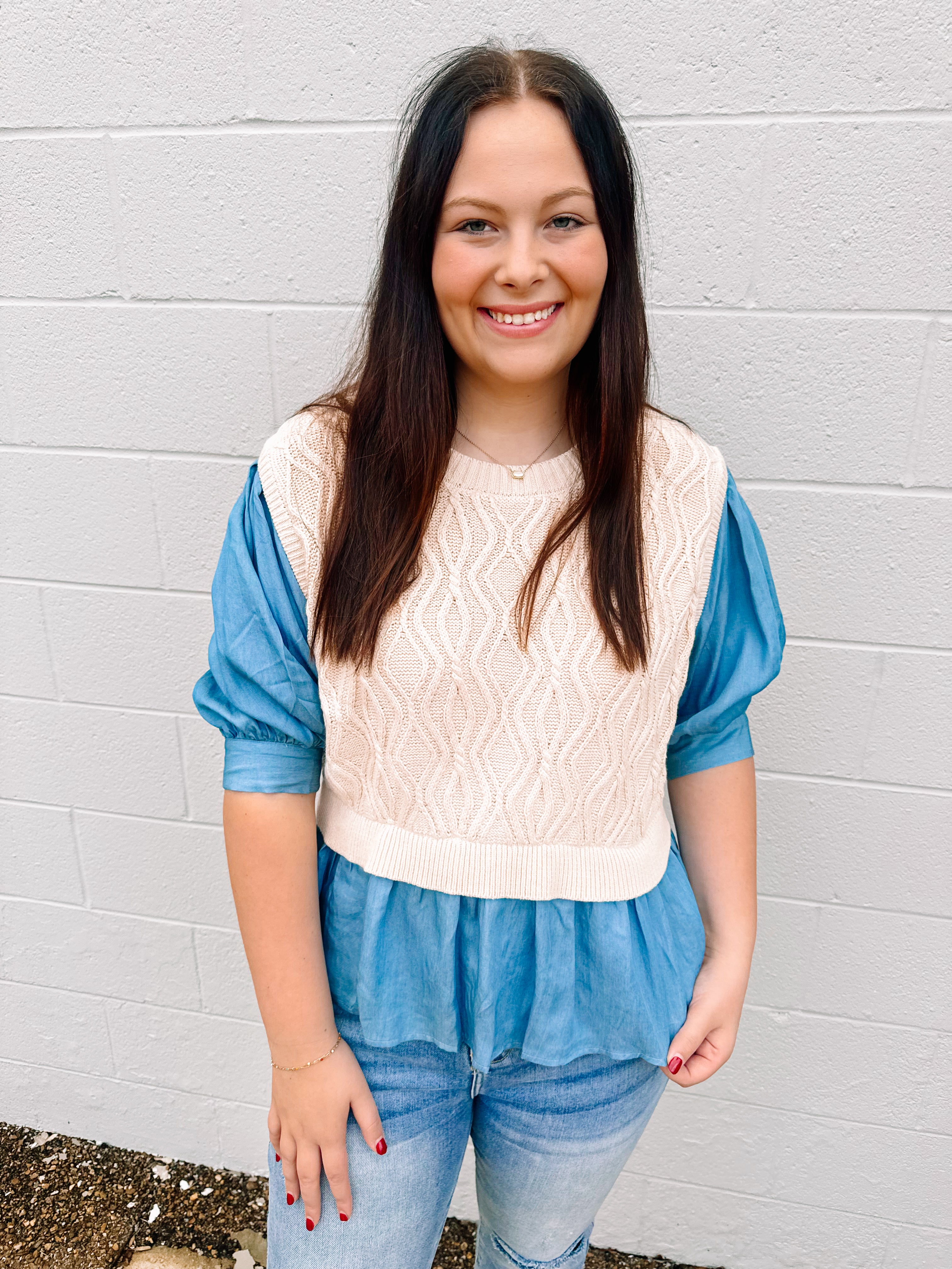 A preppy look for the Winter season. Everyone loves this look and its alway a best seller. The Charleston Sweater Vest features; a Solid round neck 3/4 sleeve twofer top featuring cable knit vest. Self tie at back. Unlined. Knit. Non-sheer. Lightweight.