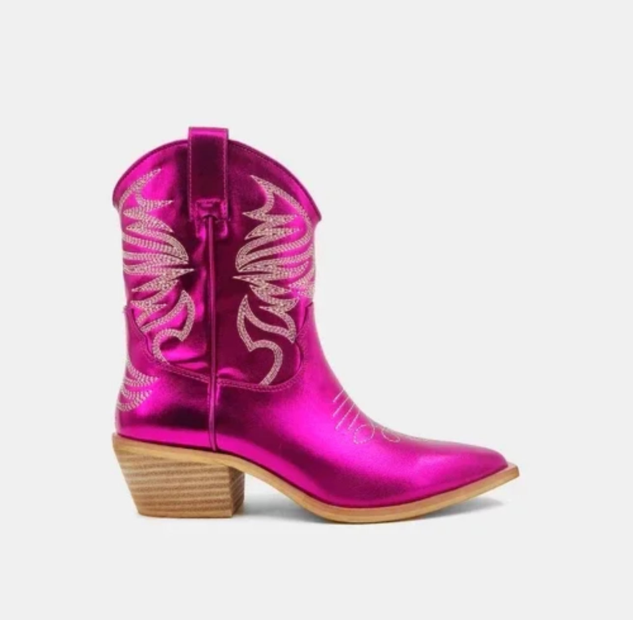 ZEN updates classic cowboy boots with a brilliant twist. Crafted with metallic faux leather and deatiled with Western stitching, ZEN features a stacked heel and side pull tab.