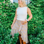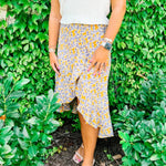 Absolutely stunning for fall! The mustard background with the purple and white flowering details is perfect for falll! We dressed her up with heels but you can do mules or boots. We paired her with our white knit top but you can also do a graphic tee! This skirt has an elastic waistline on the back of the dress.