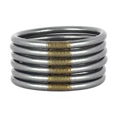 Constructed from flexible polyvinyl carbonate rings infused with delicate gold leaf in a wild lilac tube, then sealed with the our BuDhaGirl Serenity Prayer bead, our Lila All Weather Bangles® embody versatility. From poolside to boardroom to airport, these bangles stay put, allowing you to navigate any terrain without removal. Encased in a custom BuDhaGirl All Weather Bangles silk pouch, each bangle is a testament to meticulous craftsmanship by artisans (over 20 artisans work on each bangle) in Thailand.