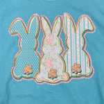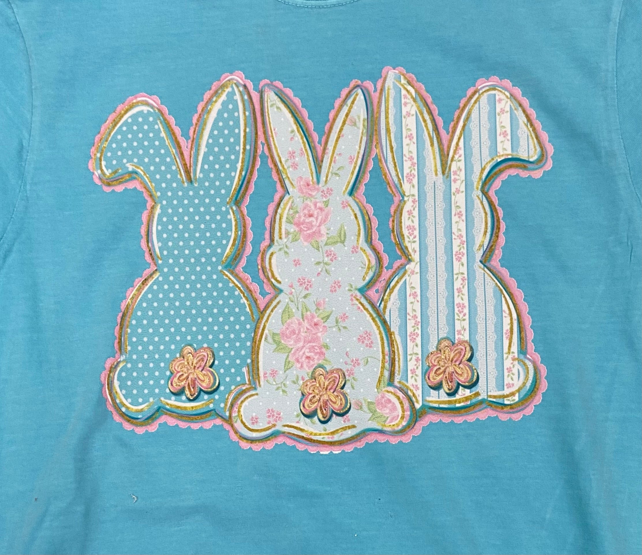 Hop into style with this charming teal Comfort Colors t-shirt featuring three adorable bunnies, each crafted from a different fabric texture. The design creates a playful, dimensional look that brings these little friends to life. Perfect for bunny lovers and anyone who appreciates whimsical, tactile fashion. Soft, comfortable, and conversation-starting—a delightful addition to any wardrobe.