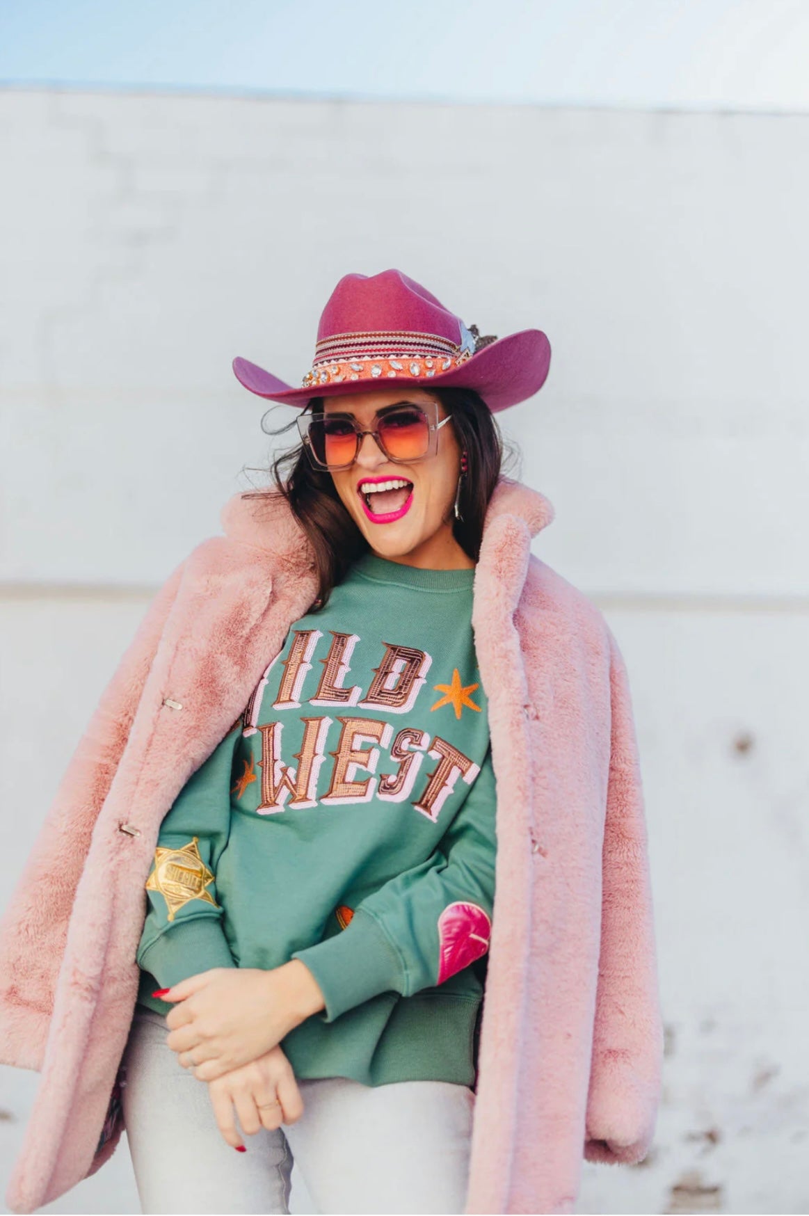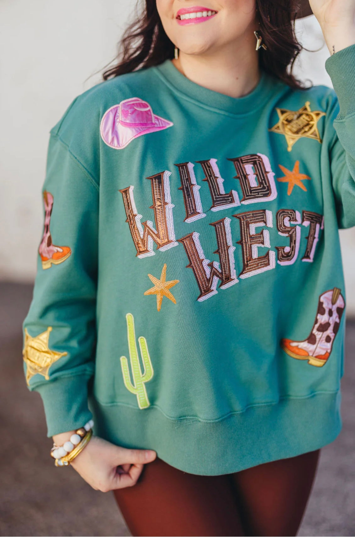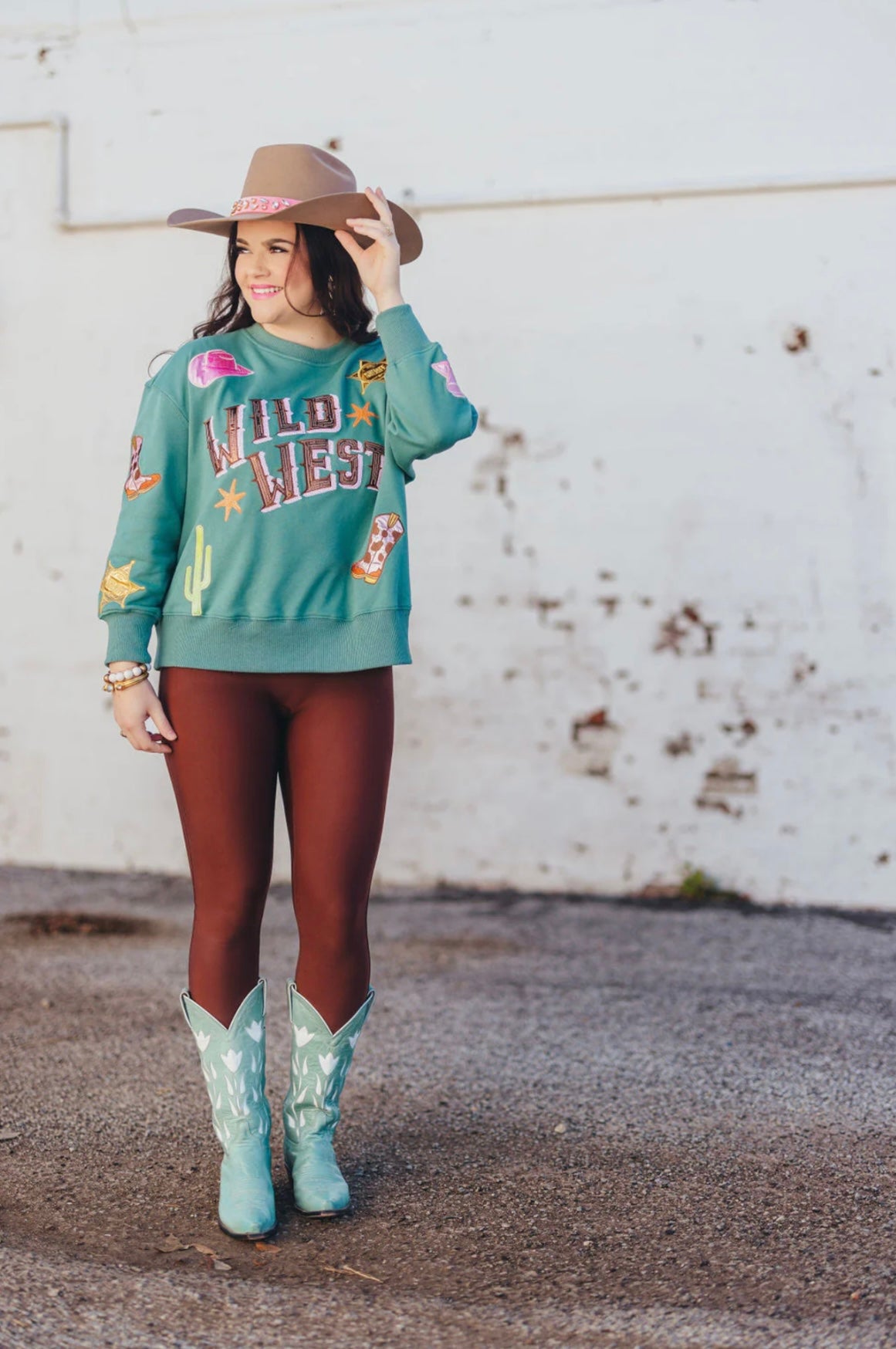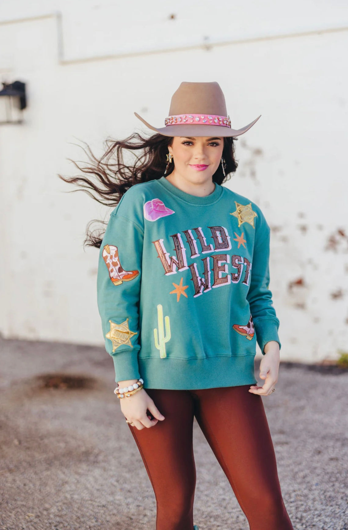 • Various appliqué designs all over sweatshirt with metallic fabric, sequins, and/or embroidery including a cactus, sheriff badge, cowgirl hat, and boots