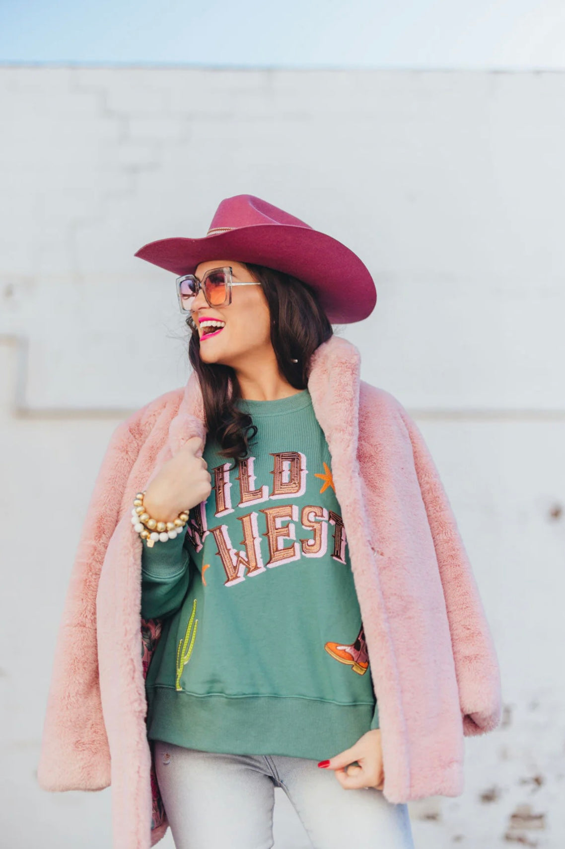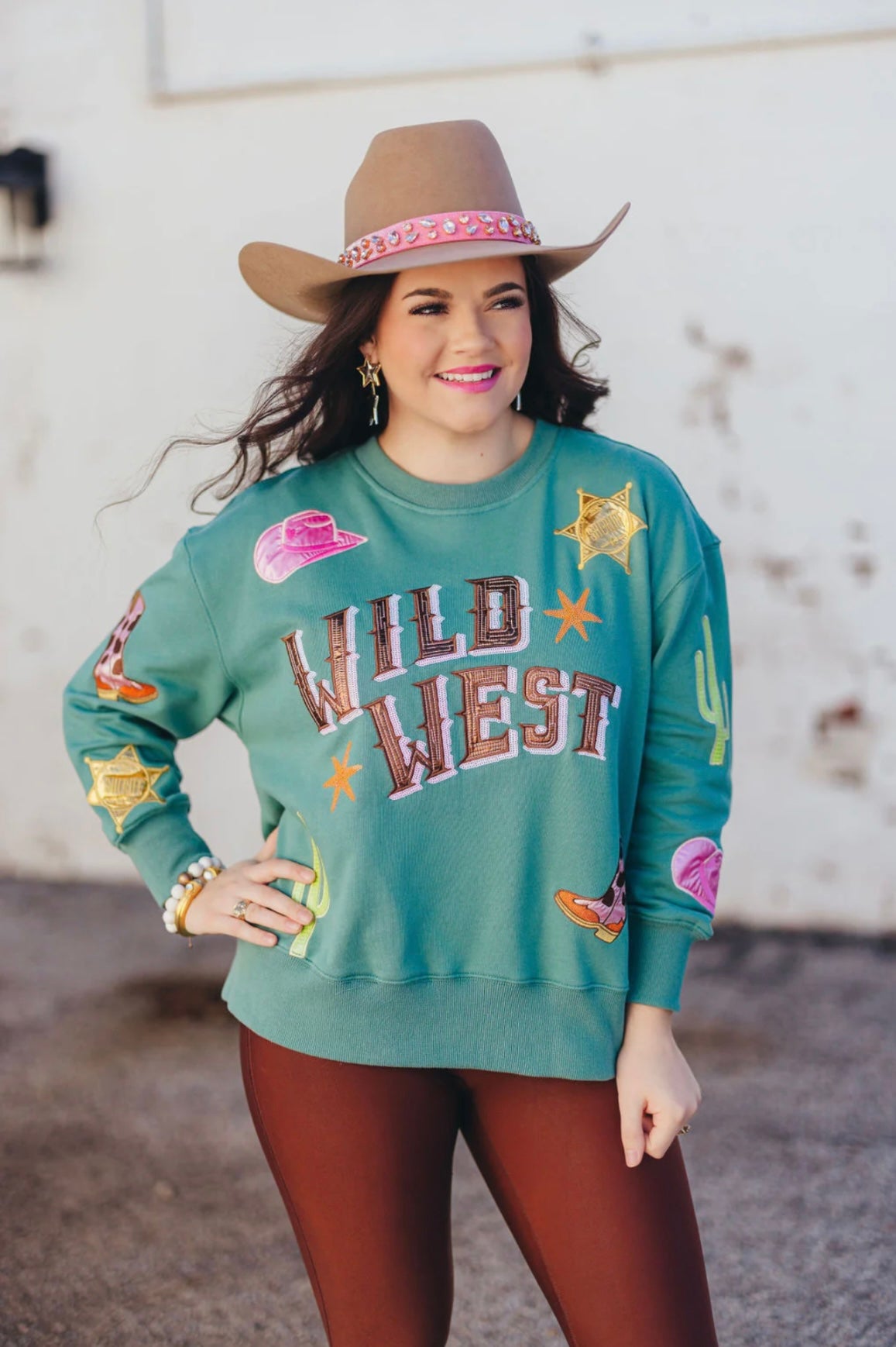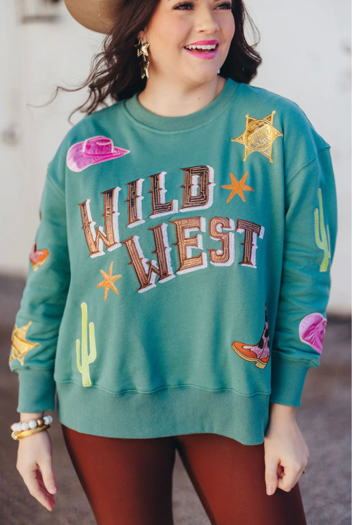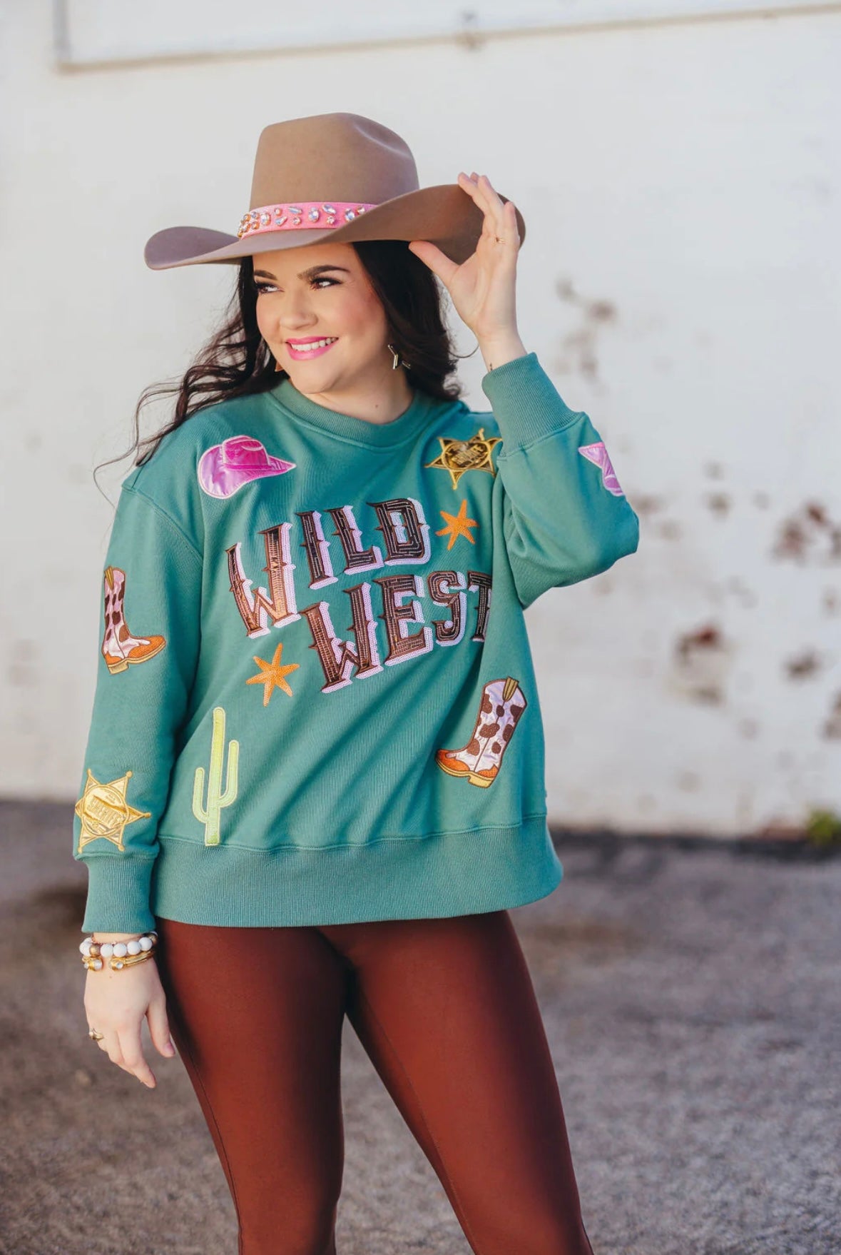 • Various appliqué designs all over sweatshirt with metallic fabric, sequins, and/or embroidery including a cactus, sheriff badge, cowgirl hat, and boots
