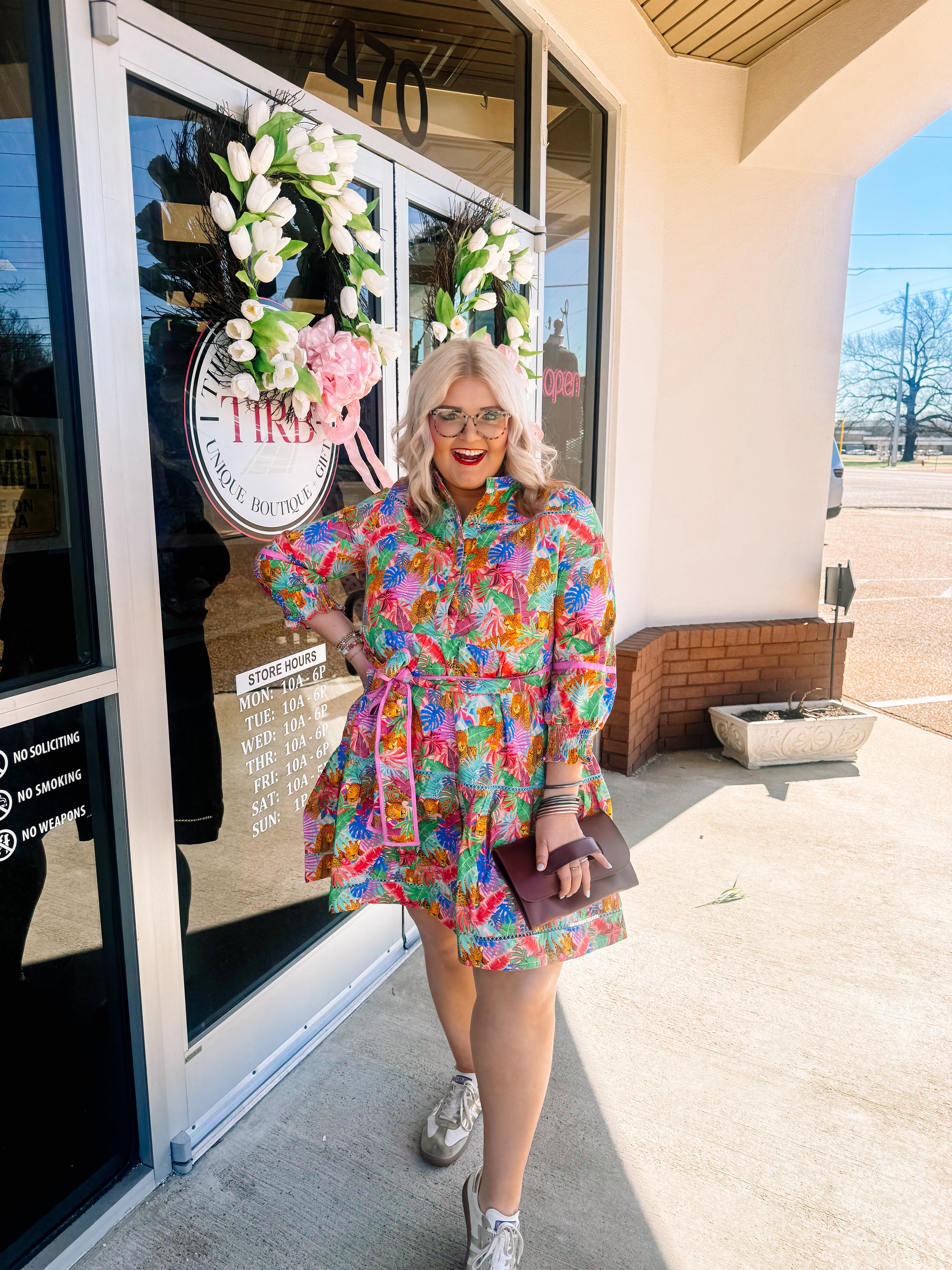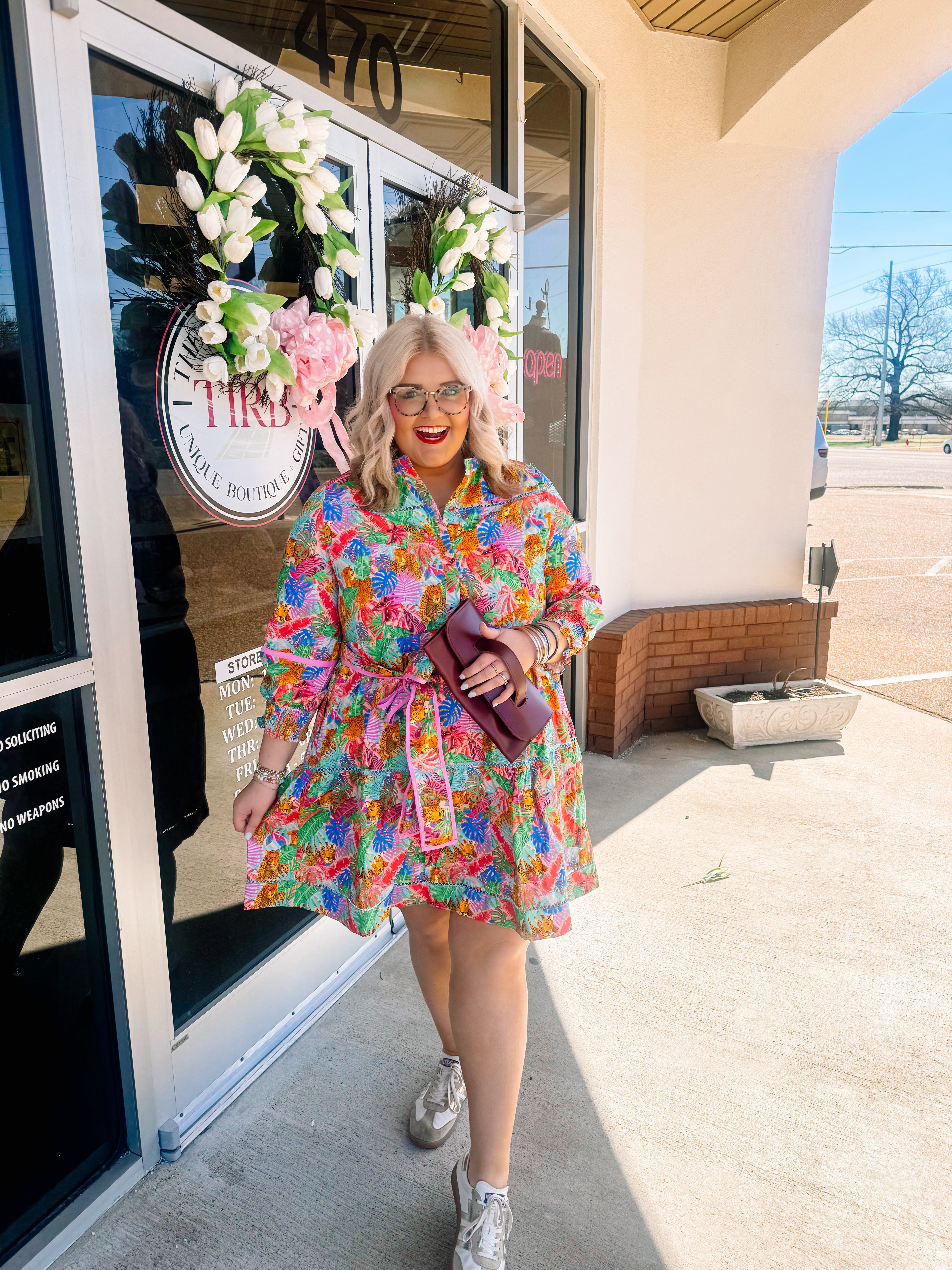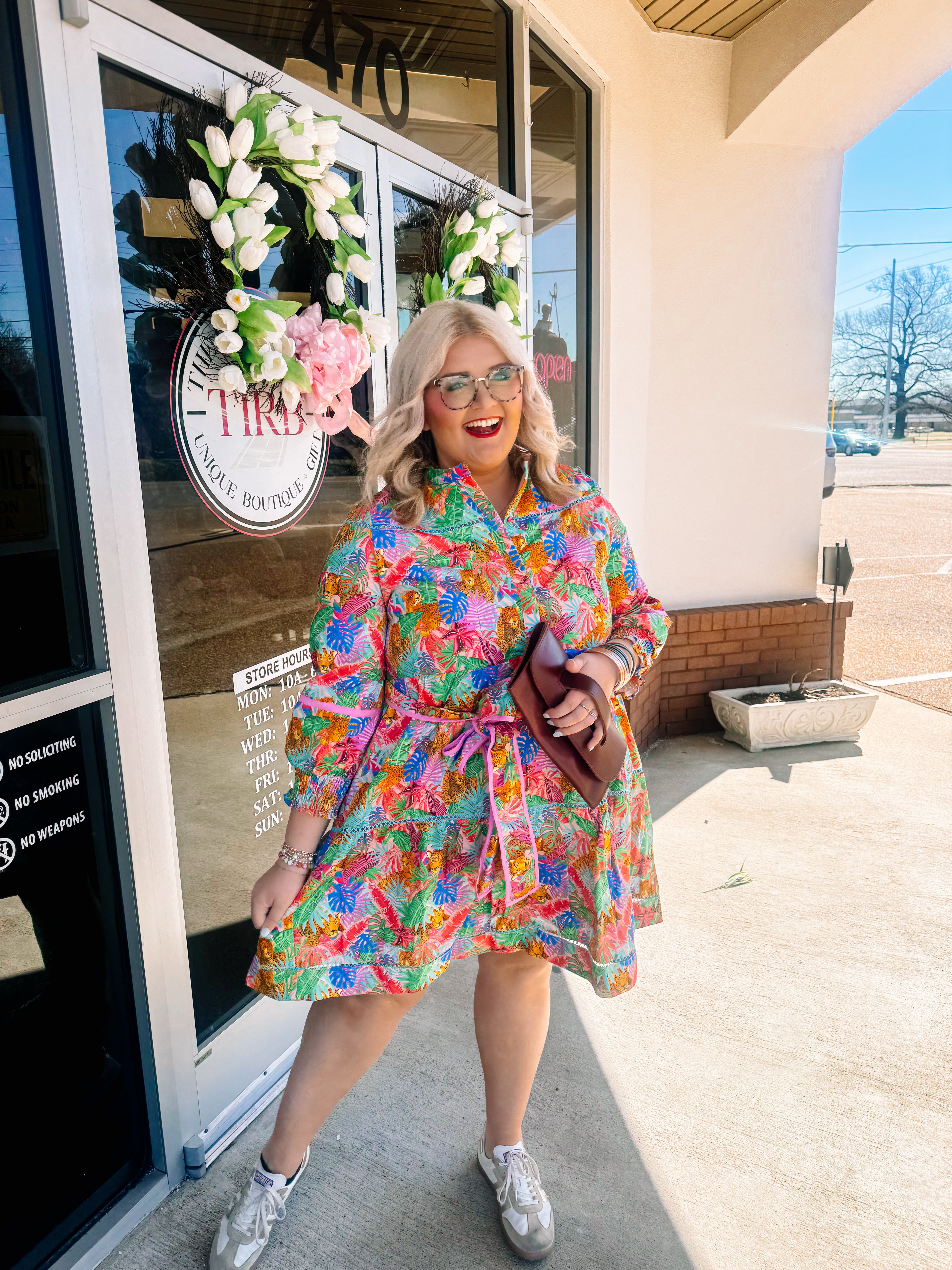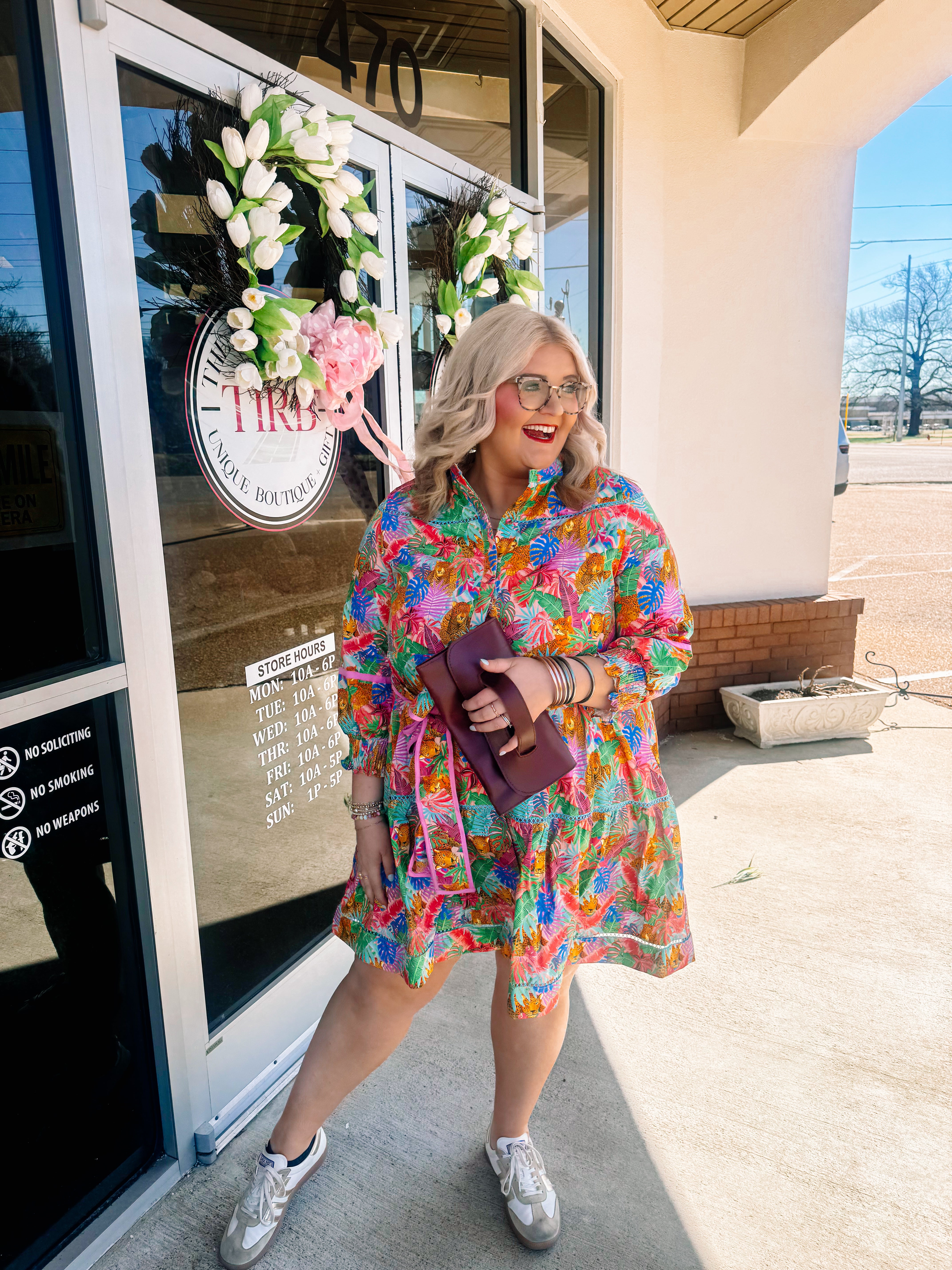Make a statement with the bold and playful Monet. The relaxed fit makes it ideal for both casual outings and more polished occasions. Easily add the self-tie belt to add a tailored touch.