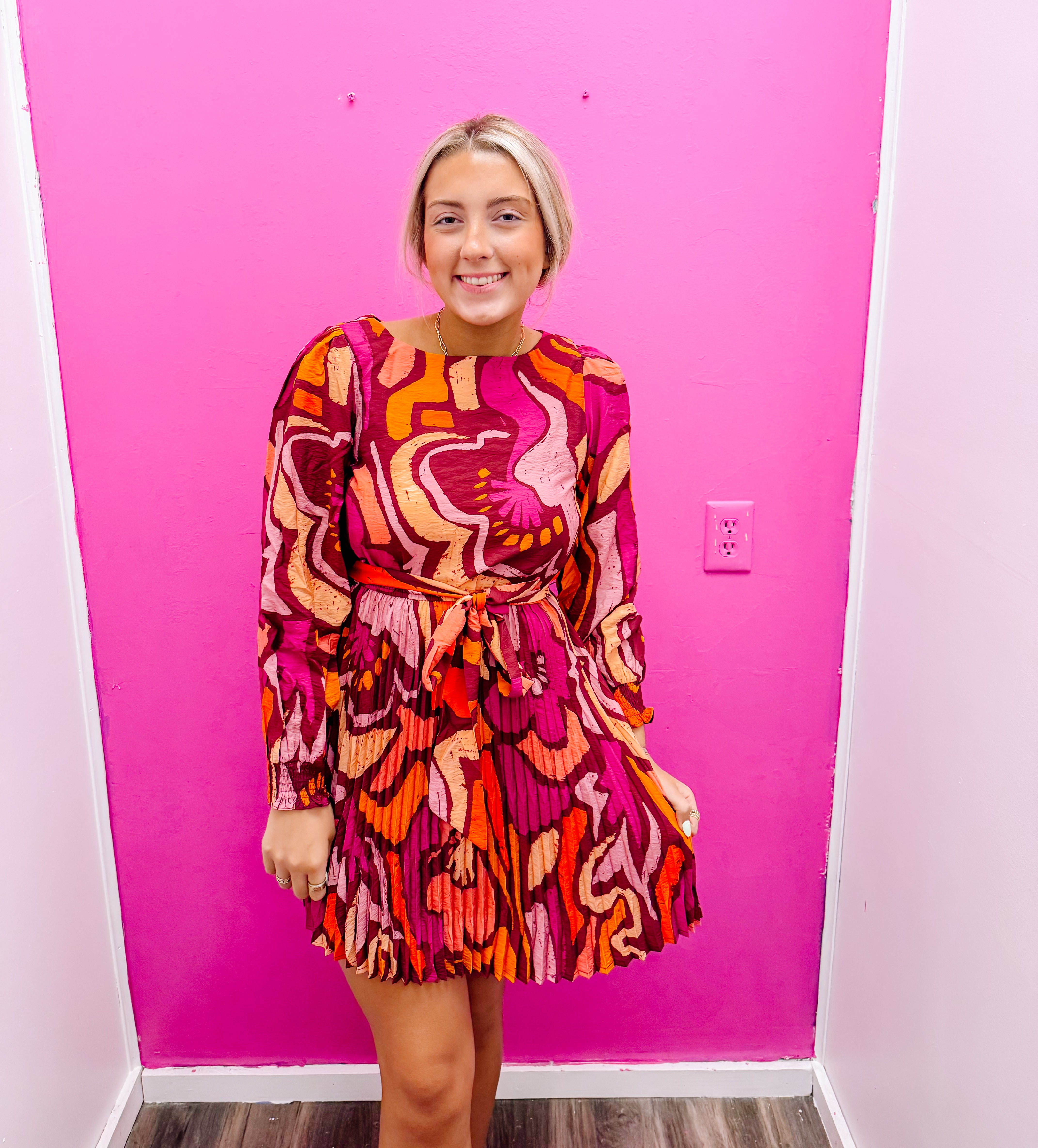 Let's talk about a dress that is stunning. This magenta geo printed dress with a boat neck long sleeve that is a pleated mini dress with belt style is going to be the best piece to wear this Fall. You are able to wear this to all your events. (Examples: Weddings, Pictures, Parties, Banquets.)