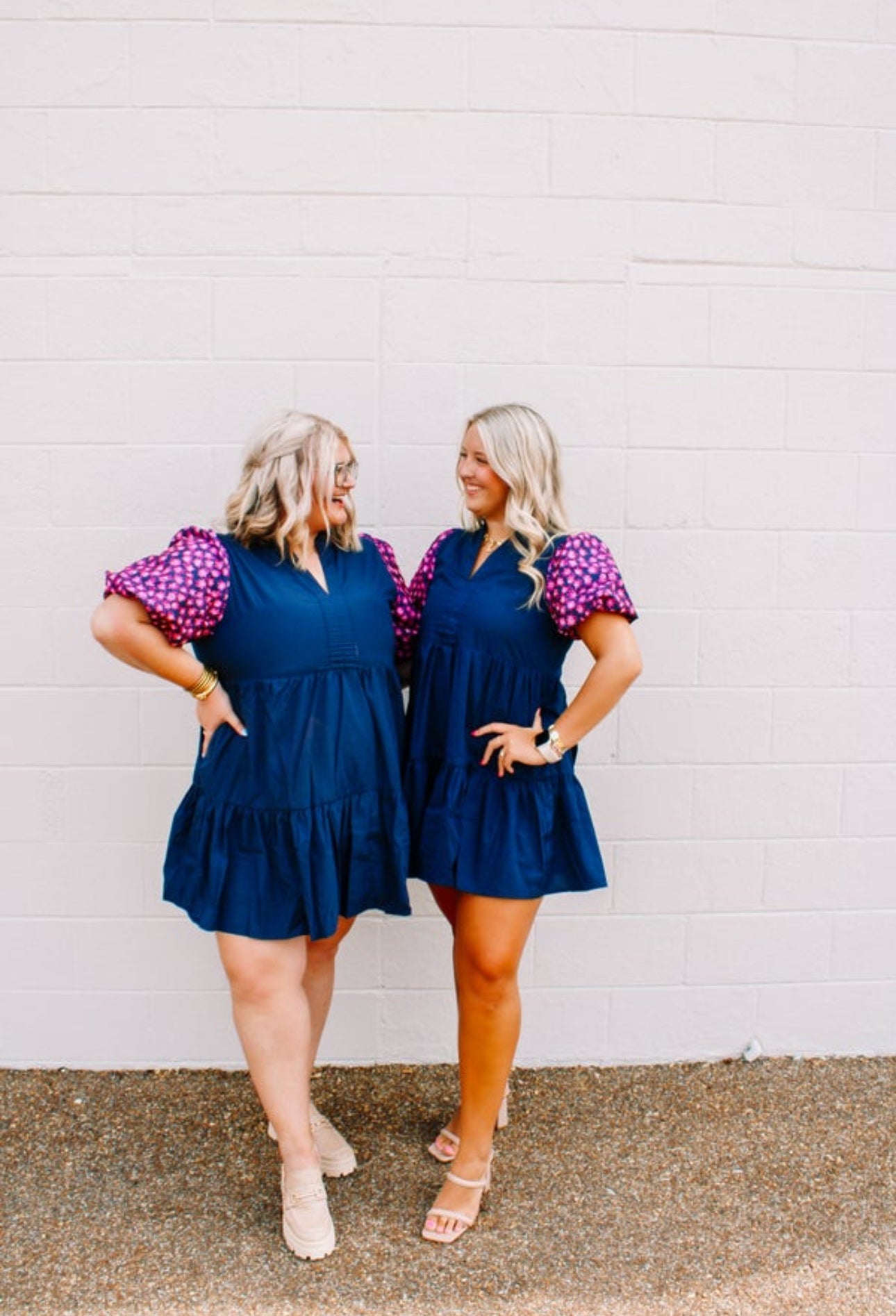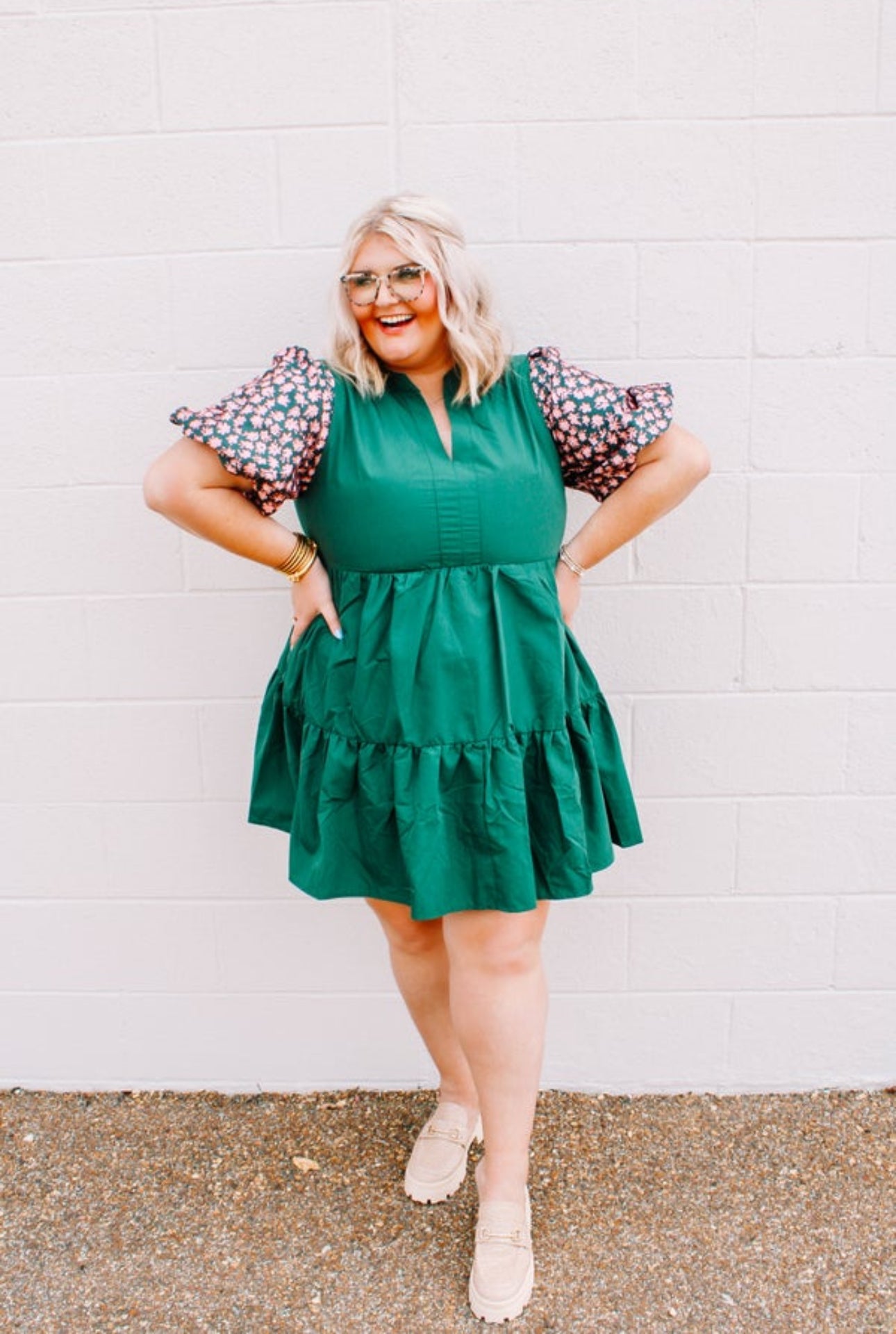Solid v-neck bubble sleeve tiered mini dress featuring contrasting floral sleeve. Elastic at cuff. Pocket at sides. Lined. Woven. Non-sheer. Lightweight.