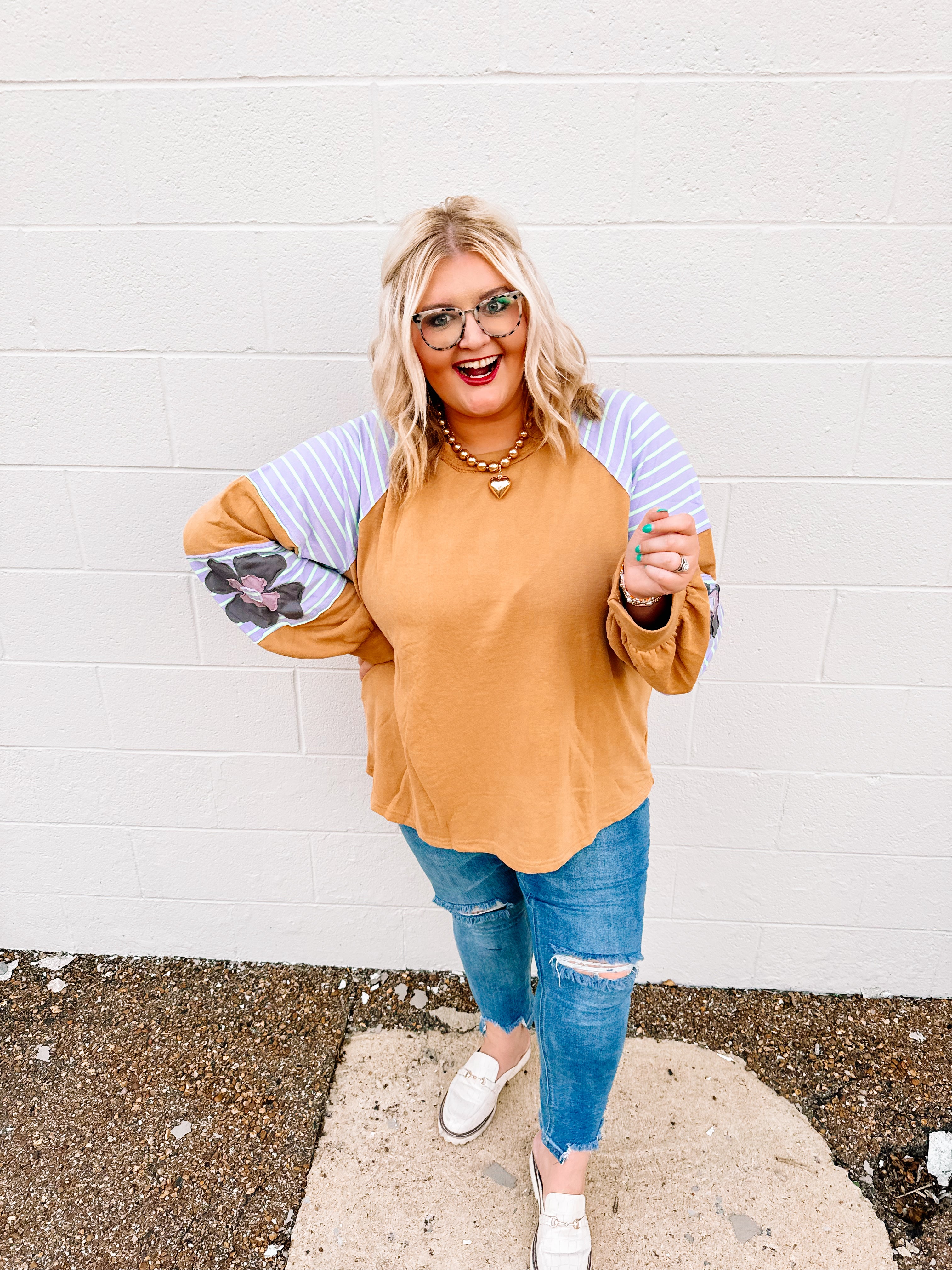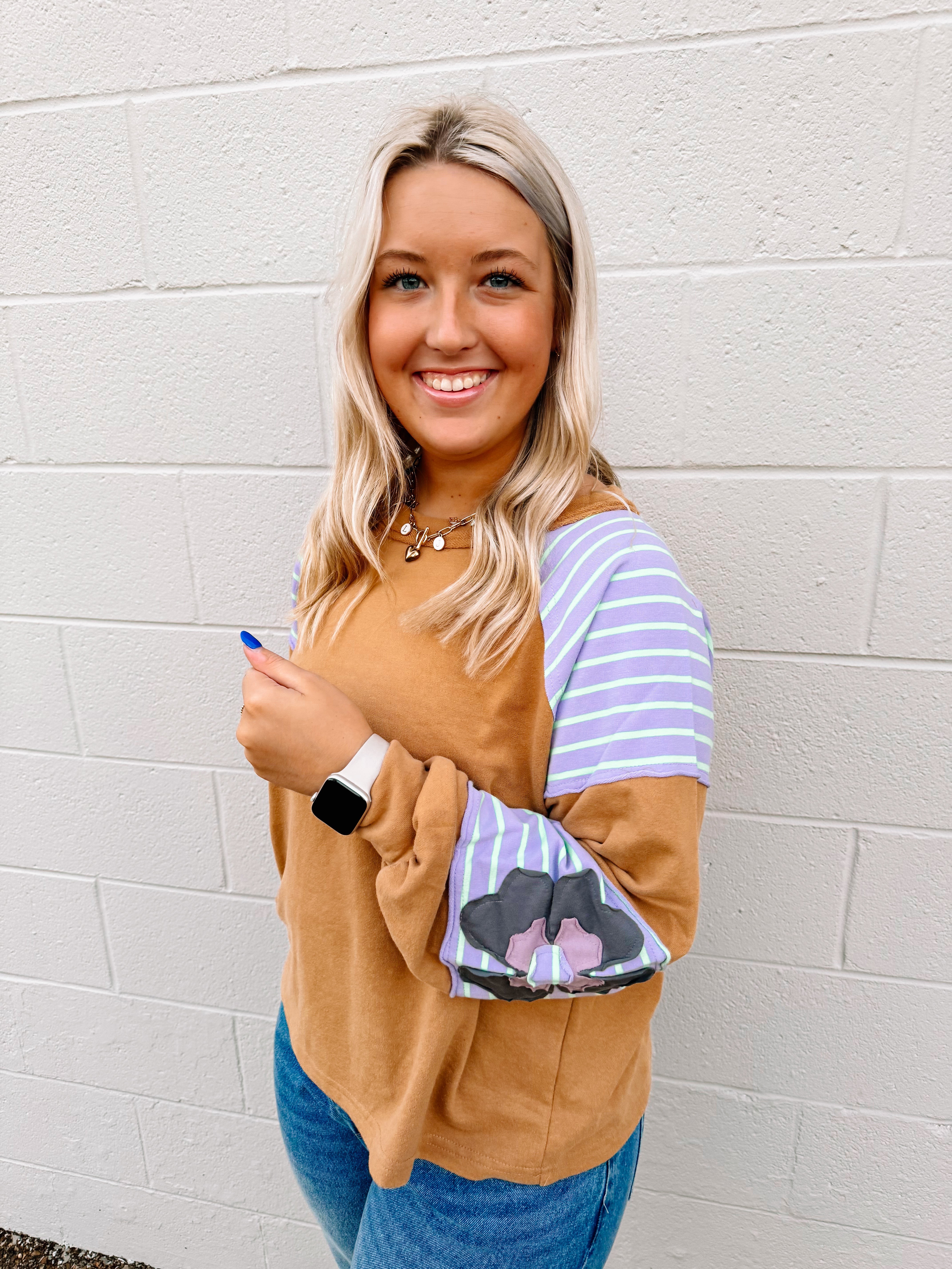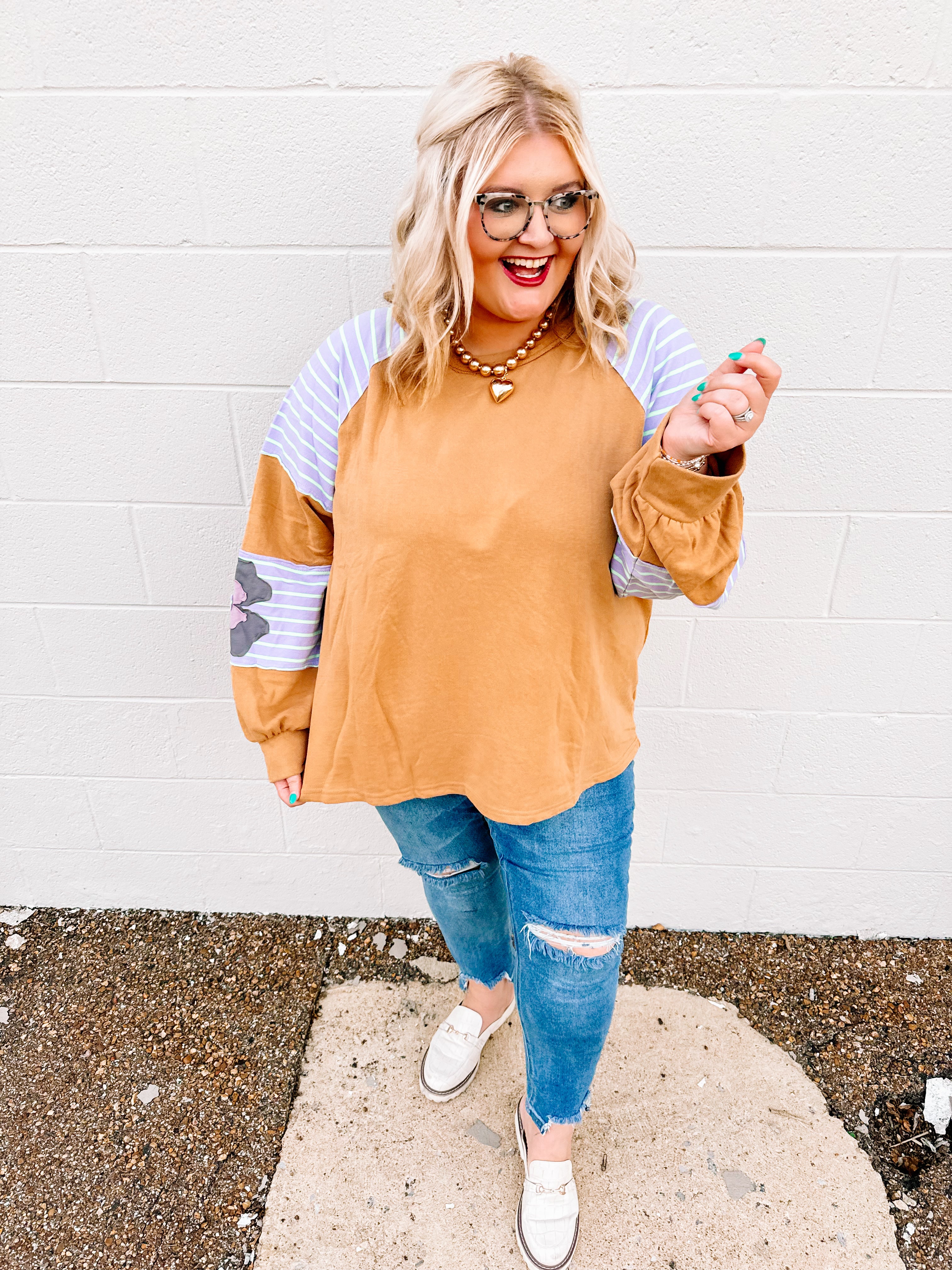 We love love love this top! We love the oversized fit and these colors pair so perfectly together to give us all our inner boho needs and wants! This top is featuring a french terry pullover with seam detailing and contrasting colors.