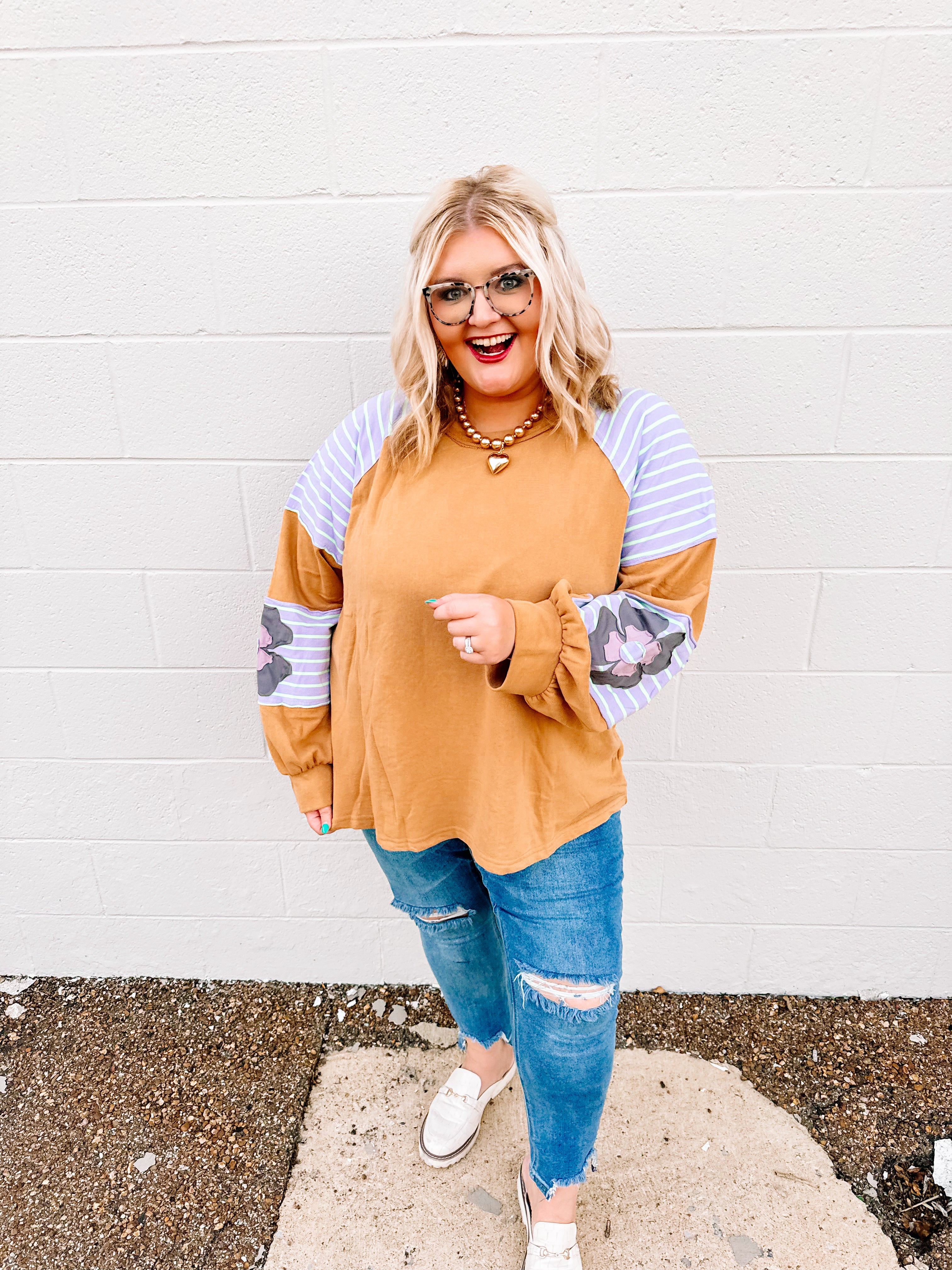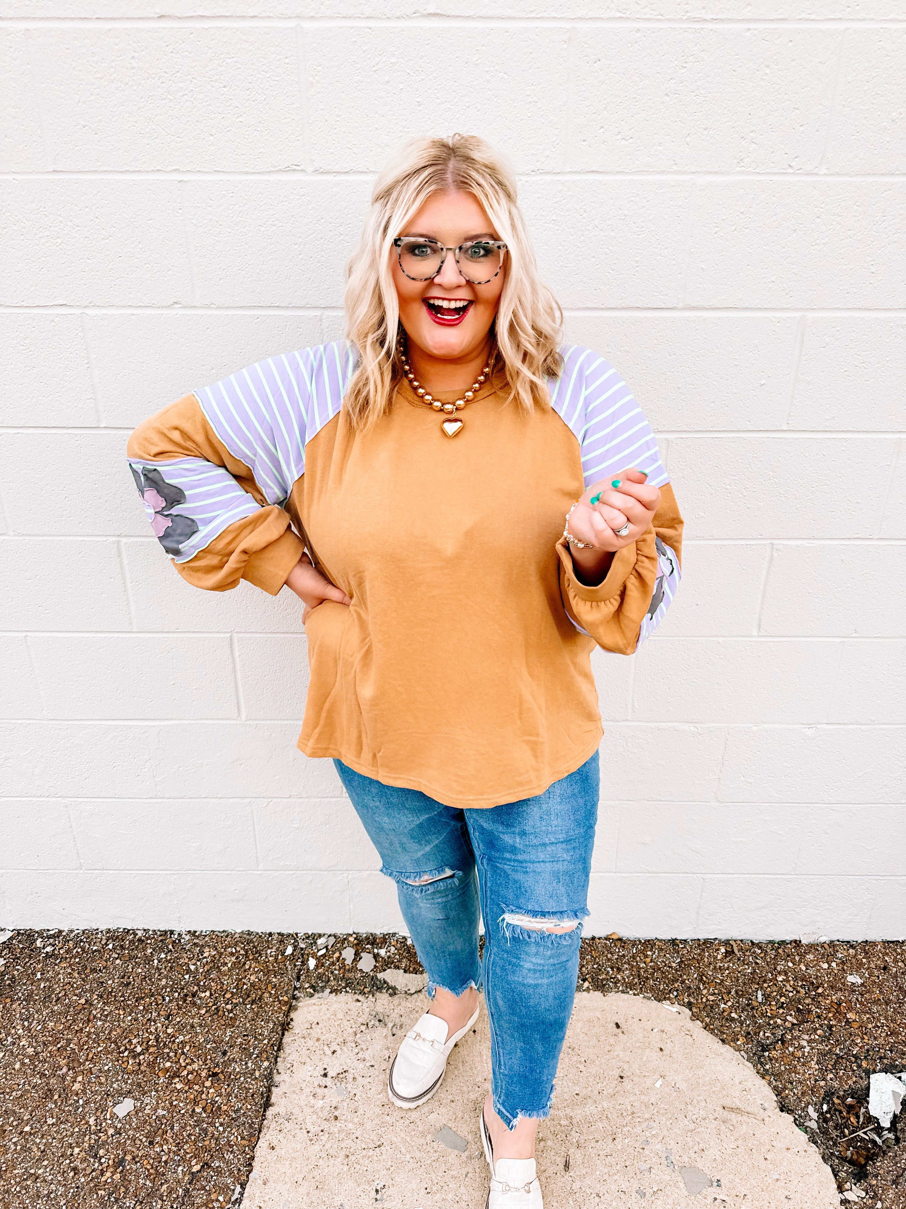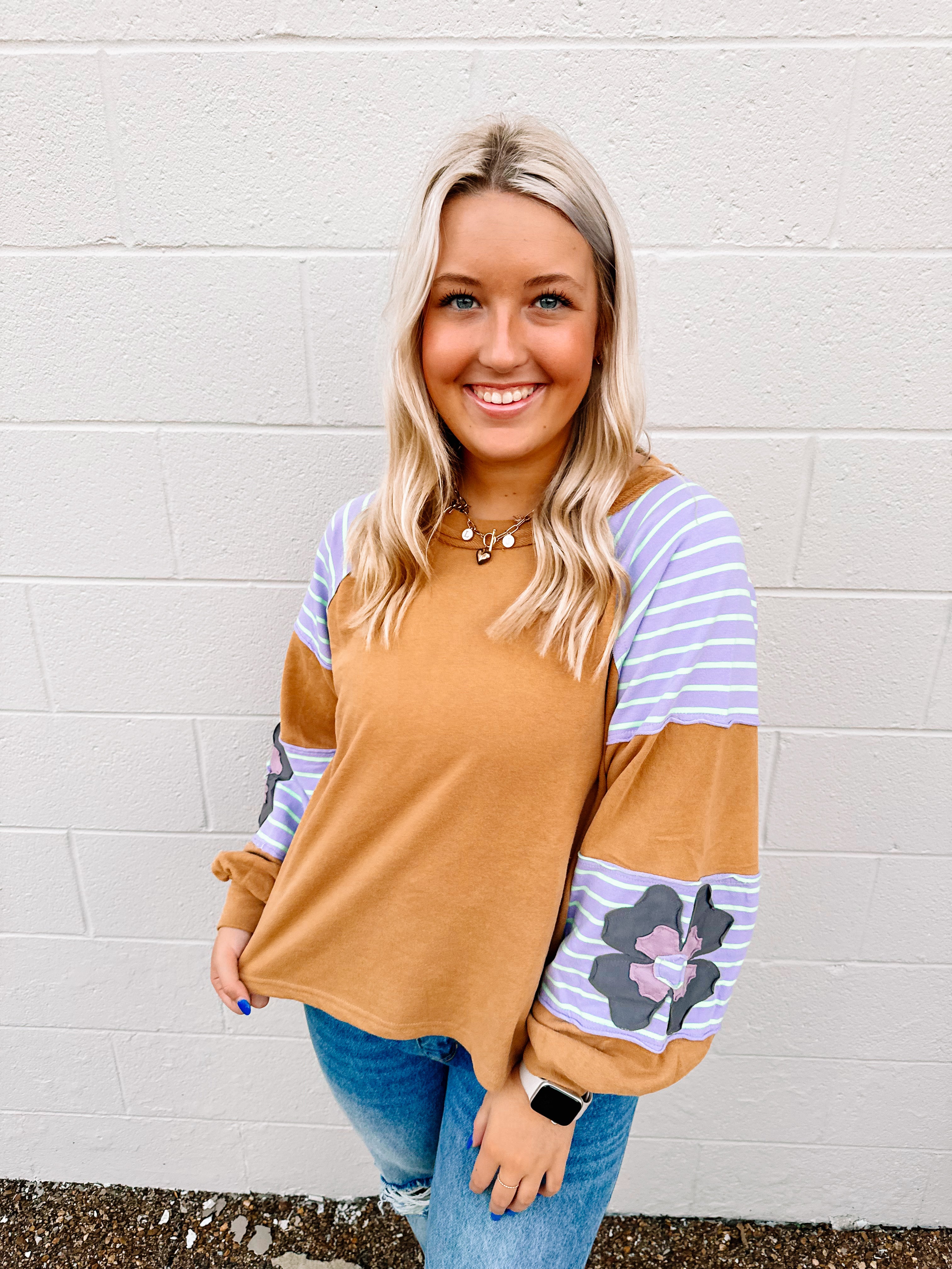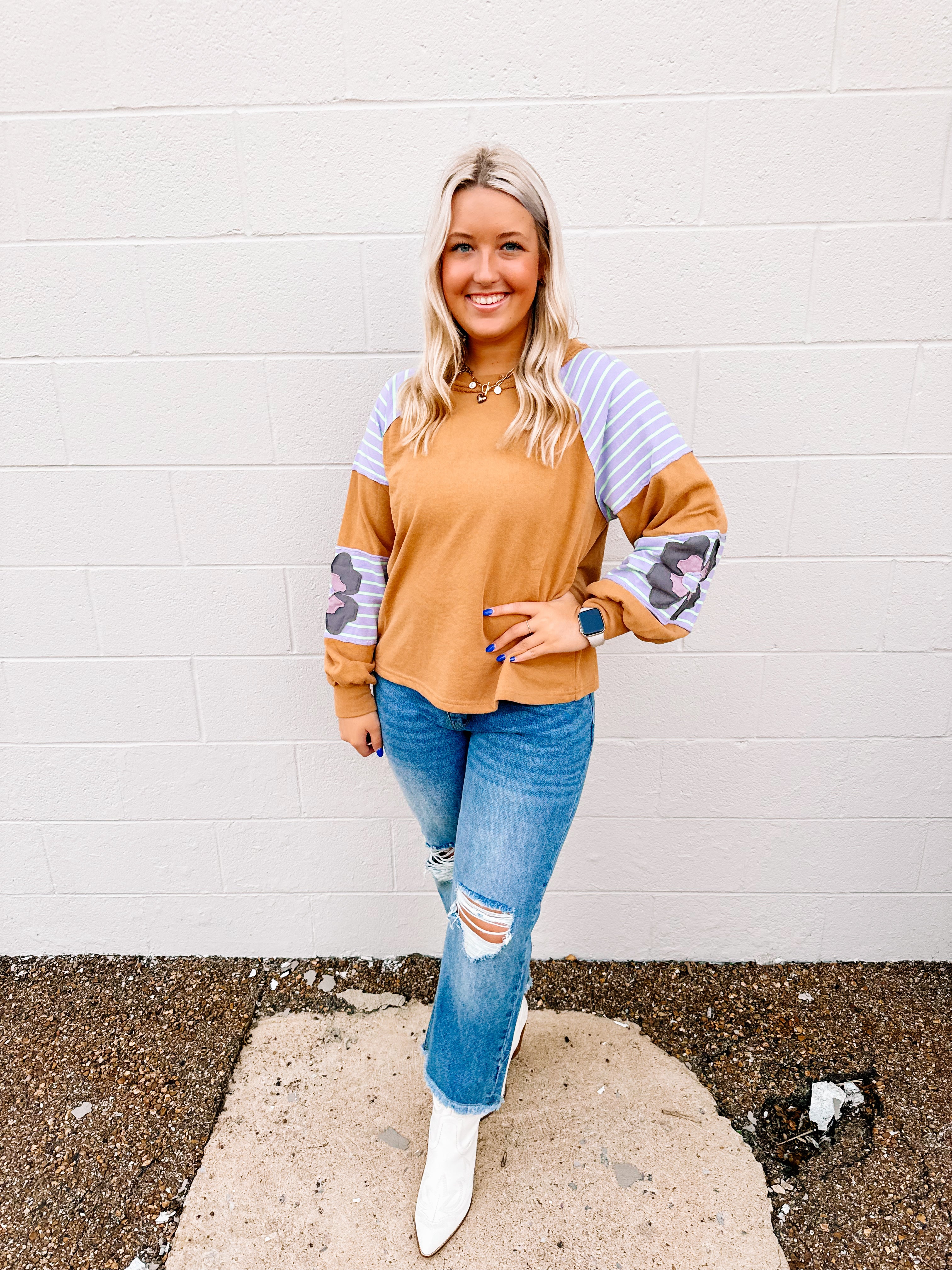We love love love this top! We love the oversized fit and these colors pair so perfectly together to give us all our inner boho needs and wants! This top is featuring a french terry pullover with seam detailing and contrasting colors.