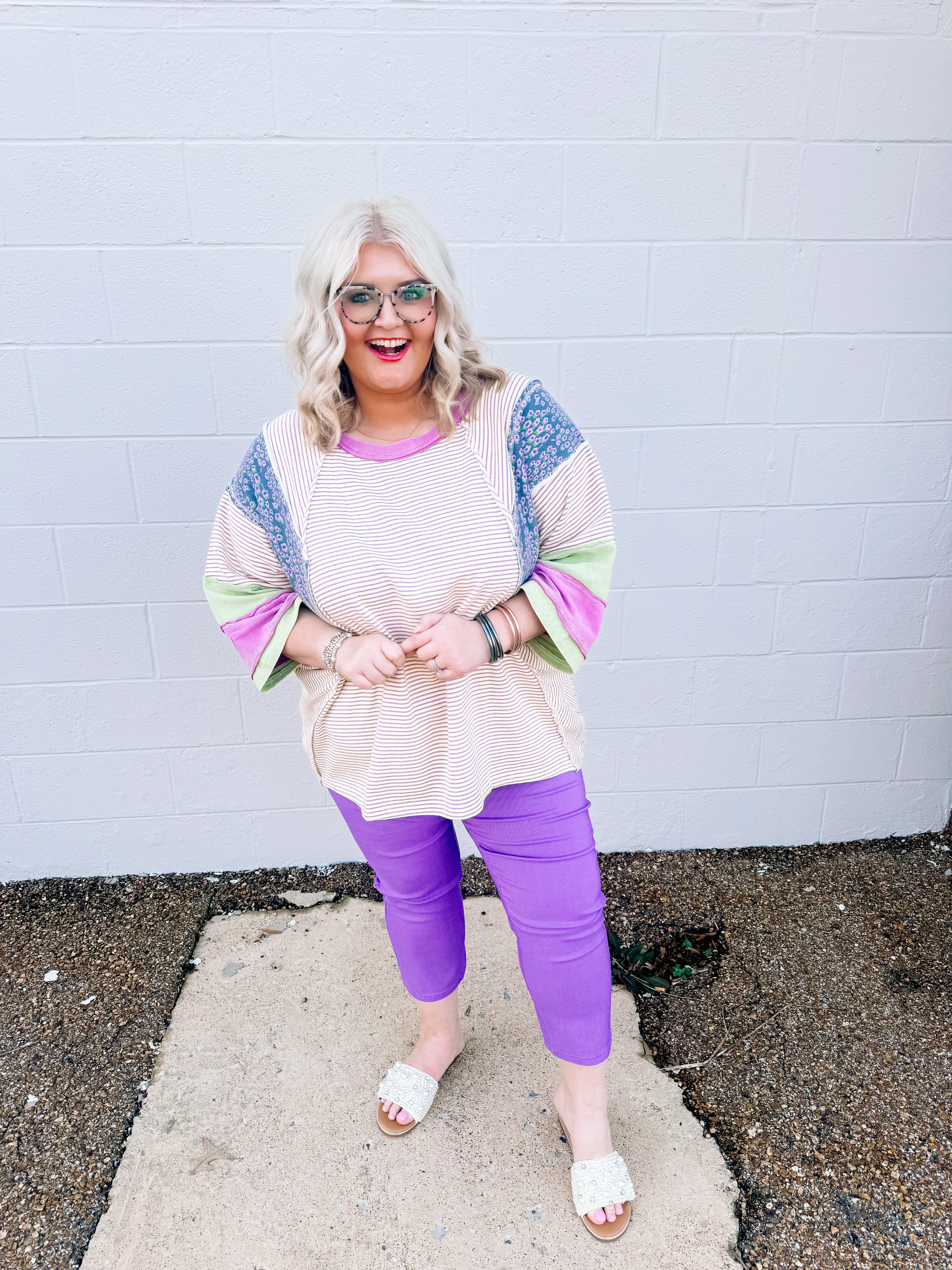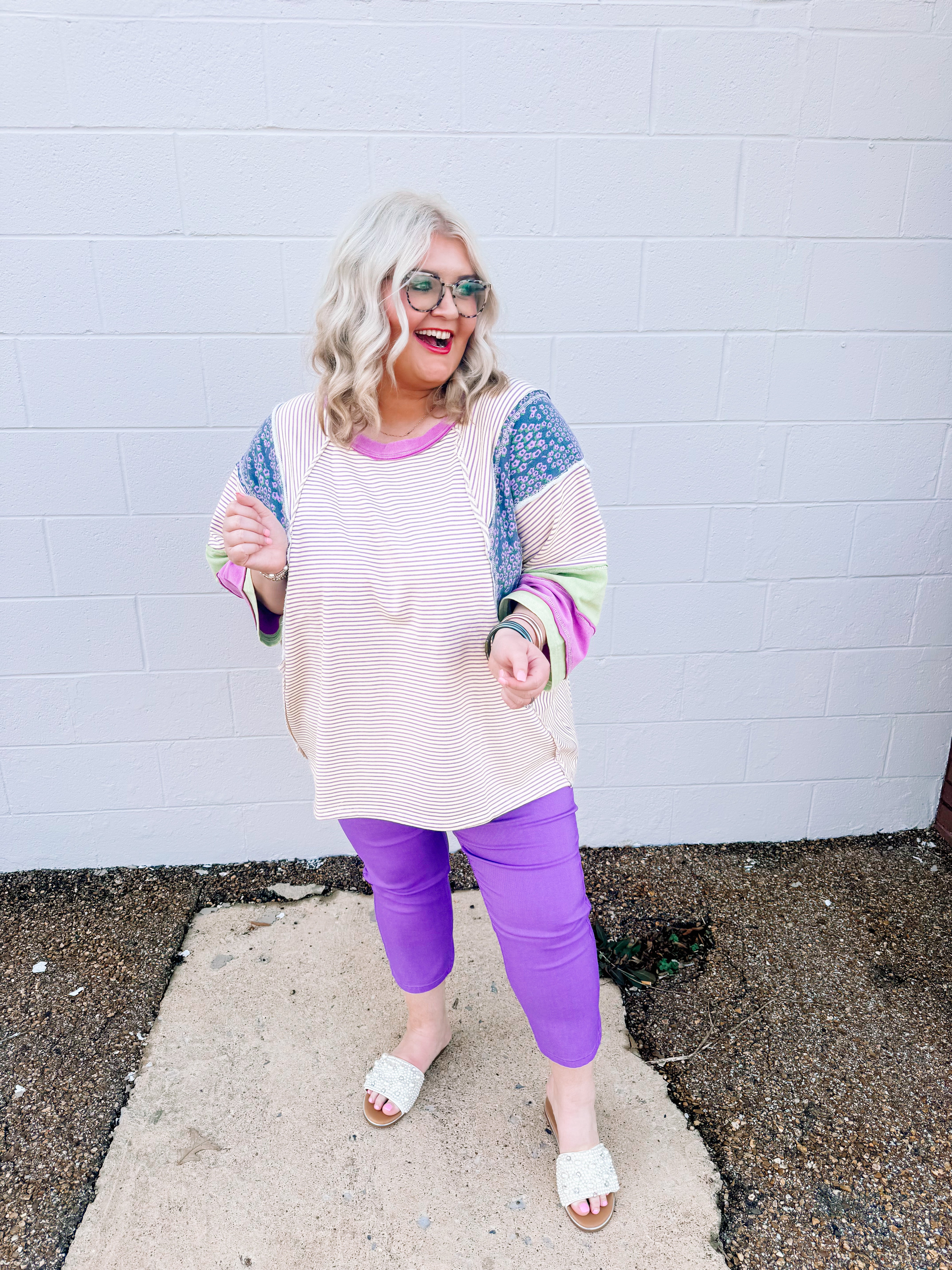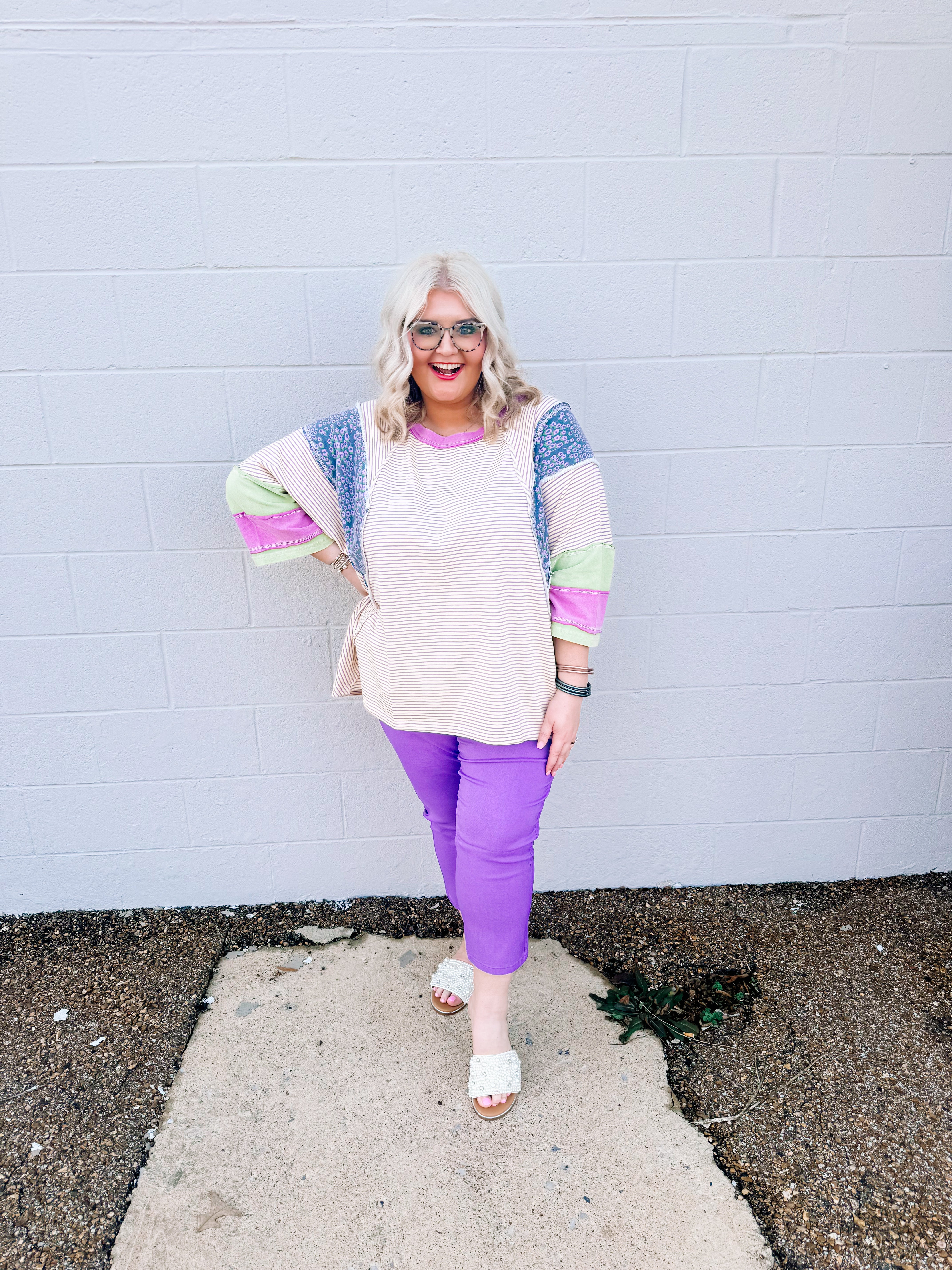 This is one of Madison's favorite top! We love how boho and fun it looks and she's perfect for the Spring season. Our Berry Good time top is a 3/4 sleeve with striped and patchwork!