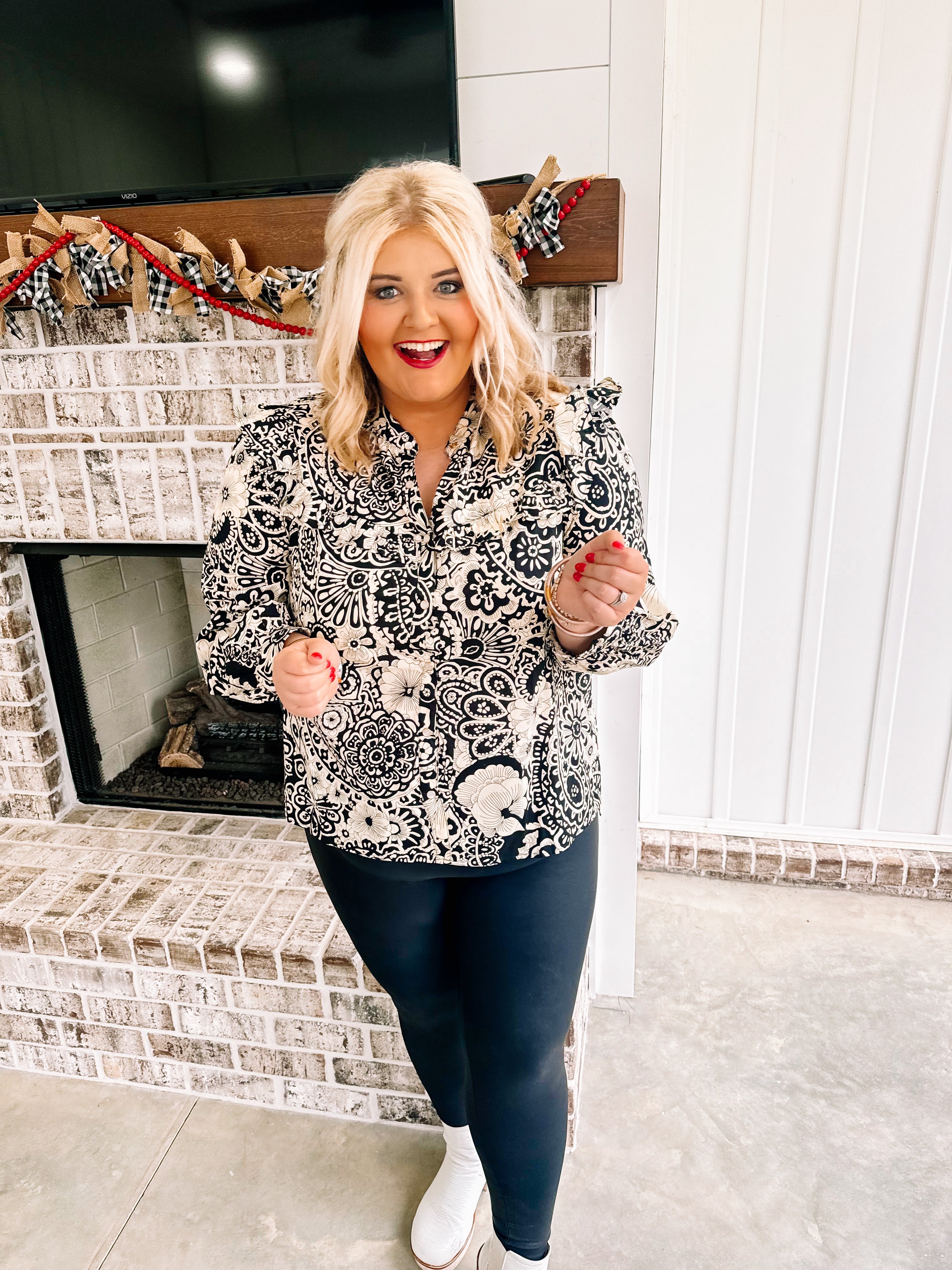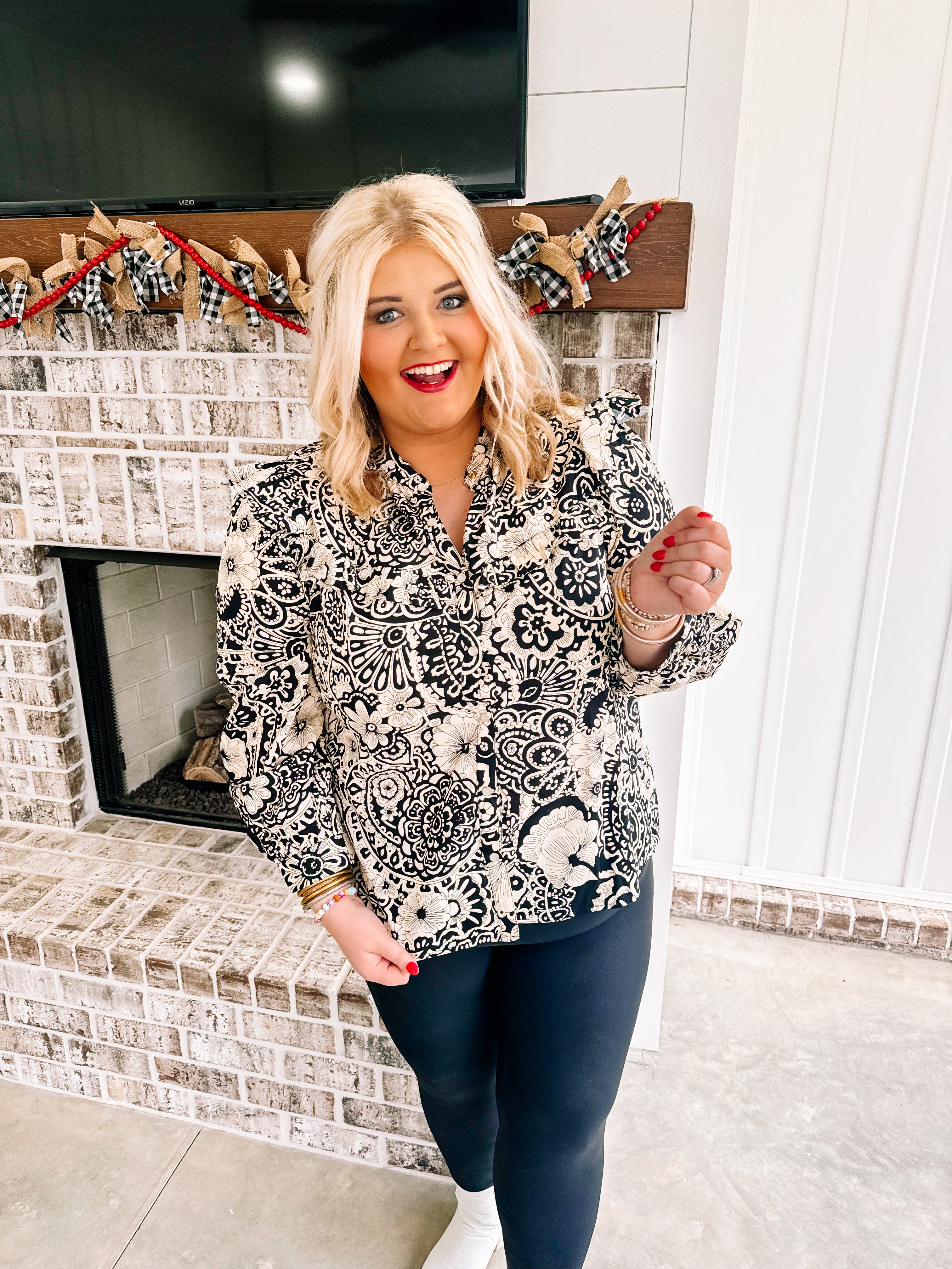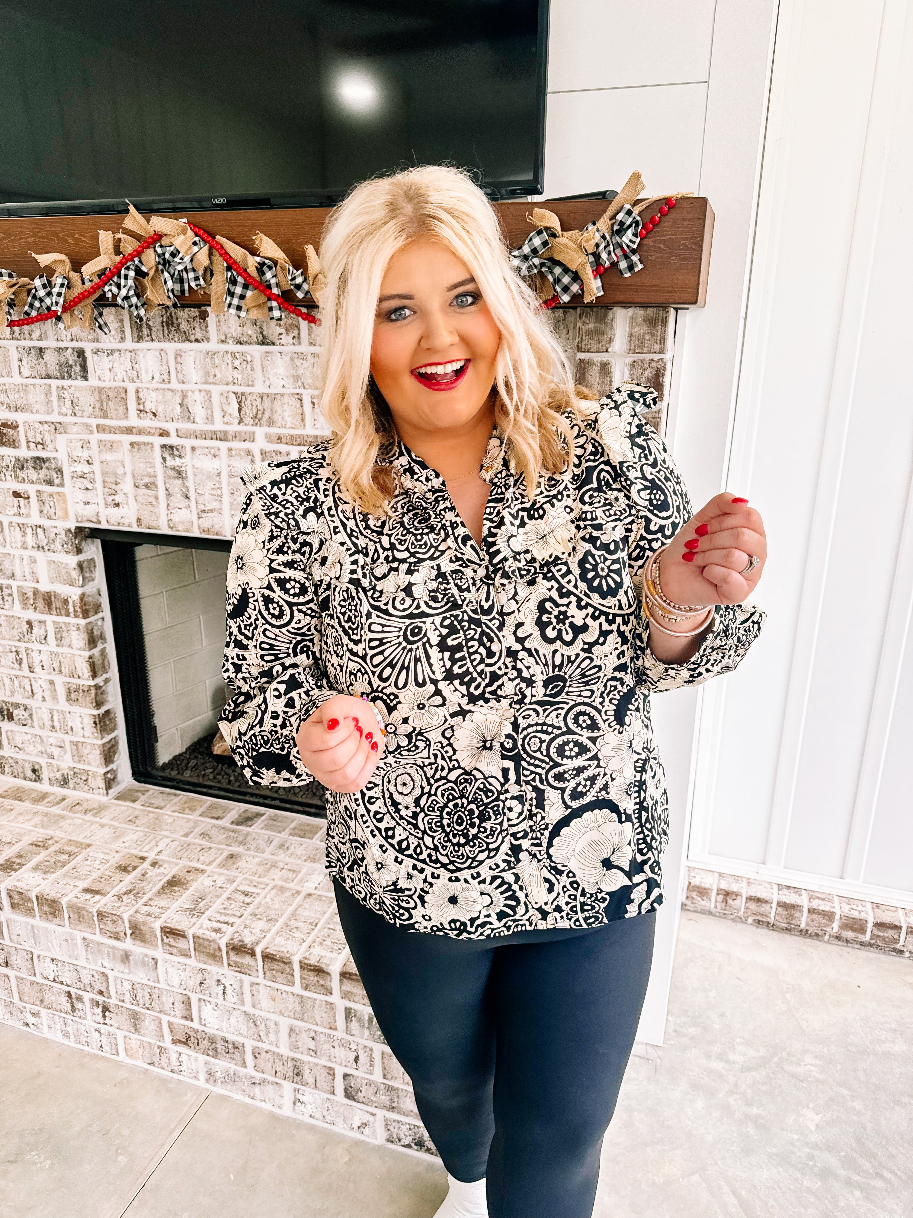 We are all loving the Ginger Jar style! A black style is perfect for the Holiday season to pair with colored pants. Its a two style button down top with flutter sleeve and has pearl snap buttons.