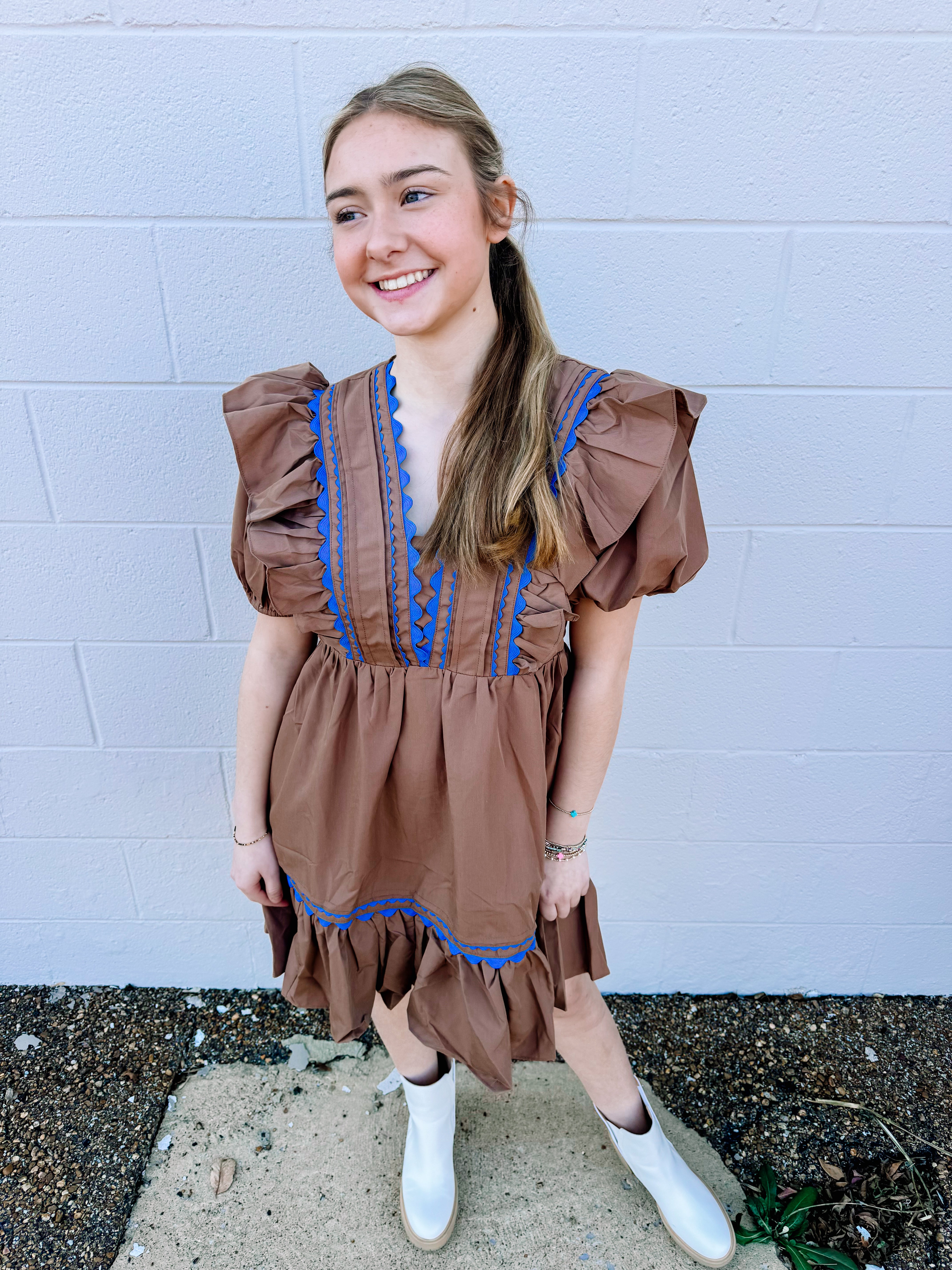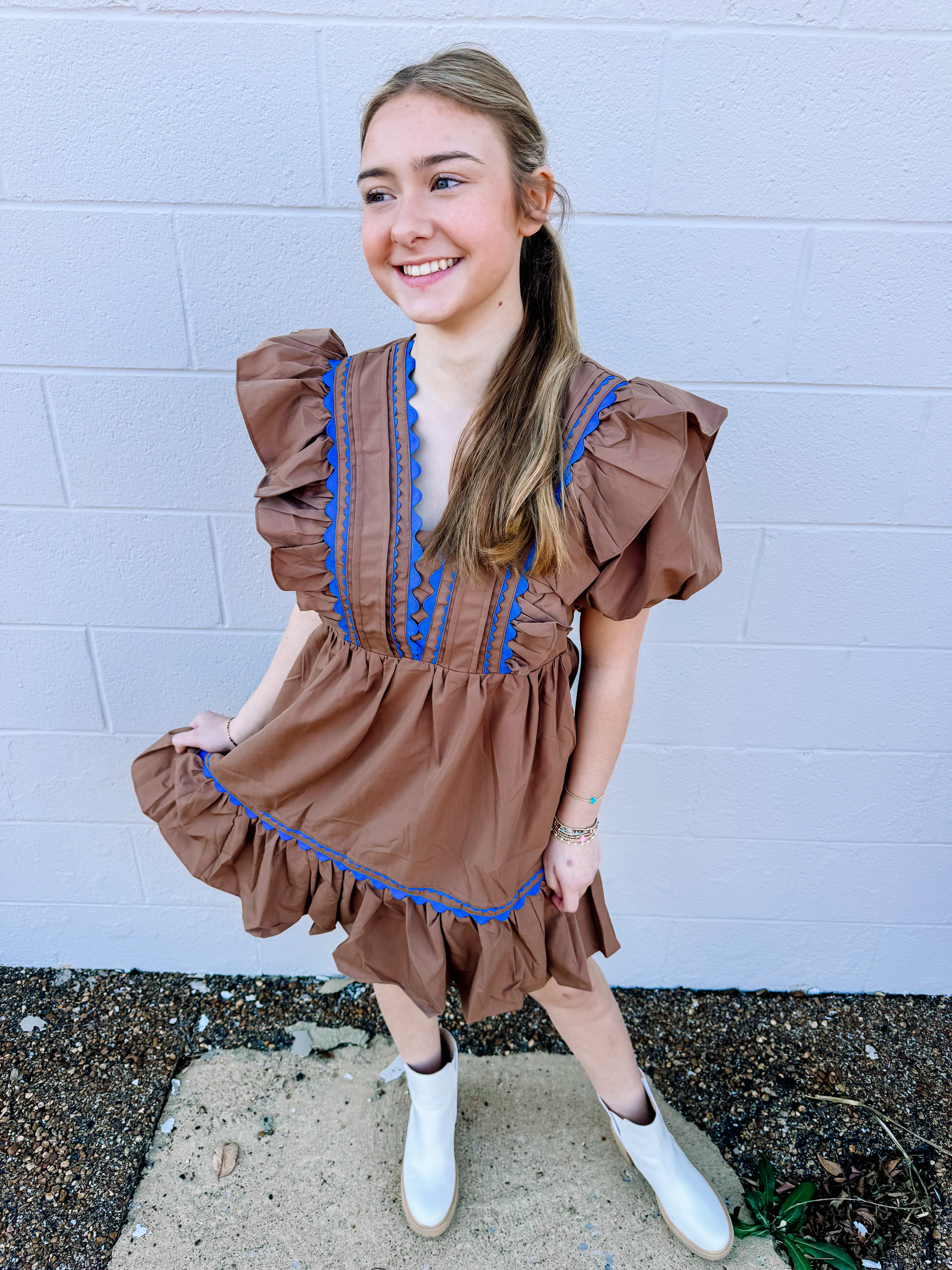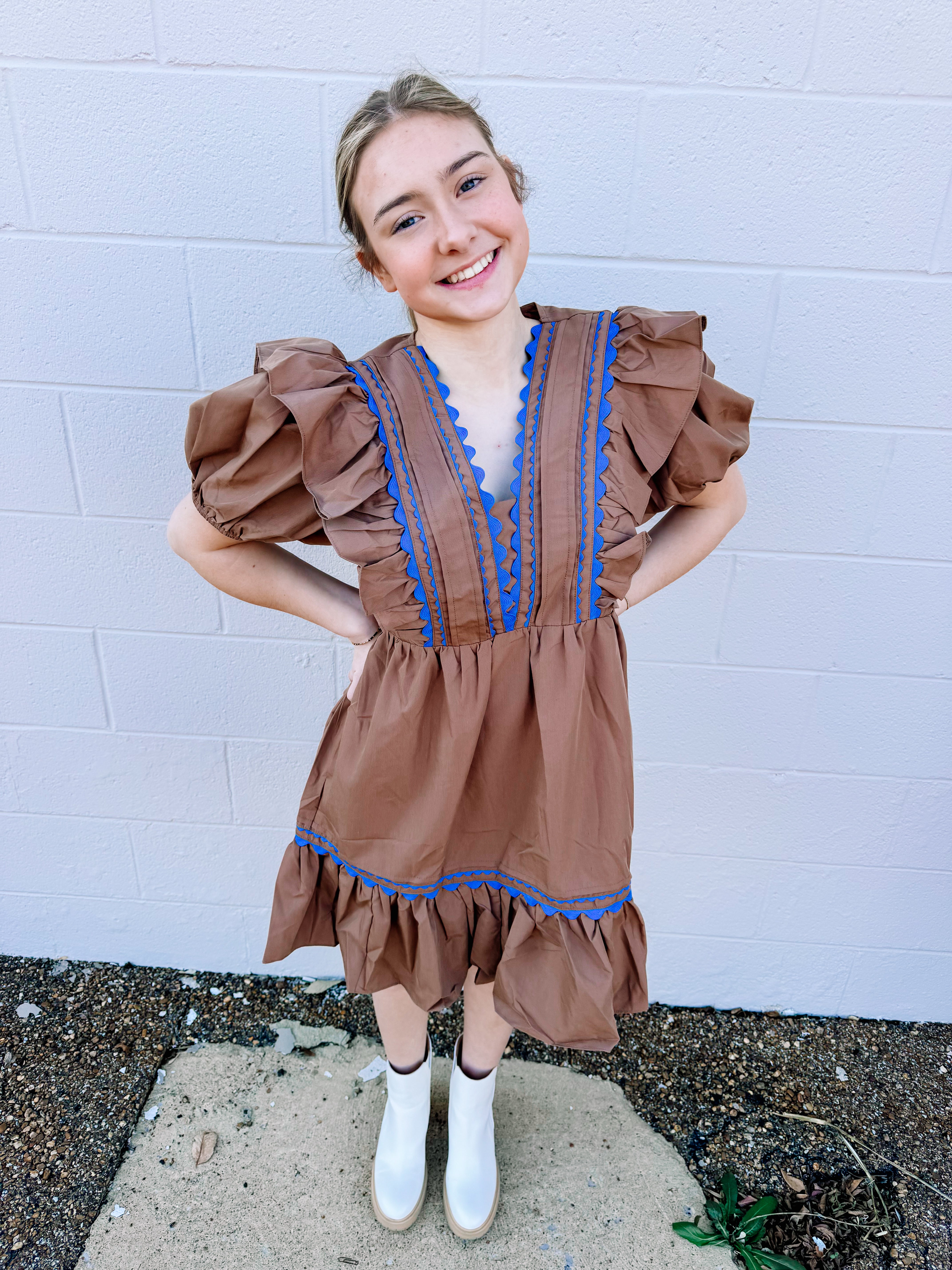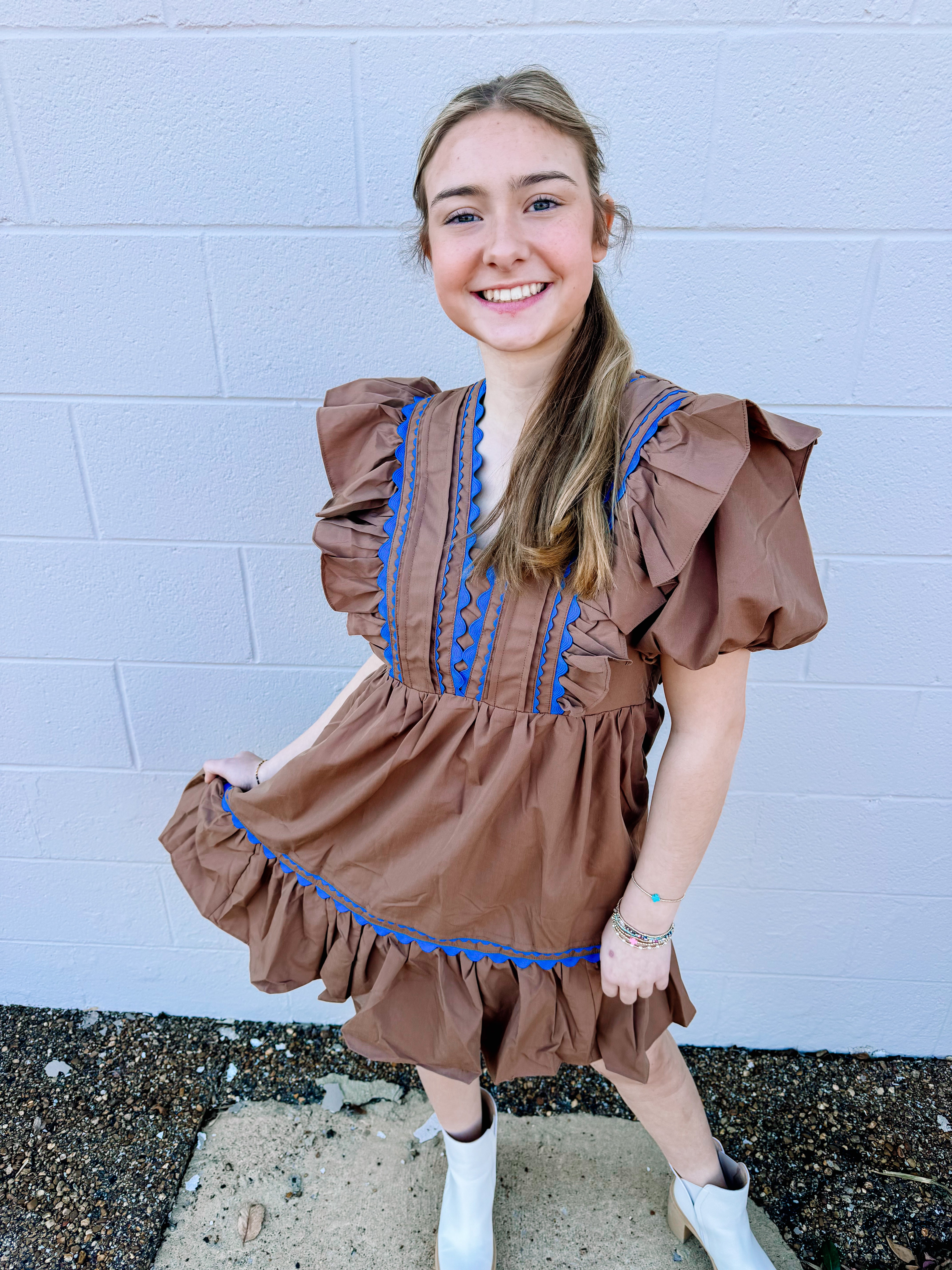 We are loving Brown and Blue together! They make the prettiest look. This dress is stunning and absolutely breath taking. The Bobbi Jack dress is featuring; a Solid short puff sleeve v-neck ruffled mini dress featuring pockets at side. Contrasting scalloped trim detail. Lined. Woven. Non-sheer. Lightweight.