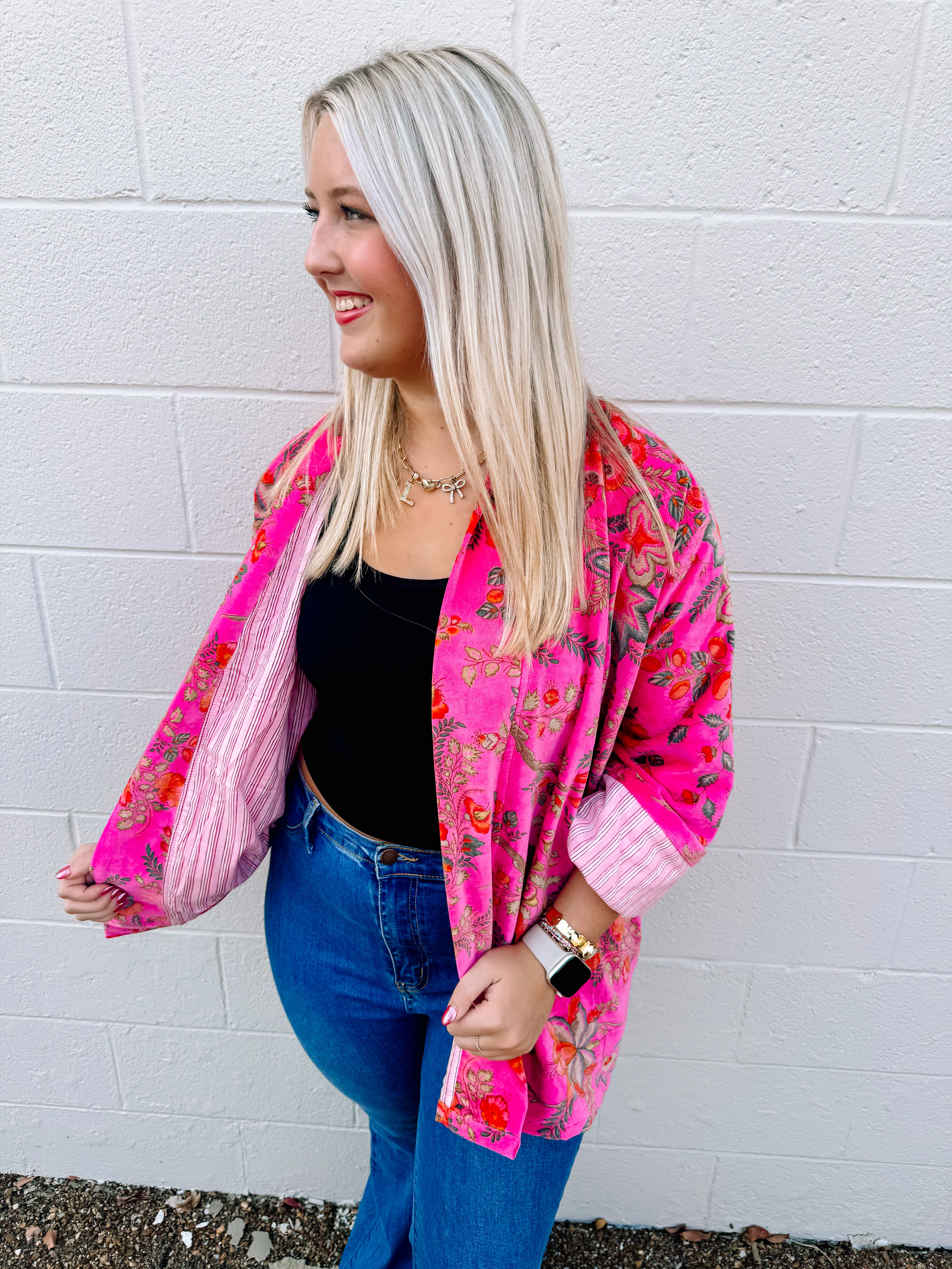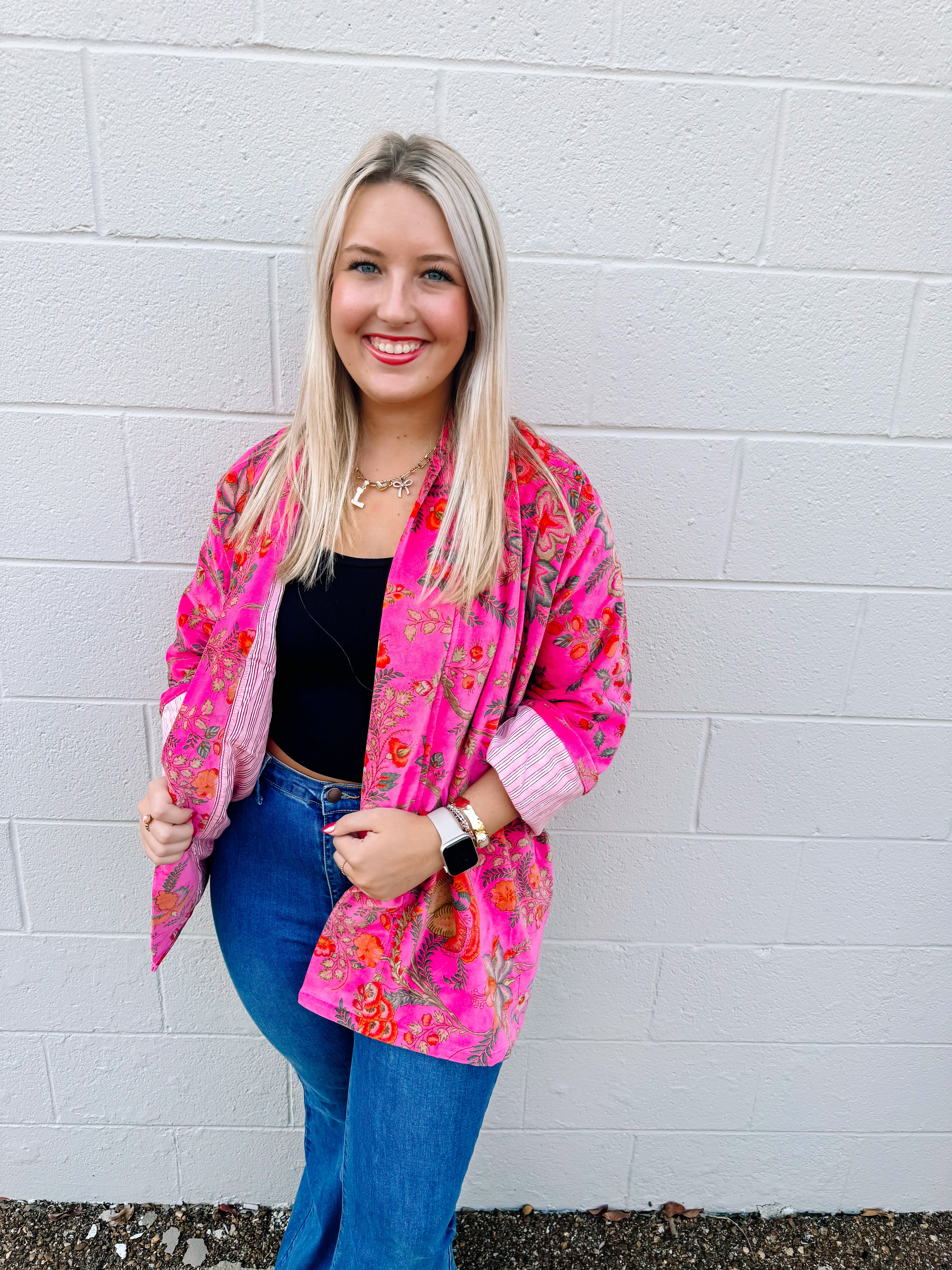 The Penny velvet jacket is a lounge style reversible jacket made from a mix of vintage velvet and striped cotton. This rock and roll staple has deep pockets and can be paired back with sneaks, boots or heels. Size up for an oversized feel.