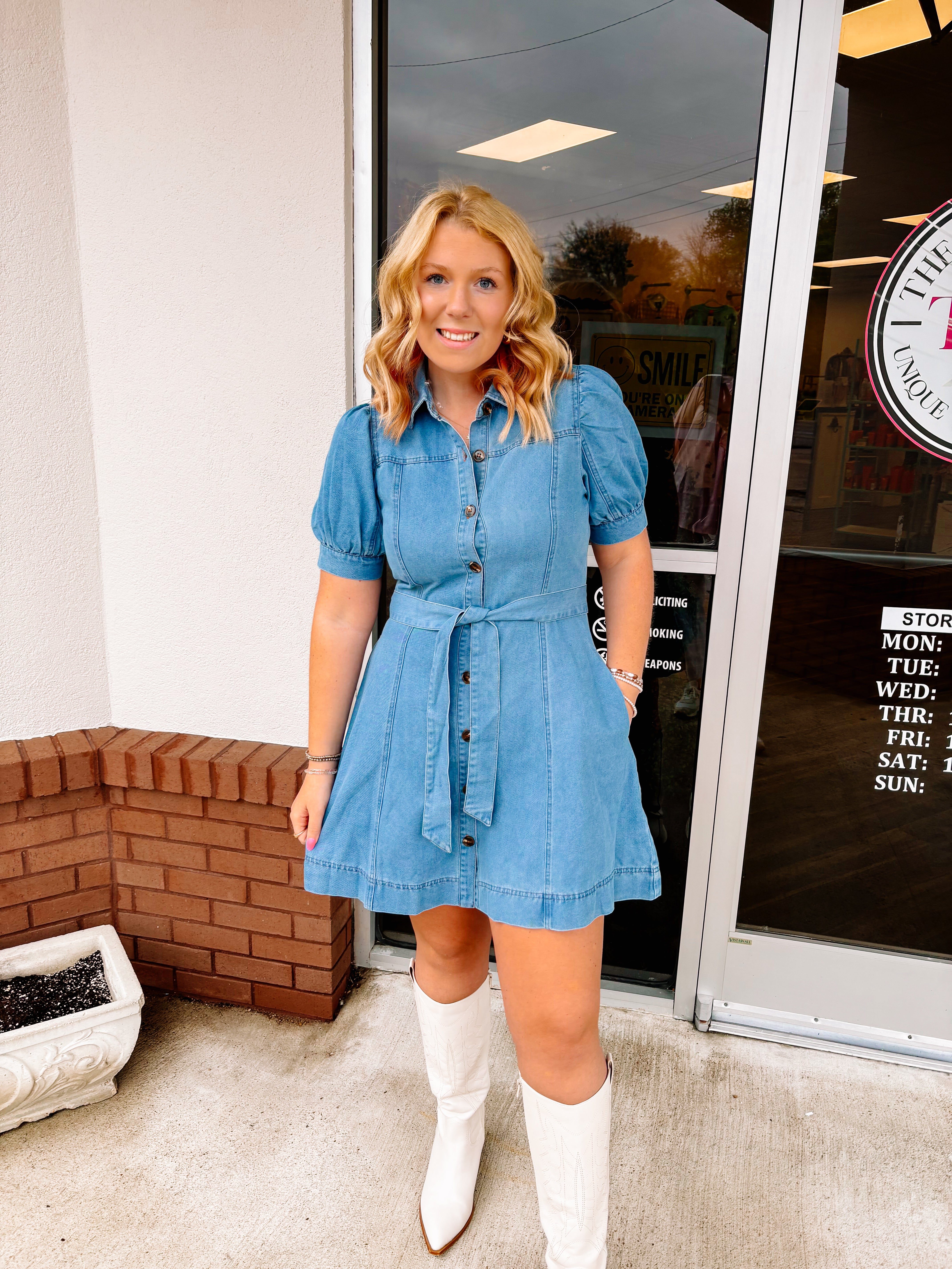 Welcome to The Denim Daze Dress. This denim dress is perfect for all of the girls. Wear it now or into the fall.
