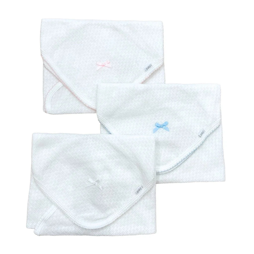 Solid white signature blanket with a  50/50 blend accented with a pink, blue or white bow by Paty.