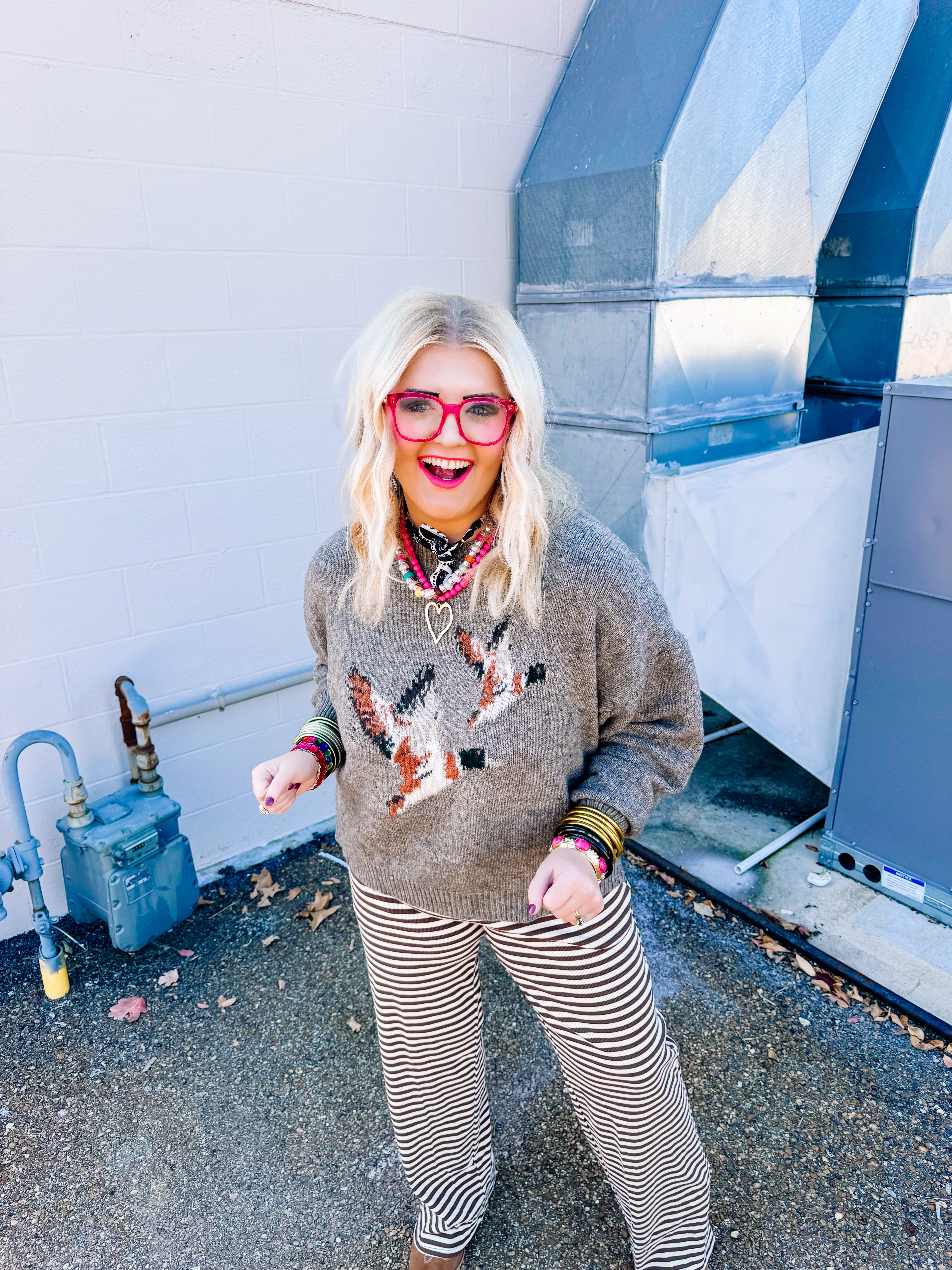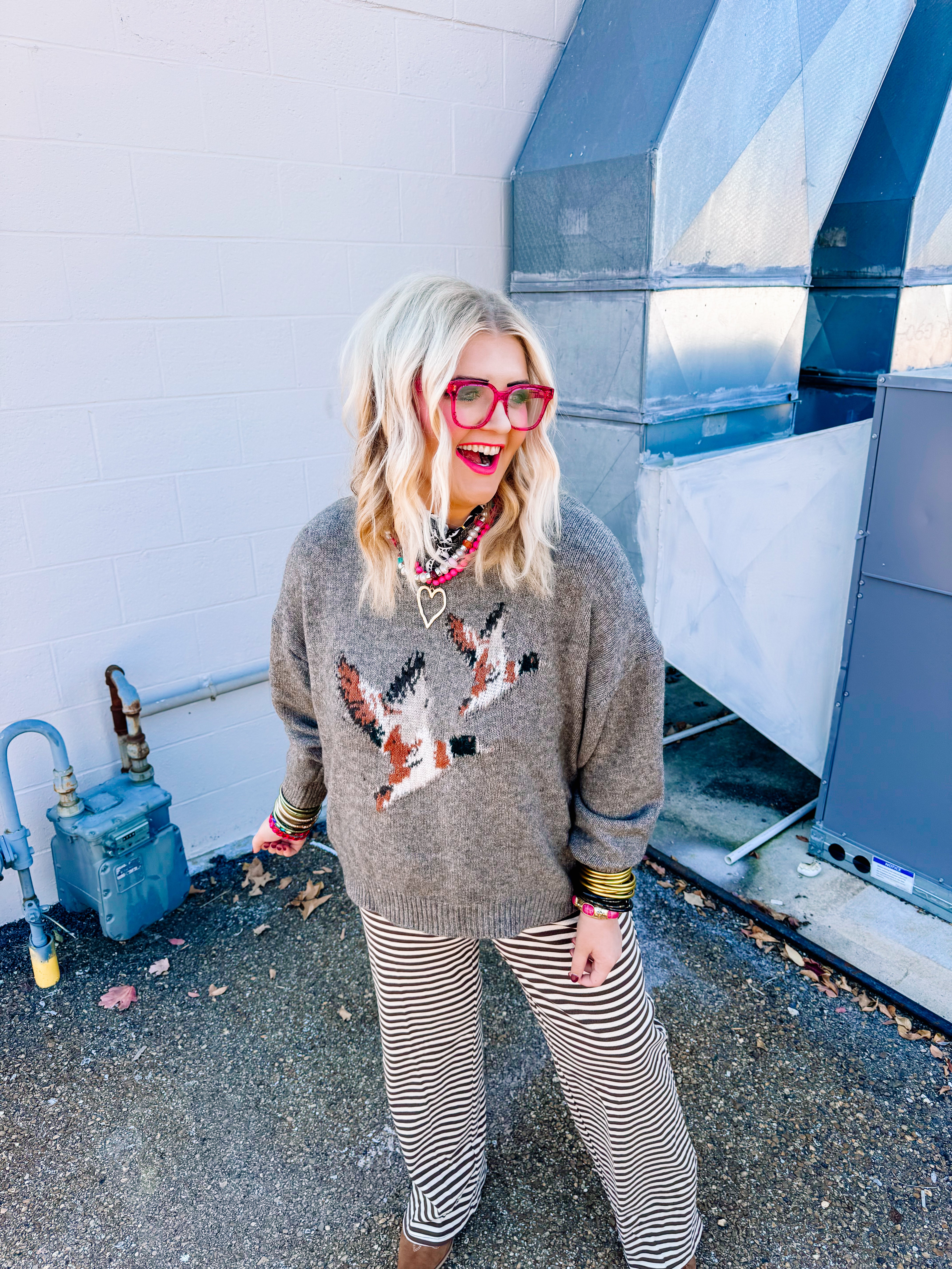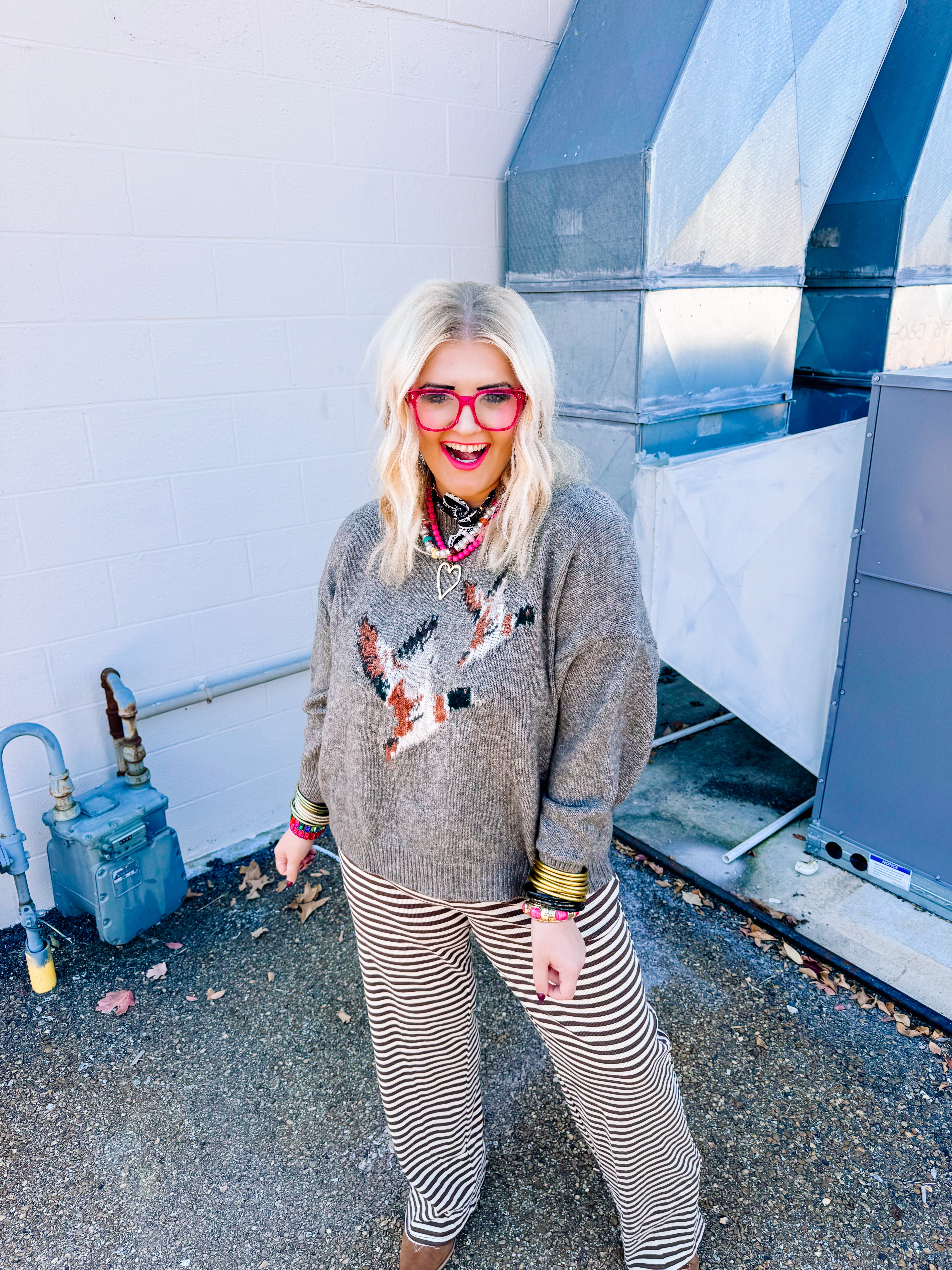Elevate your casual wardrobe with this distinctive Bailey Rose sweater, featuring a mocha base that pairs effortlessly with any ensemble. The whimsical flying duck motif adds personality and visual interest, making it an ideal choice for those who appreciate thoughtful design details. Crafted with quality construction, this piece delivers both comfort and style for everyday wear or layered looks. Perfect for transitional seasons, it's a versatile staple that bridges the gap between basic and statement-making knitwear.