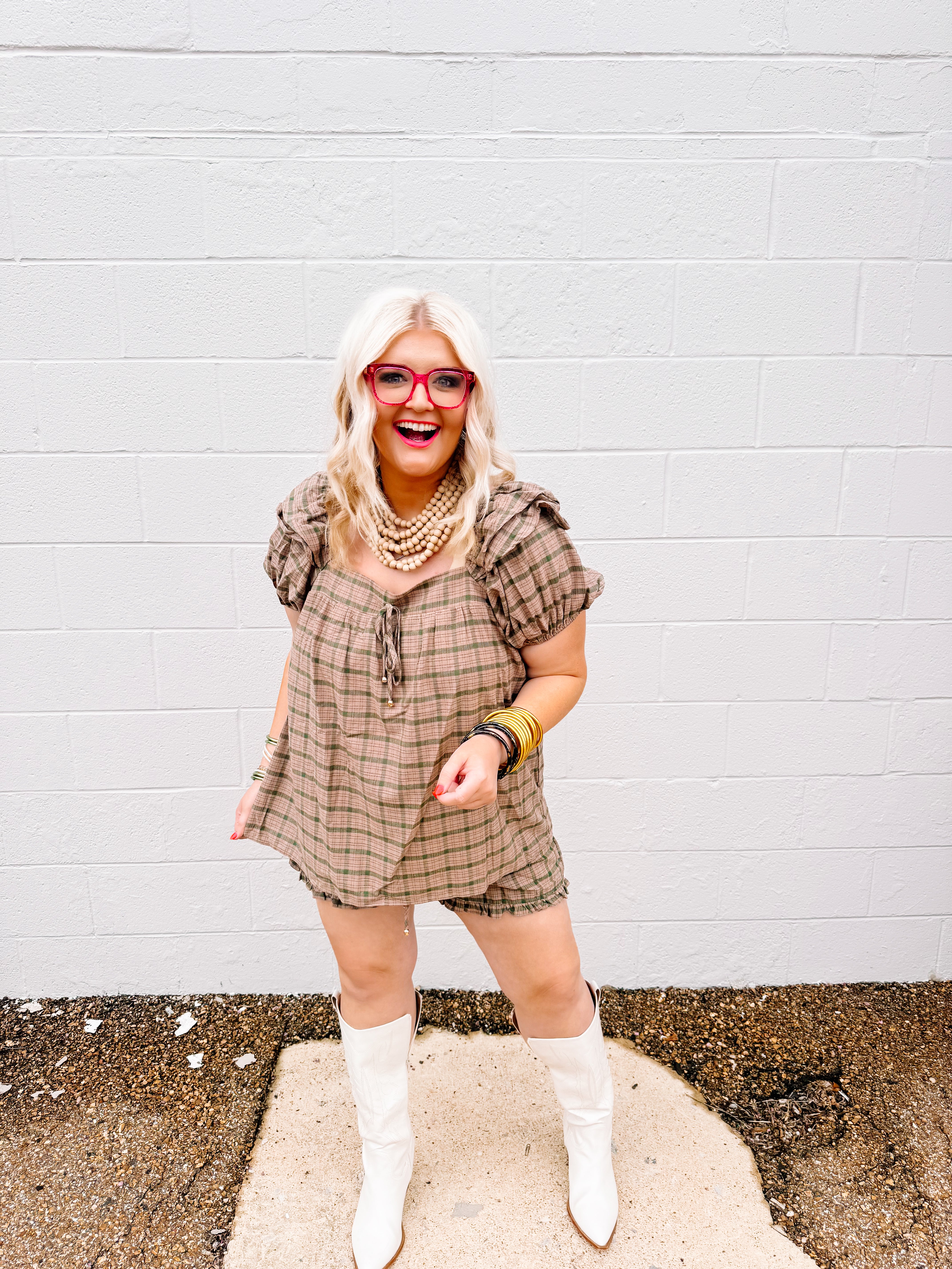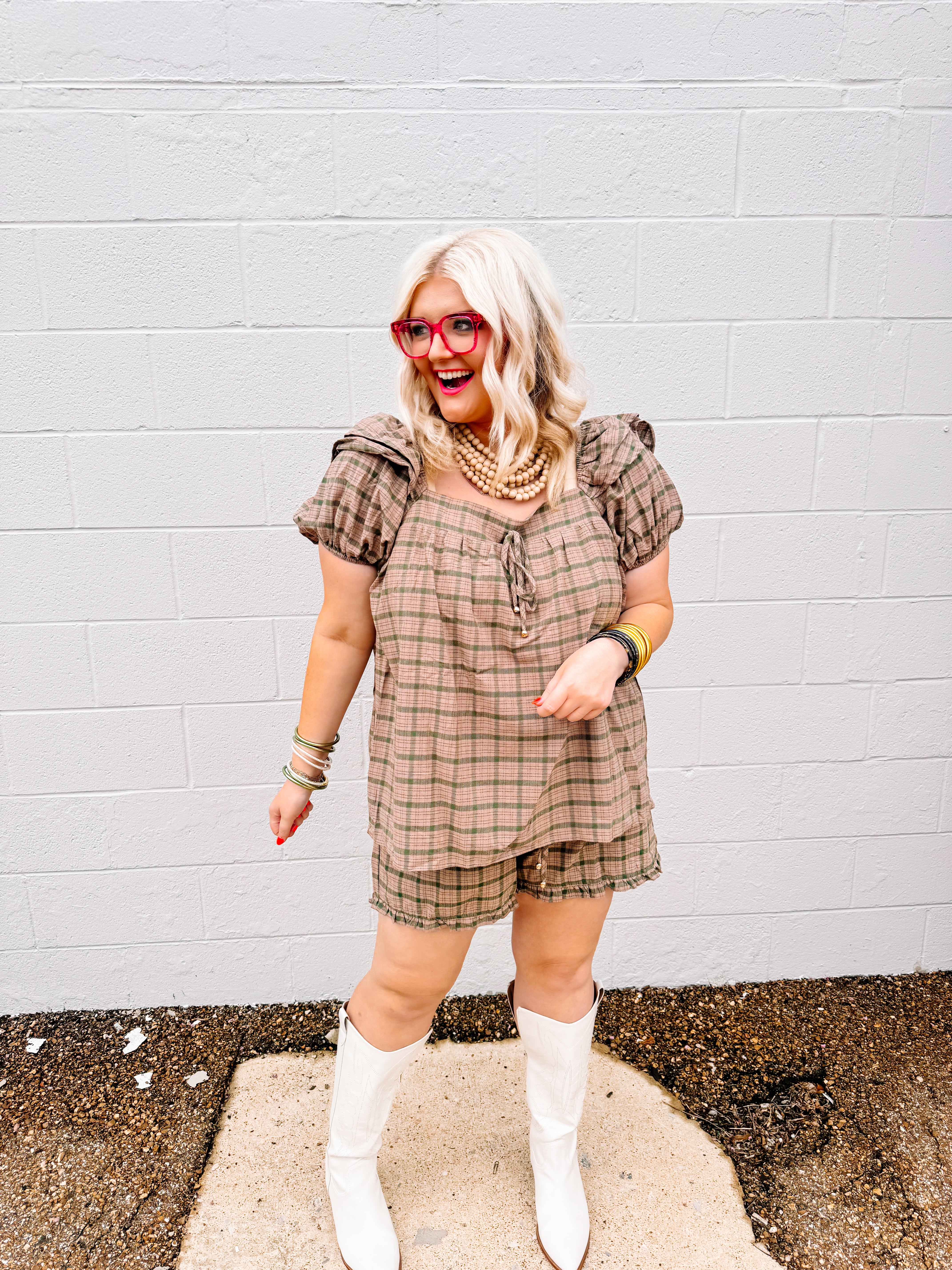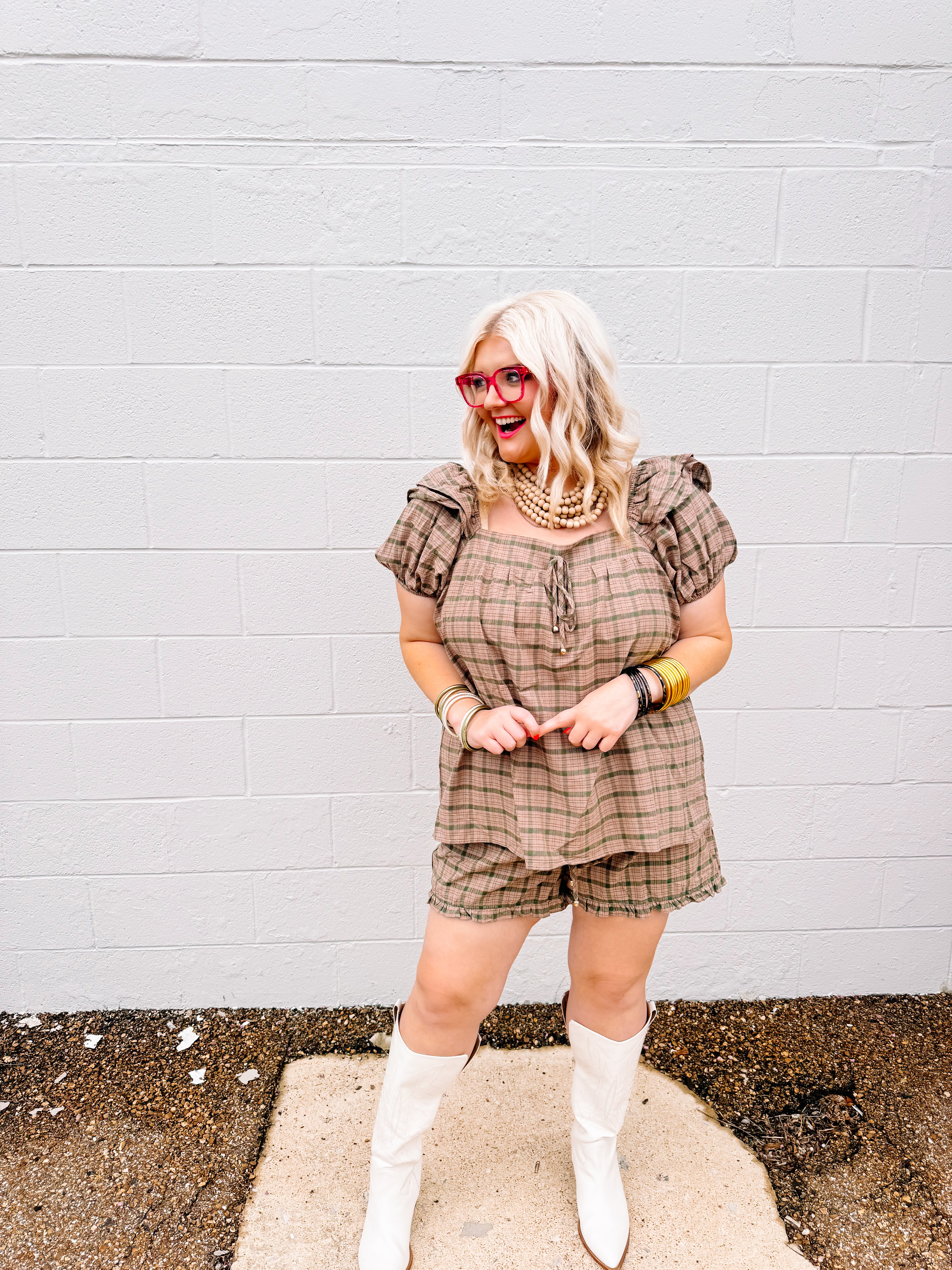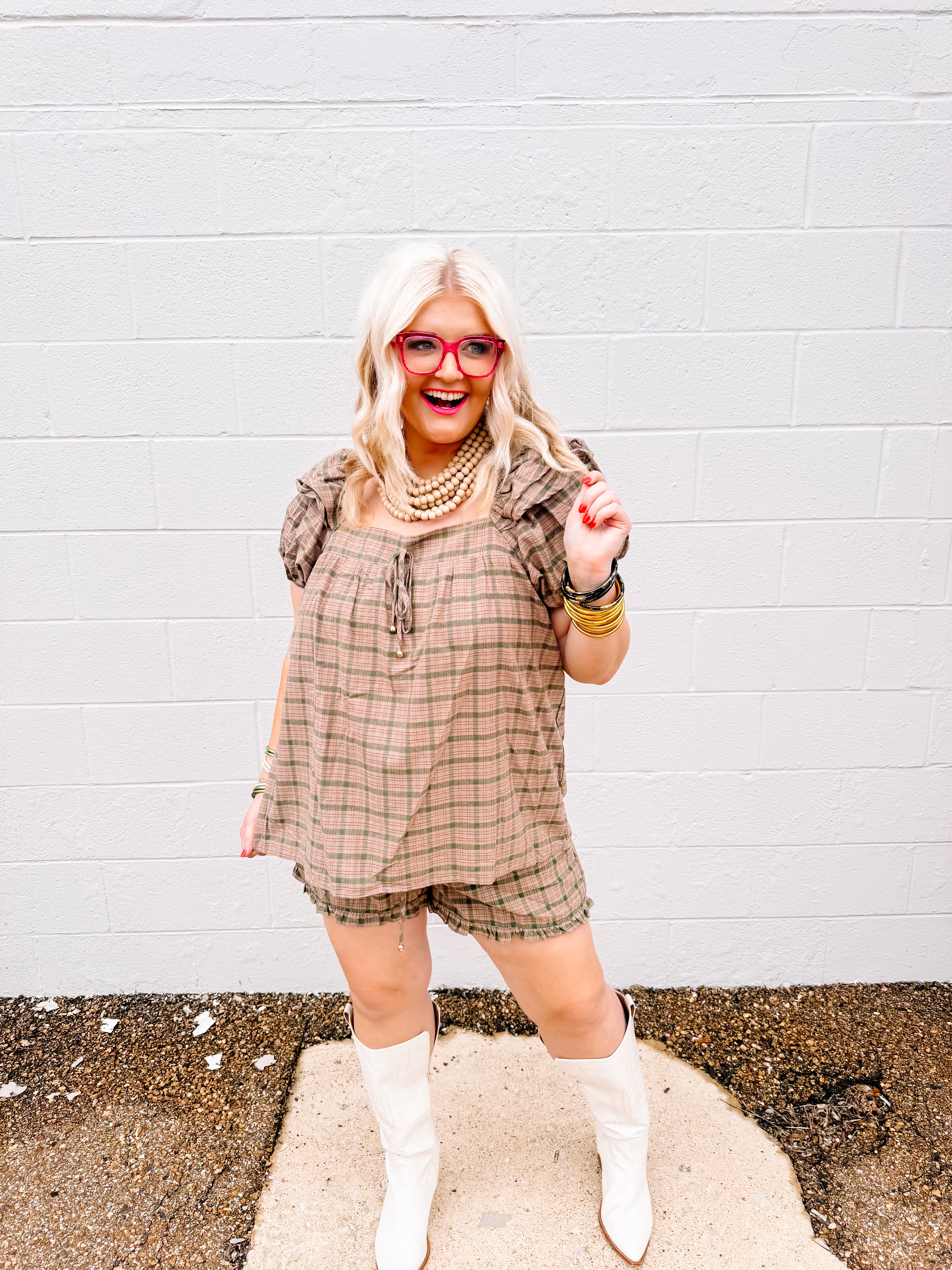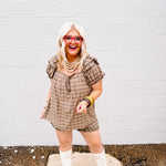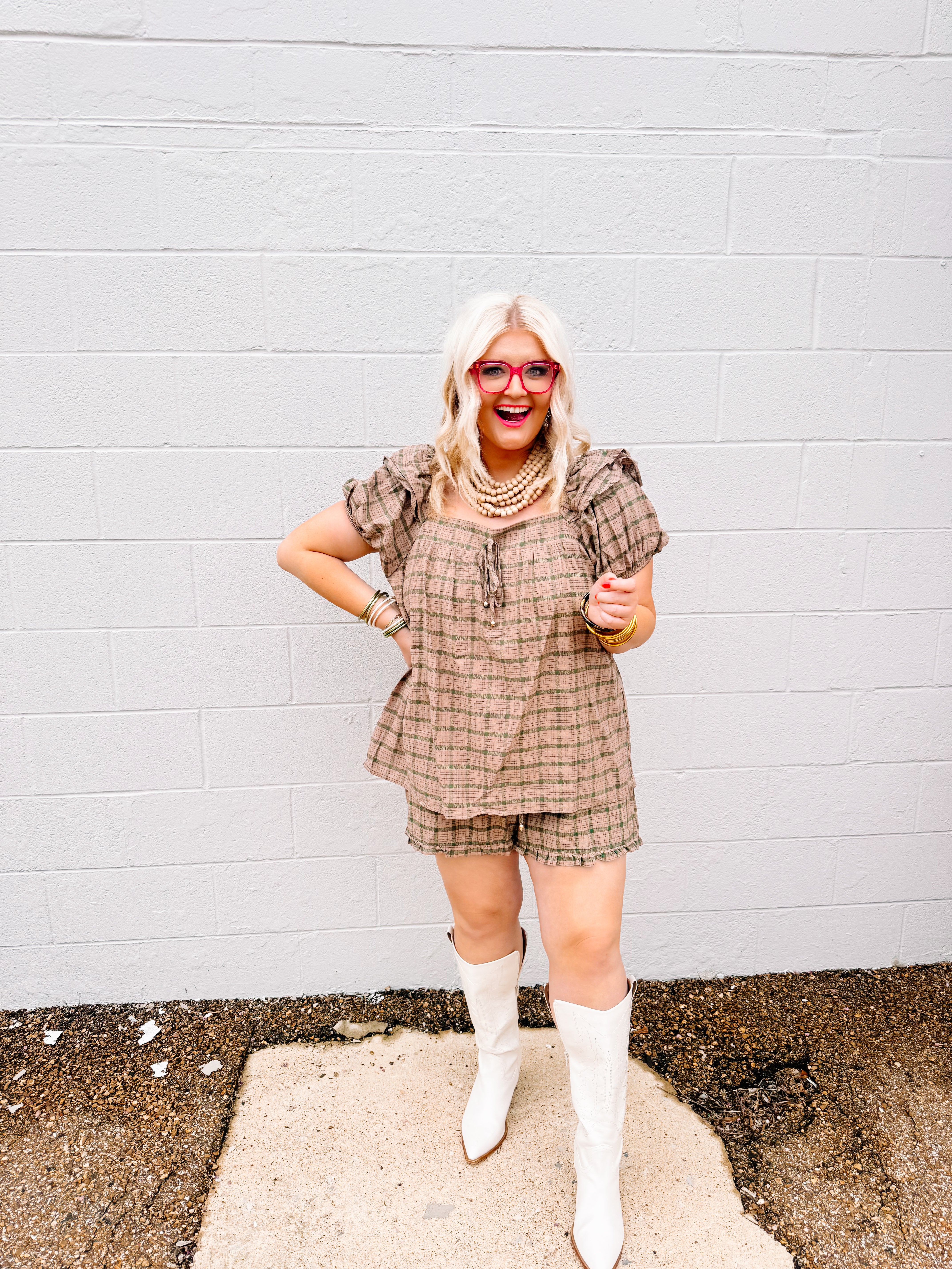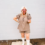 Elevate your casual wardrobe with the Oddi Camel Plaid Set, featuring a plaid puff sleeve top with a gathered front tie detail that adds a refined, feminine touch. The coordinating ruffle-hem shorts complement the top perfectly, creating a cohesive and stylish look. Crafted for comfort and effortless style, this set is ideal for warm-weather outings or relaxed gatherings.