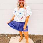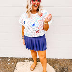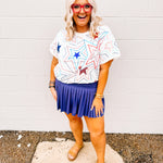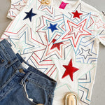 Show off your patriotic pride with our White, Red & Blue Groovy Star Tee! Featuring vibrant red, white, and blue sequin stars, this tee is perfect for Memorial Day or the 4th of July. Plus, it fits true to size. Don't miss out on this festive and stylish addition to your wardrobe!
