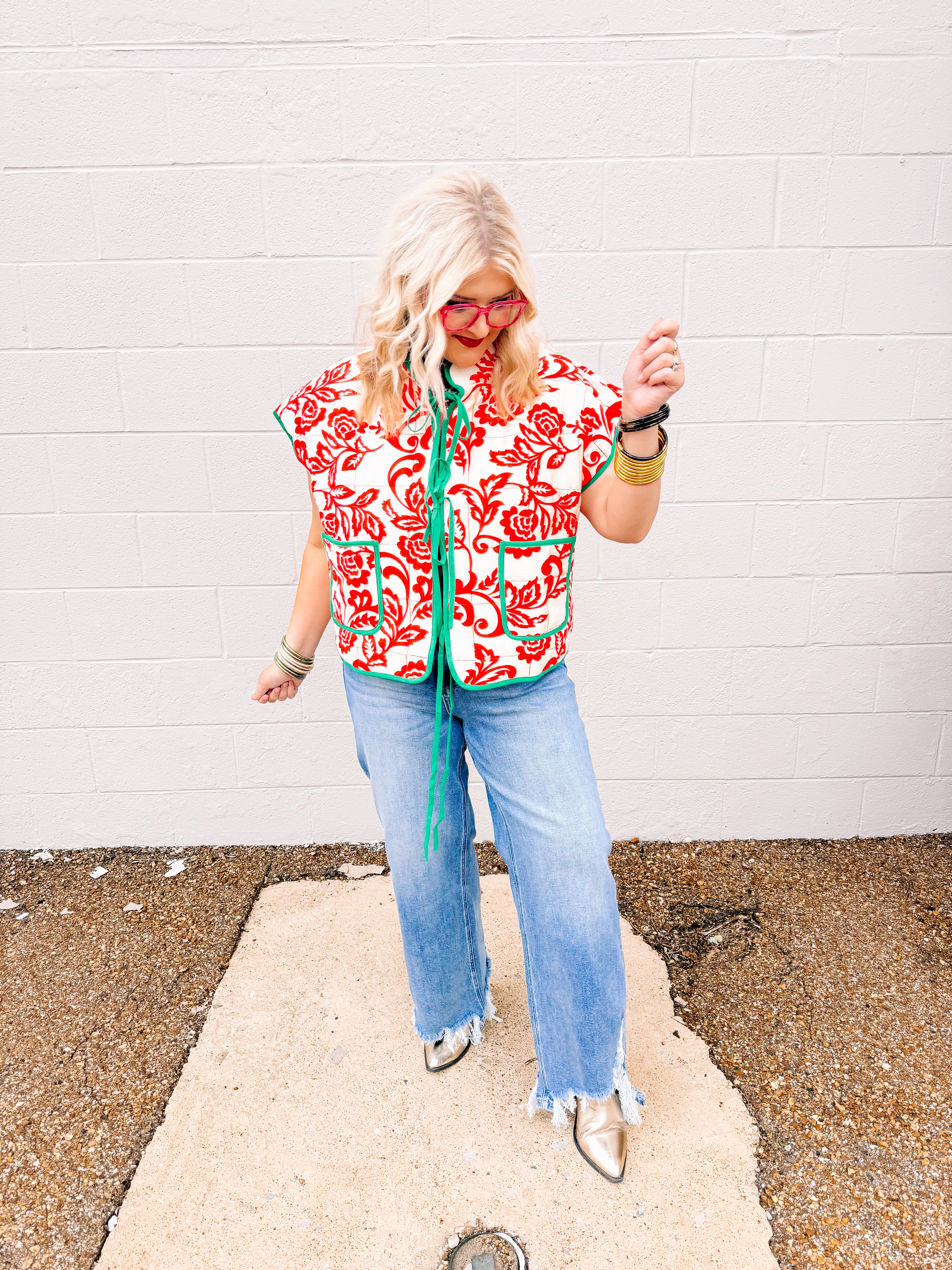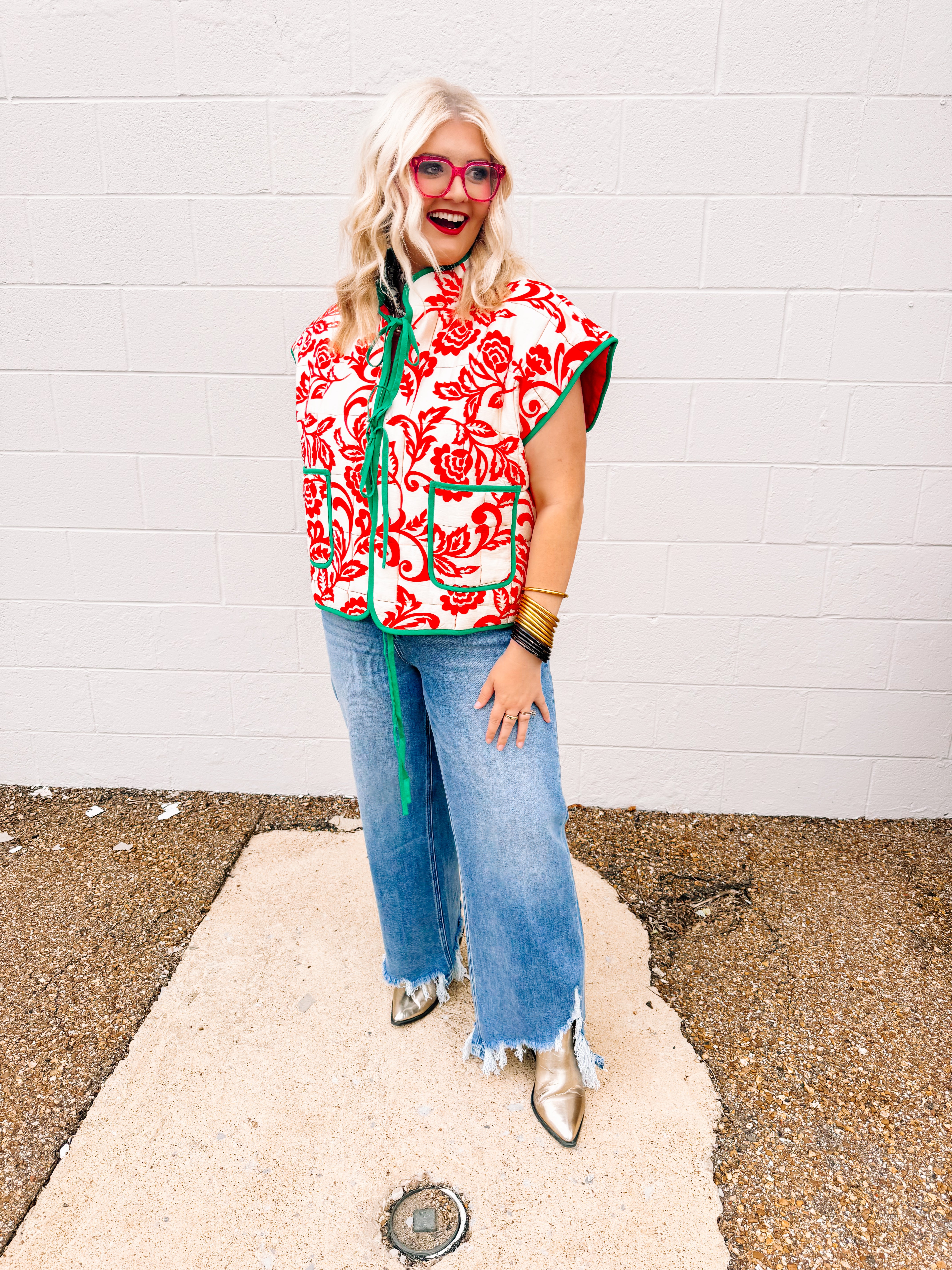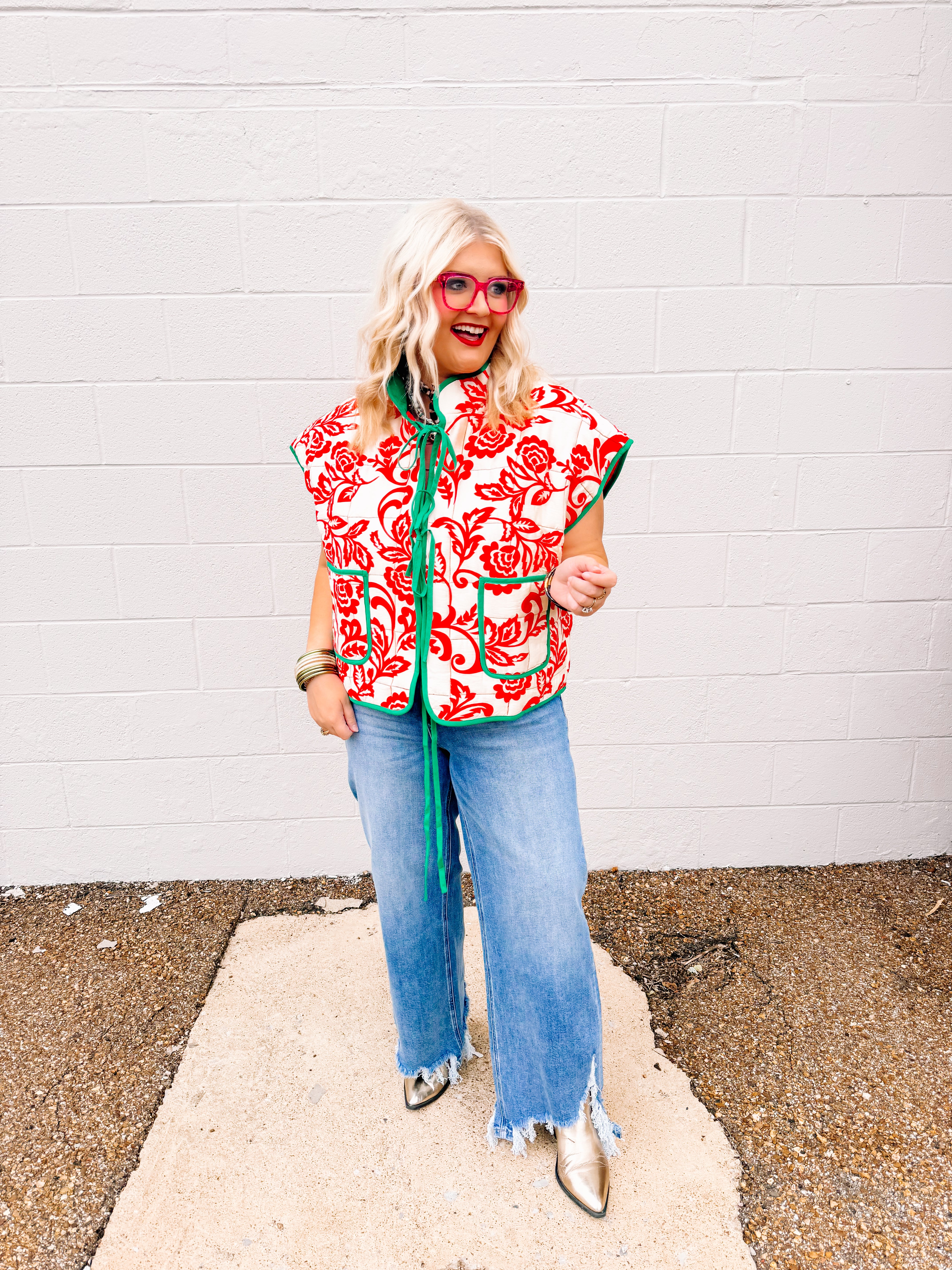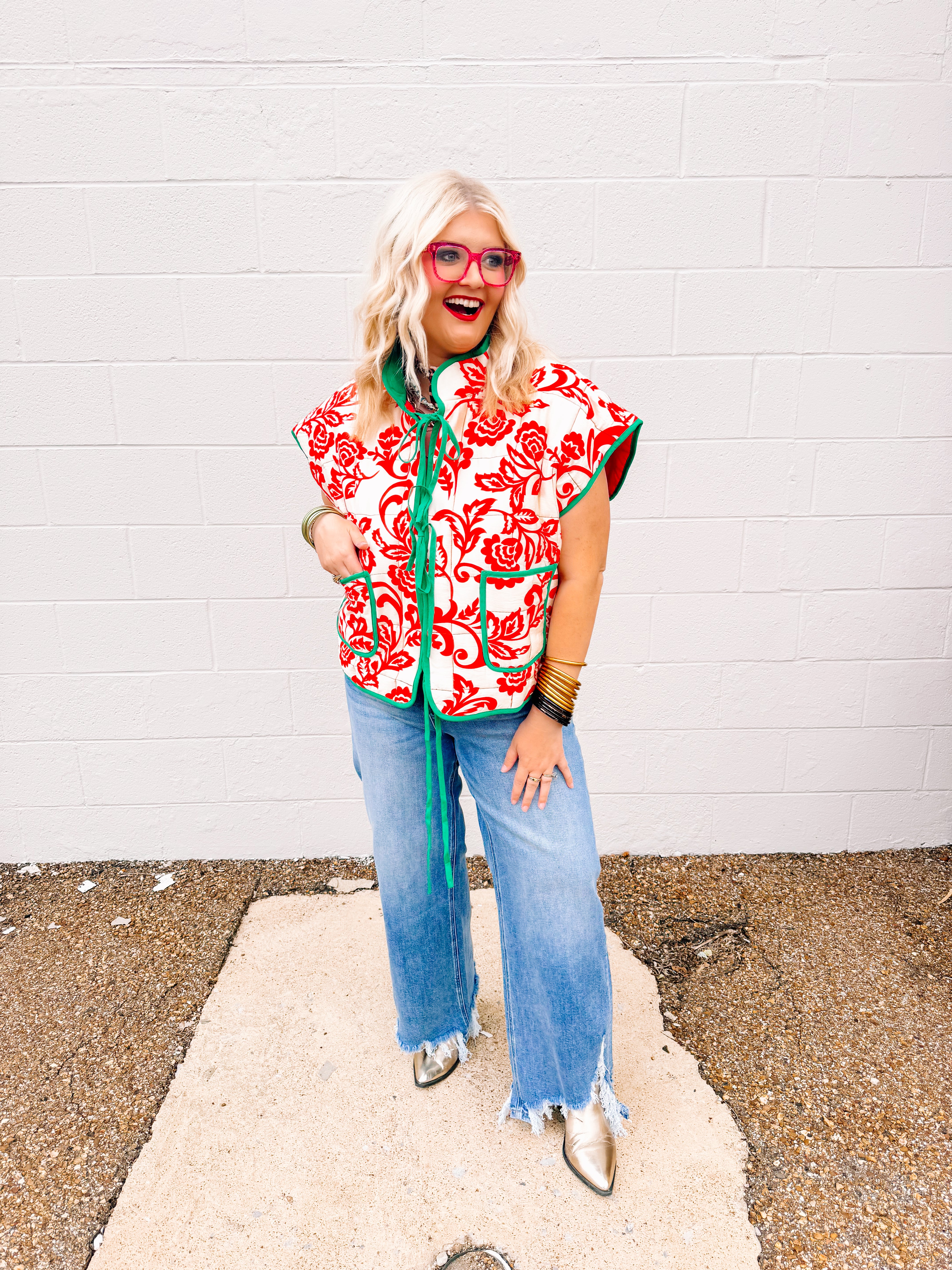 Embrace holiday elegance with the AnnieWear Reversible Christmas Toile Vest, featuring a sophisticated floral printed contrast front tie quilting vest. This unique design combines festive cream and red tones, offering versatile style options perfect for seasonal celebrations. Crafted for comfort and charm, it provides both warmth and a refined touch to your holiday wardrobe.